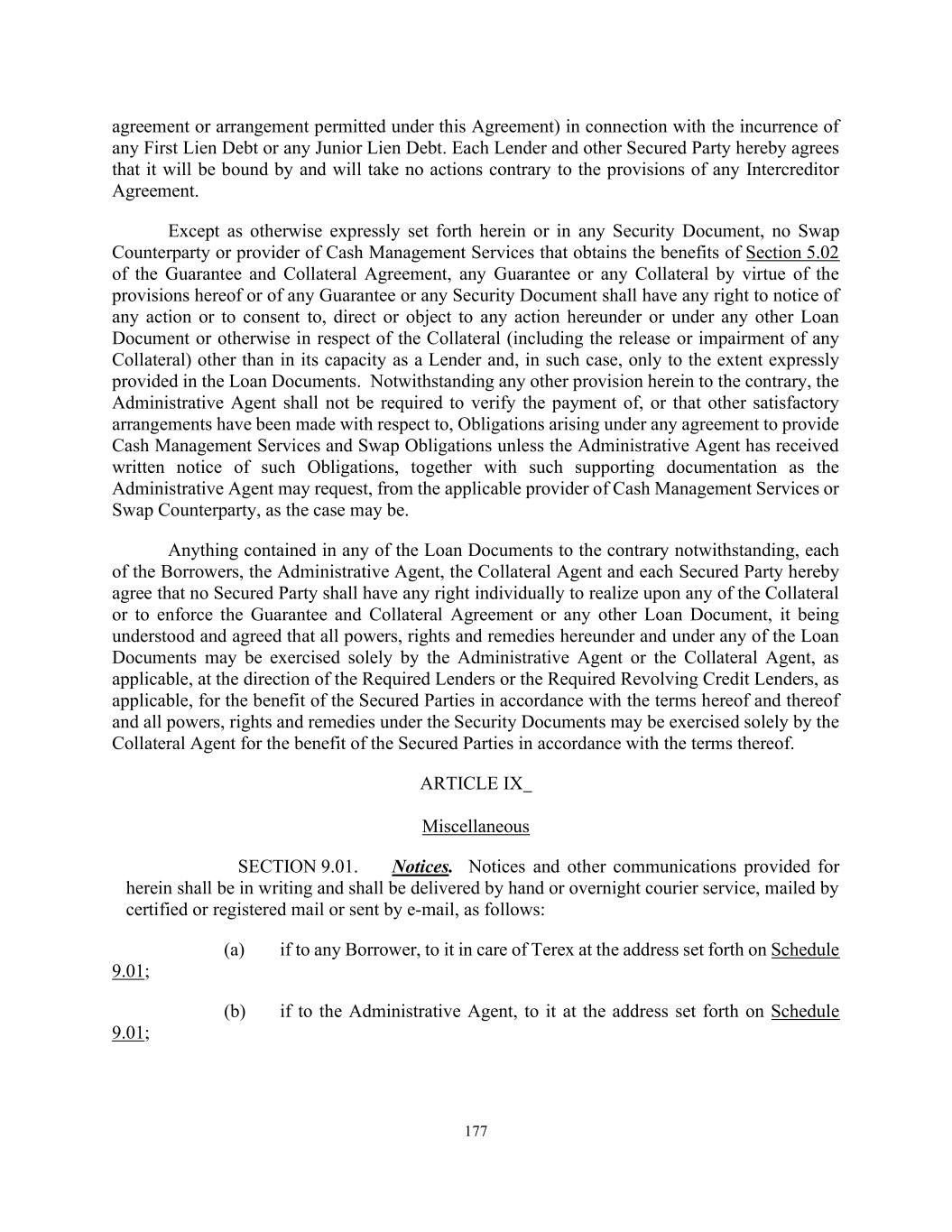 177 agreement or arrangement permitted under this Agreement) in connection with the incurrence of any First Lien Debt or any Junior Lien Debt. Each Lender and other Secured Party hereby agrees that it will be bound by and will take no actions contrary to the provisions of any Intercreditor Agreement. Except as otherwise expressly set forth herein or in any Security Document, no Swap Counterparty or provider of Cash Management Services that obtains the benefits of Section 5.02 of the Guarantee and Collateral Agreement, any Guarantee or any Collateral by virtue of the provisions hereof or of any Guarantee or any Security Document shall have any right to notice of any action or to consent to, direct or object to any action hereunder or under any other Loan Document or otherwise in respect of the Collateral (including the release or impairment of any Collateral) other than in its capacity as a Lender and, in such case, only to the extent expressly provided in the Loan Documents. Notwithstanding any other provision herein to the contrary, the Administrative Agent shall not be required to verify the payment of, or that other satisfactory arrangements have been made with respect to, Obligations arising under any agreement to provide Cash Management Services and Swap Obligations unless the Administrative Agent has received written notice of such Obligations, together with such supporting documentation as the Administrative Agent may request, from the applicable provider of Cash Management Services or Swap Counterparty, as the case may be. Anything contained in any of the Loan Documents to the contrary notwithstanding, each of the Borrowers, the Administrative Agent, the Collateral Agent and each Secured Party hereby agree that no Secured Party shall have any right individually to realize upon any of the Collateral or to enforce the Guarantee and Collateral Agreement or any other Loan Document, it being understood and agreed that all powers, rights and remedies hereunder and under any of the Loan Documents may be exercised solely by the Administrative Agent or the Collateral Agent, as applicable, at the direction of the Required Lenders or the Required Revolving Credit Lenders, as applicable, for the benefit of the Secured Parties in accordance with the terms hereof and thereof and all powers, rights and remedies under the Security Documents may be exercised solely by the Collateral Agent for the benefit of the Secured Parties in accordance with the terms thereof. ARTICLE IX Miscellaneous SECTION 9.01. Notices. Notices and other communications provided for herein shall be in writing and shall be delivered by hand or overnight courier service, mailed by certified or registered mail or sent by e-mail, as follows: (a) if to any Borrower, to it in care of Terex at the address set forth on Schedule 9.01; (b) if to the Administrative Agent, to it at the address set forth on Schedule 9.01;