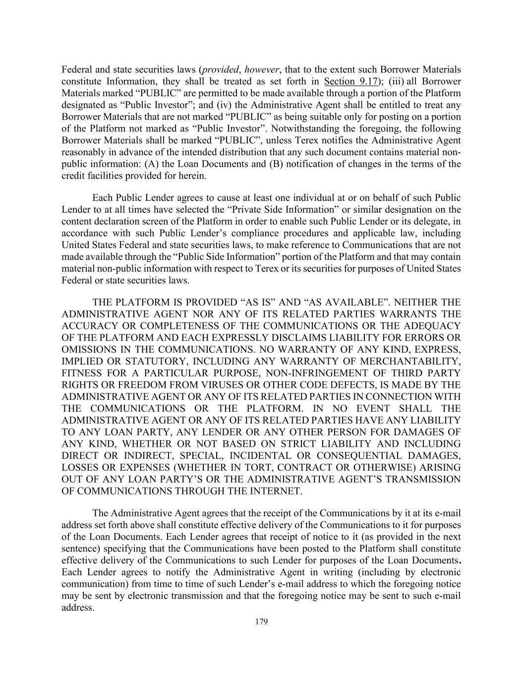 179 Federal and state securities laws (provided, however, that to the extent such Borrower Materials constitute Information, they shall be treated as set forth in Section 9.17); (iii) all Borrower Materials marked “PUBLIC” are permitted to be made available through a portion of the Platform designated as “Public Investor”; and (iv) the Administrative Agent shall be entitled to treat any Borrower Materials that are not marked “PUBLIC” as being suitable only for posting on a portion of the Platform not marked as “Public Investor”. Notwithstanding the foregoing, the following Borrower Materials shall be marked “PUBLIC”, unless Terex notifies the Administrative Agent reasonably in advance of the intended distribution that any such document contains material non- public information: (A) the Loan Documents and (B) notification of changes in the terms of the credit facilities provided for herein. Each Public Lender agrees to cause at least one individual at or on behalf of such Public Lender to at all times have selected the “Private Side Information” or similar designation on the content declaration screen of the Platform in order to enable such Public Lender or its delegate, in accordance with such Public Lender’s compliance procedures and applicable law, including United States Federal and state securities laws, to make reference to Communications that are not made available through the “Public Side Information” portion of the Platform and that may contain material non-public information with respect to Terex or its securities for purposes of United States Federal or state securities laws. THE PLATFORM IS PROVIDED “AS IS” AND “AS AVAILABLE”. NEITHER THE ADMINISTRATIVE AGENT NOR ANY OF ITS RELATED PARTIES WARRANTS THE ACCURACY OR COMPLETENESS OF THE COMMUNICATIONS OR THE ADEQUACY OF THE PLATFORM AND EACH EXPRESSLY DISCLAIMS LIABILITY FOR ERRORS OR OMISSIONS IN THE COMMUNICATIONS. NO WARRANTY OF ANY KIND, EXPRESS, IMPLIED OR STATUTORY, INCLUDING ANY WARRANTY OF MERCHANTABILITY, FITNESS FOR A PARTICULAR PURPOSE, NON-INFRINGEMENT OF THIRD PARTY RIGHTS OR FREEDOM FROM VIRUSES OR OTHER CODE DEFECTS, IS MADE BY THE ADMINISTRATIVE AGENT OR ANY OF ITS RELATED PARTIES IN CONNECTION WITH THE COMMUNICATIONS OR THE PLATFORM. IN NO EVENT SHALL THE ADMINISTRATIVE AGENT OR ANY OF ITS RELATED PARTIES HAVE ANY LIABILITY TO ANY LOAN PARTY, ANY LENDER OR ANY OTHER PERSON FOR DAMAGES OF ANY KIND, WHETHER OR NOT BASED ON STRICT LIABILITY AND INCLUDING DIRECT OR INDIRECT, SPECIAL, INCIDENTAL OR CONSEQUENTIAL DAMAGES, LOSSES OR EXPENSES (WHETHER IN TORT, CONTRACT OR OTHERWISE) ARISING OUT OF ANY LOAN PARTY’S OR THE ADMINISTRATIVE AGENT’S TRANSMISSION OF COMMUNICATIONS THROUGH THE INTERNET. The Administrative Agent agrees that the receipt of the Communications by it at its e-mail address set forth above shall constitute effective delivery of the Communications to it for purposes of the Loan Documents. Each Lender agrees that receipt of notice to it (as provided in the next sentence) specifying that the Communications have been posted to the Platform shall constitute effective delivery of the Communications to such Lender for purposes of the Loan Documents. Each Lender agrees to notify the Administrative Agent in writing (including by electronic communication) from time to time of such Lender’s e-mail address to which the foregoing notice may be sent by electronic transmission and that the foregoing notice may be sent to such e-mail address.
