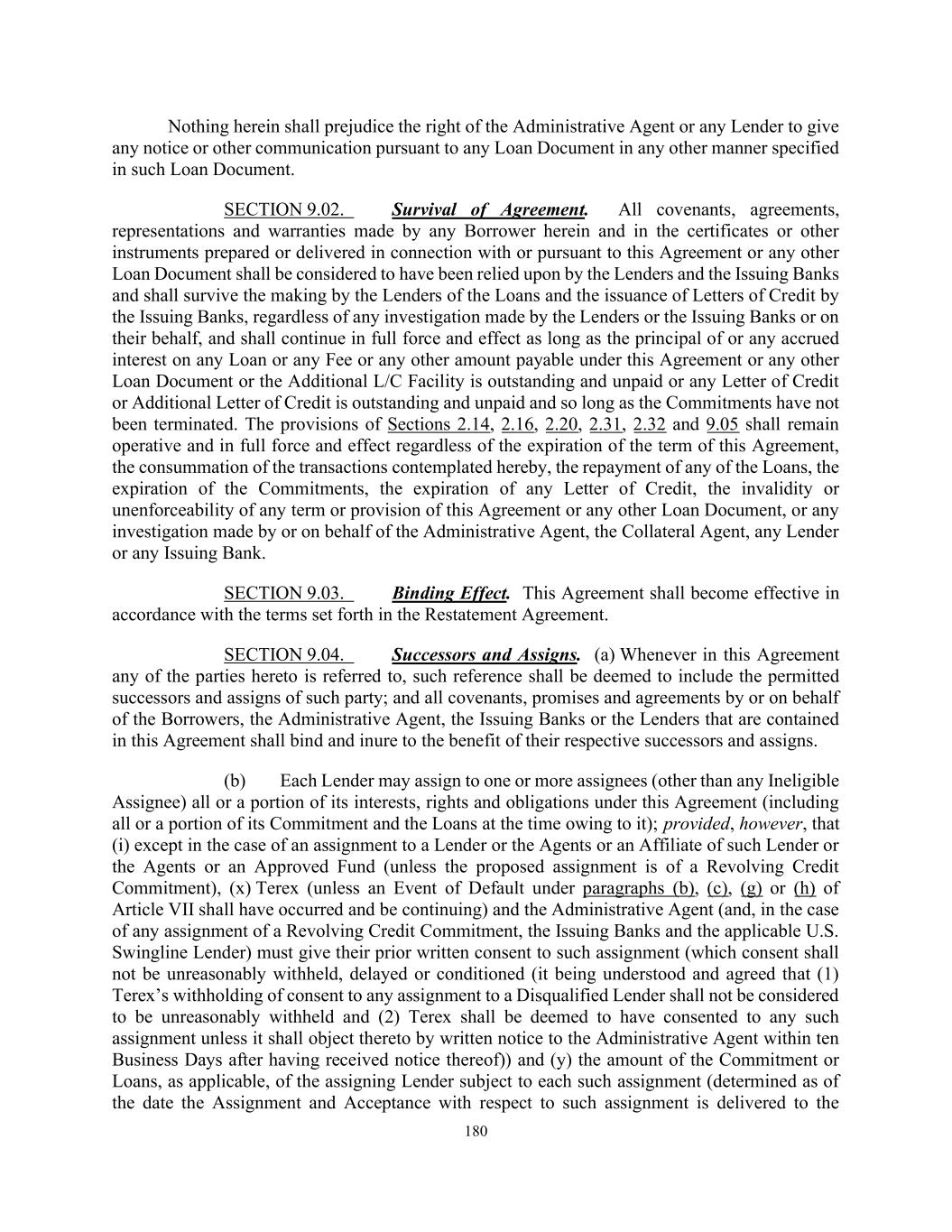 180 Nothing herein shall prejudice the right of the Administrative Agent or any Lender to give any notice or other communication pursuant to any Loan Document in any other manner specified in such Loan Document. SECTION 9.02. Survival of Agreement. All covenants, agreements, representations and warranties made by any Borrower herein and in the certificates or other instruments prepared or delivered in connection with or pursuant to this Agreement or any other Loan Document shall be considered to have been relied upon by the Lenders and the Issuing Banks and shall survive the making by the Lenders of the Loans and the issuance of Letters of Credit by the Issuing Banks, regardless of any investigation made by the Lenders or the Issuing Banks or on their behalf, and shall continue in full force and effect as long as the principal of or any accrued interest on any Loan or any Fee or any other amount payable under this Agreement or any other Loan Document or the Additional L/C Facility is outstanding and unpaid or any Letter of Credit or Additional Letter of Credit is outstanding and unpaid and so long as the Commitments have not been terminated. The provisions of Sections 2.14, 2.16, 2.20, 2.31, 2.32 and 9.05 shall remain operative and in full force and effect regardless of the expiration of the term of this Agreement, the consummation of the transactions contemplated hereby, the repayment of any of the Loans, the expiration of the Commitments, the expiration of any Letter of Credit, the invalidity or unenforceability of any term or provision of this Agreement or any other Loan Document, or any investigation made by or on behalf of the Administrative Agent, the Collateral Agent, any Lender or any Issuing Bank. SECTION 9.03. Binding Effect. This Agreement shall become effective in accordance with the terms set forth in the Restatement Agreement. SECTION 9.04. Successors and Assigns. (a) Whenever in this Agreement any of the parties hereto is referred to, such reference shall be deemed to include the permitted successors and assigns of such party; and all covenants, promises and agreements by or on behalf of the Borrowers, the Administrative Agent, the Issuing Banks or the Lenders that are contained in this Agreement shall bind and inure to the benefit of their respective successors and assigns. (b) Each Lender may assign to one or more assignees (other than any Ineligible Assignee) all or a portion of its interests, rights and obligations under this Agreement (including all or a portion of its Commitment and the Loans at the time owing to it); provided, however, that (i) except in the case of an assignment to a Lender or the Agents or an Affiliate of such Lender or the Agents or an Approved Fund (unless the proposed assignment is of a Revolving Credit Commitment), (x) Terex (unless an Event of Default under paragraphs (b), (c), (g) or (h) of Article VII shall have occurred and be continuing) and the Administrative Agent (and, in the case of any assignment of a Revolving Credit Commitment, the Issuing Banks and the applicable U.S. Swingline Lender) must give their prior written consent to such assignment (which consent shall not be unreasonably withheld, delayed or conditioned (it being understood and agreed that (1) Terex’s withholding of consent to any assignment to a Disqualified Lender shall not be considered to be unreasonably withheld and (2) Terex shall be deemed to have consented to any such assignment unless it shall object thereto by written notice to the Administrative Agent within ten Business Days after having received notice thereof)) and (y) the amount of the Commitment or Loans, as applicable, of the assigning Lender subject to each such assignment (determined as of the date the Assignment and Acceptance with respect to such assignment is delivered to the