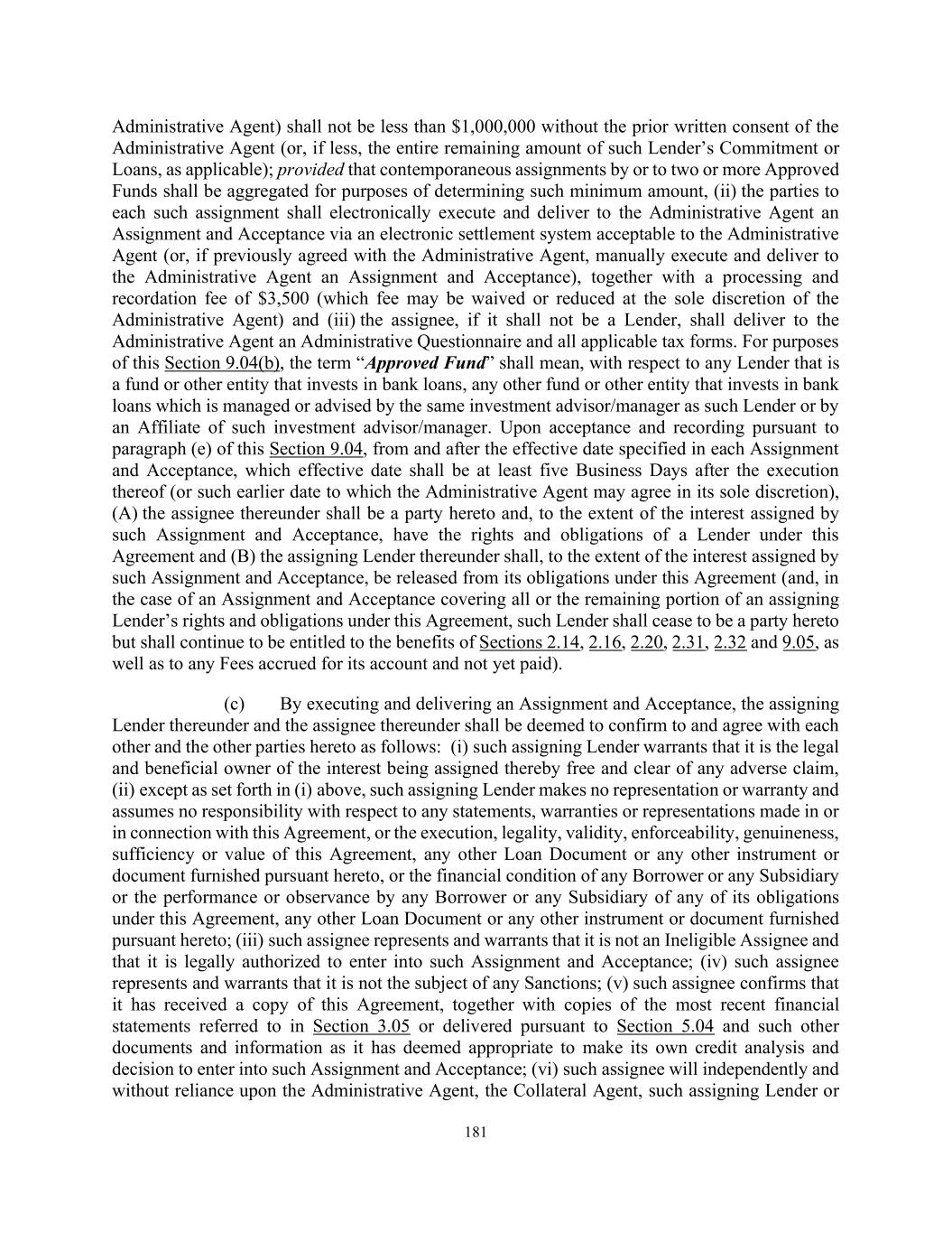 181 Administrative Agent) shall not be less than $1,000,000 without the prior written consent of the Administrative Agent (or, if less, the entire remaining amount of such Lender’s Commitment or Loans, as applicable); provided that contemporaneous assignments by or to two or more Approved Funds shall be aggregated for purposes of determining such minimum amount, (ii) the parties to each such assignment shall electronically execute and deliver to the Administrative Agent an Assignment and Acceptance via an electronic settlement system acceptable to the Administrative Agent (or, if previously agreed with the Administrative Agent, manually execute and deliver to the Administrative Agent an Assignment and Acceptance), together with a processing and recordation fee of $3,500 (which fee may be waived or reduced at the sole discretion of the Administrative Agent) and (iii) the assignee, if it shall not be a Lender, shall deliver to the Administrative Agent an Administrative Questionnaire and all applicable tax forms. For purposes of this Section 9.04(b), the term “Approved Fund” shall mean, with respect to any Lender that is a fund or other entity that invests in bank loans, any other fund or other entity that invests in bank loans which is managed or advised by the same investment advisor/manager as such Lender or by an Affiliate of such investment advisor/manager. Upon acceptance and recording pursuant to paragraph (e) of this Section 9.04, from and after the effective date specified in each Assignment and Acceptance, which effective date shall be at least five Business Days after the execution thereof (or such earlier date to which the Administrative Agent may agree in its sole discretion), (A) the assignee thereunder shall be a party hereto and, to the extent of the interest assigned by such Assignment and Acceptance, have the rights and obligations of a Lender under this Agreement and (B) the assigning Lender thereunder shall, to the extent of the interest assigned by such Assignment and Acceptance, be released from its obligations under this Agreement (and, in the case of an Assignment and Acceptance covering all or the remaining portion of an assigning Lender’s rights and obligations under this Agreement, such Lender shall cease to be a party hereto but shall continue to be entitled to the benefits of Sections 2.14, 2.16, 2.20, 2.31, 2.32 and 9.05, as well as to any Fees accrued for its account and not yet paid). (c) By executing and delivering an Assignment and Acceptance, the assigning Lender thereunder and the assignee thereunder shall be deemed to confirm to and agree with each other and the other parties hereto as follows: (i) such assigning Lender warrants that it is the legal and beneficial owner of the interest being assigned thereby free and clear of any adverse claim, (ii) except as set forth in (i) above, such assigning Lender makes no representation or warranty and assumes no responsibility with respect to any statements, warranties or representations made in or in connection with this Agreement, or the execution, legality, validity, enforceability, genuineness, sufficiency or value of this Agreement, any other Loan Document or any other instrument or document furnished pursuant hereto, or the financial condition of any Borrower or any Subsidiary or the performance or observance by any Borrower or any Subsidiary of any of its obligations under this Agreement, any other Loan Document or any other instrument or document furnished pursuant hereto; (iii) such assignee represents and warrants that it is not an Ineligible Assignee and that it is legally authorized to enter into such Assignment and Acceptance; (iv) such assignee represents and warrants that it is not the subject of any Sanctions; (v) such assignee confirms that it has received a copy of this Agreement, together with copies of the most recent financial statements referred to in Section 3.05 or delivered pursuant to Section 5.04 and such other documents and information as it has deemed appropriate to make its own credit analysis and decision to enter into such Assignment and Acceptance; (vi) such assignee will independently and without reliance upon the Administrative Agent, the Collateral Agent, such assigning Lender or