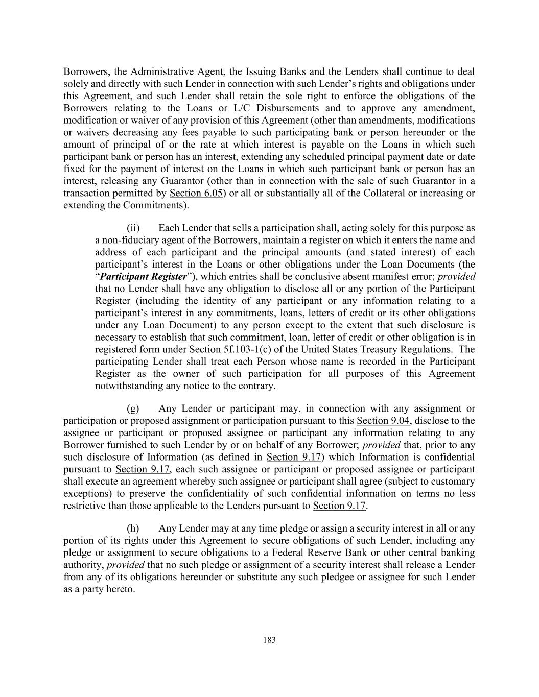 183 Borrowers, the Administrative Agent, the Issuing Banks and the Lenders shall continue to deal solely and directly with such Lender in connection with such Lender’s rights and obligations under this Agreement, and such Lender shall retain the sole right to enforce the obligations of the Borrowers relating to the Loans or L/C Disbursements and to approve any amendment, modification or waiver of any provision of this Agreement (other than amendments, modifications or waivers decreasing any fees payable to such participating bank or person hereunder or the amount of principal of or the rate at which interest is payable on the Loans in which such participant bank or person has an interest, extending any scheduled principal payment date or date fixed for the payment of interest on the Loans in which such participant bank or person has an interest, releasing any Guarantor (other than in connection with the sale of such Guarantor in a transaction permitted by Section 6.05) or all or substantially all of the Collateral or increasing or extending the Commitments). (ii) Each Lender that sells a participation shall, acting solely for this purpose as a non-fiduciary agent of the Borrowers, maintain a register on which it enters the name and address of each participant and the principal amounts (and stated interest) of each participant’s interest in the Loans or other obligations under the Loan Documents (the “Participant Register”), which entries shall be conclusive absent manifest error; provided that no Lender shall have any obligation to disclose all or any portion of the Participant Register (including the identity of any participant or any information relating to a participant’s interest in any commitments, loans, letters of credit or its other obligations under any Loan Document) to any person except to the extent that such disclosure is necessary to establish that such commitment, loan, letter of credit or other obligation is in registered form under Section 5f.103-1(c) of the United States Treasury Regulations. The participating Lender shall treat each Person whose name is recorded in the Participant Register as the owner of such participation for all purposes of this Agreement notwithstanding any notice to the contrary. (g) Any Lender or participant may, in connection with any assignment or participation or proposed assignment or participation pursuant to this Section 9.04, disclose to the assignee or participant or proposed assignee or participant any information relating to any Borrower furnished to such Lender by or on behalf of any Borrower; provided that, prior to any such disclosure of Information (as defined in Section 9.17) which Information is confidential pursuant to Section 9.17, each such assignee or participant or proposed assignee or participant shall execute an agreement whereby such assignee or participant shall agree (subject to customary exceptions) to preserve the confidentiality of such confidential information on terms no less restrictive than those applicable to the Lenders pursuant to Section 9.17. (h) Any Lender may at any time pledge or assign a security interest in all or any portion of its rights under this Agreement to secure obligations of such Lender, including any pledge or assignment to secure obligations to a Federal Reserve Bank or other central banking authority, provided that no such pledge or assignment of a security interest shall release a Lender from any of its obligations hereunder or substitute any such pledgee or assignee for such Lender as a party hereto.
