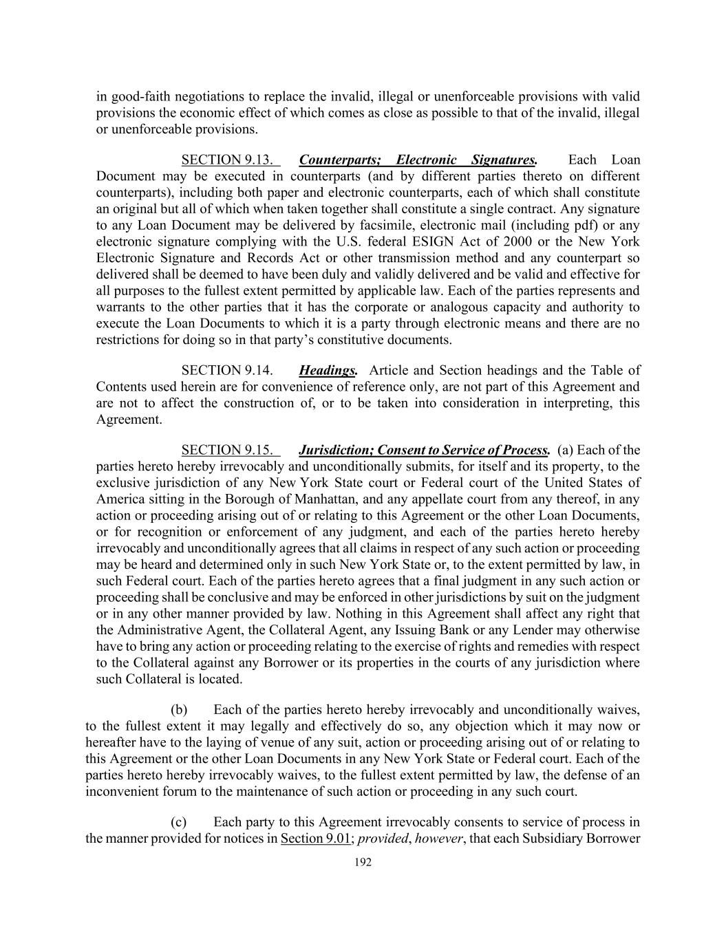 192 in good-faith negotiations to replace the invalid, illegal or unenforceable provisions with valid provisions the economic effect of which comes as close as possible to that of the invalid, illegal or unenforceable provisions. SECTION 9.13. Counterparts; Electronic Signatures. Each Loan Document may be executed in counterparts (and by different parties thereto on different counterparts), including both paper and electronic counterparts, each of which shall constitute an original but all of which when taken together shall constitute a single contract. Any signature to any Loan Document may be delivered by facsimile, electronic mail (including pdf) or any electronic signature complying with the U.S. federal ESIGN Act of 2000 or the New York Electronic Signature and Records Act or other transmission method and any counterpart so delivered shall be deemed to have been duly and validly delivered and be valid and effective for all purposes to the fullest extent permitted by applicable law. Each of the parties represents and warrants to the other parties that it has the corporate or analogous capacity and authority to execute the Loan Documents to which it is a party through electronic means and there are no restrictions for doing so in that party’s constitutive documents. SECTION 9.14. Headings. Article and Section headings and the Table of Contents used herein are for convenience of reference only, are not part of this Agreement and are not to affect the construction of, or to be taken into consideration in interpreting, this Agreement. SECTION 9.15. Jurisdiction; Consent to Service of Process. (a) Each of the parties hereto hereby irrevocably and unconditionally submits, for itself and its property, to the exclusive jurisdiction of any New York State court or Federal court of the United States of America sitting in the Borough of Manhattan, and any appellate court from any thereof, in any action or proceeding arising out of or relating to this Agreement or the other Loan Documents, or for recognition or enforcement of any judgment, and each of the parties hereto hereby irrevocably and unconditionally agrees that all claims in respect of any such action or proceeding may be heard and determined only in such New York State or, to the extent permitted by law, in such Federal court. Each of the parties hereto agrees that a final judgment in any such action or proceeding shall be conclusive and may be enforced in other jurisdictions by suit on the judgment or in any other manner provided by law. Nothing in this Agreement shall affect any right that the Administrative Agent, the Collateral Agent, any Issuing Bank or any Lender may otherwise have to bring any action or proceeding relating to the exercise of rights and remedies with respect to the Collateral against any Borrower or its properties in the courts of any jurisdiction where such Collateral is located. (b) Each of the parties hereto hereby irrevocably and unconditionally waives, to the fullest extent it may legally and effectively do so, any objection which it may now or hereafter have to the laying of venue of any suit, action or proceeding arising out of or relating to this Agreement or the other Loan Documents in any New York State or Federal court. Each of the parties hereto hereby irrevocably waives, to the fullest extent permitted by law, the defense of an inconvenient forum to the maintenance of such action or proceeding in any such court. (c) Each party to this Agreement irrevocably consents to service of process in the manner provided for notices in Section 9.01; provided, however, that each Subsidiary Borrower
