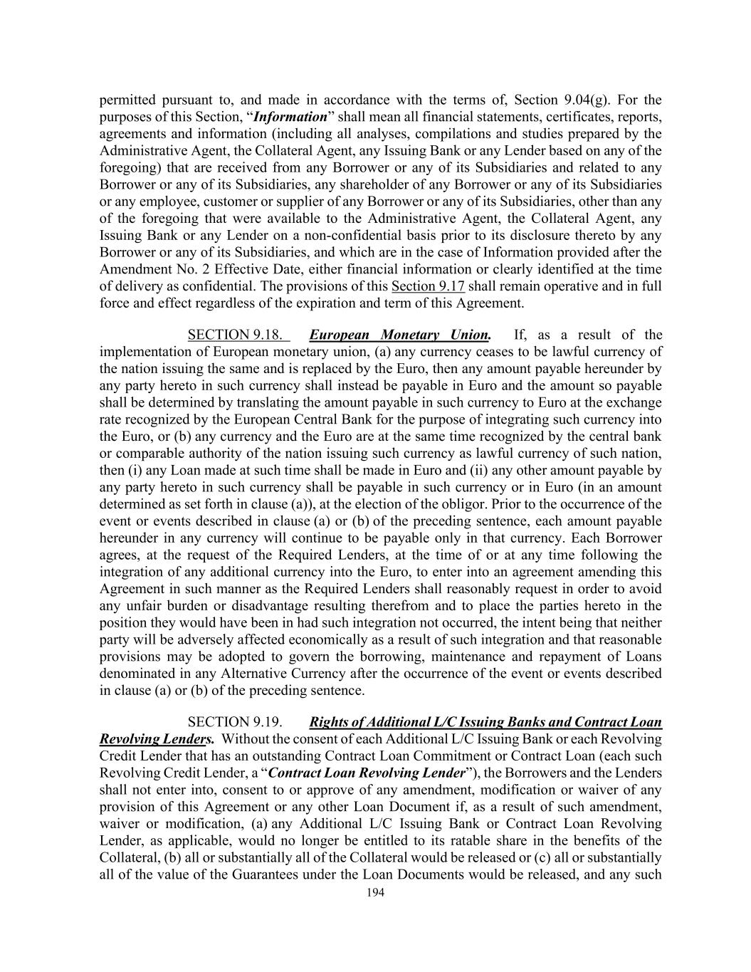 194 permitted pursuant to, and made in accordance with the terms of, Section 9.04(g). For the purposes of this Section, “Information” shall mean all financial statements, certificates, reports, agreements and information (including all analyses, compilations and studies prepared by the Administrative Agent, the Collateral Agent, any Issuing Bank or any Lender based on any of the foregoing) that are received from any Borrower or any of its Subsidiaries and related to any Borrower or any of its Subsidiaries, any shareholder of any Borrower or any of its Subsidiaries or any employee, customer or supplier of any Borrower or any of its Subsidiaries, other than any of the foregoing that were available to the Administrative Agent, the Collateral Agent, any Issuing Bank or any Lender on a non-confidential basis prior to its disclosure thereto by any Borrower or any of its Subsidiaries, and which are in the case of Information provided after the Amendment No. 2 Effective Date, either financial information or clearly identified at the time of delivery as confidential. The provisions of this Section 9.17 shall remain operative and in full force and effect regardless of the expiration and term of this Agreement. SECTION 9.18. European Monetary Union. If, as a result of the implementation of European monetary union, (a) any currency ceases to be lawful currency of the nation issuing the same and is replaced by the Euro, then any amount payable hereunder by any party hereto in such currency shall instead be payable in Euro and the amount so payable shall be determined by translating the amount payable in such currency to Euro at the exchange rate recognized by the European Central Bank for the purpose of integrating such currency into the Euro, or (b) any currency and the Euro are at the same time recognized by the central bank or comparable authority of the nation issuing such currency as lawful currency of such nation, then (i) any Loan made at such time shall be made in Euro and (ii) any other amount payable by any party hereto in such currency shall be payable in such currency or in Euro (in an amount determined as set forth in clause (a)), at the election of the obligor. Prior to the occurrence of the event or events described in clause (a) or (b) of the preceding sentence, each amount payable hereunder in any currency will continue to be payable only in that currency. Each Borrower agrees, at the request of the Required Lenders, at the time of or at any time following the integration of any additional currency into the Euro, to enter into an agreement amending this Agreement in such manner as the Required Lenders shall reasonably request in order to avoid any unfair burden or disadvantage resulting therefrom and to place the parties hereto in the position they would have been in had such integration not occurred, the intent being that neither party will be adversely affected economically as a result of such integration and that reasonable provisions may be adopted to govern the borrowing, maintenance and repayment of Loans denominated in any Alternative Currency after the occurrence of the event or events described in clause (a) or (b) of the preceding sentence. SECTION 9.19. Rights of Additional L/C Issuing Banks and Contract Loan Revolving Lenders. Without the consent of each Additional L/C Issuing Bank or each Revolving Credit Lender that has an outstanding Contract Loan Commitment or Contract Loan (each such Revolving Credit Lender, a “Contract Loan Revolving Lender”), the Borrowers and the Lenders shall not enter into, consent to or approve of any amendment, modification or waiver of any provision of this Agreement or any other Loan Document if, as a result of such amendment, waiver or modification, (a) any Additional L/C Issuing Bank or Contract Loan Revolving Lender, as applicable, would no longer be entitled to its ratable share in the benefits of the Collateral, (b) all or substantially all of the Collateral would be released or (c) all or substantially all of the value of the Guarantees under the Loan Documents would be released, and any such