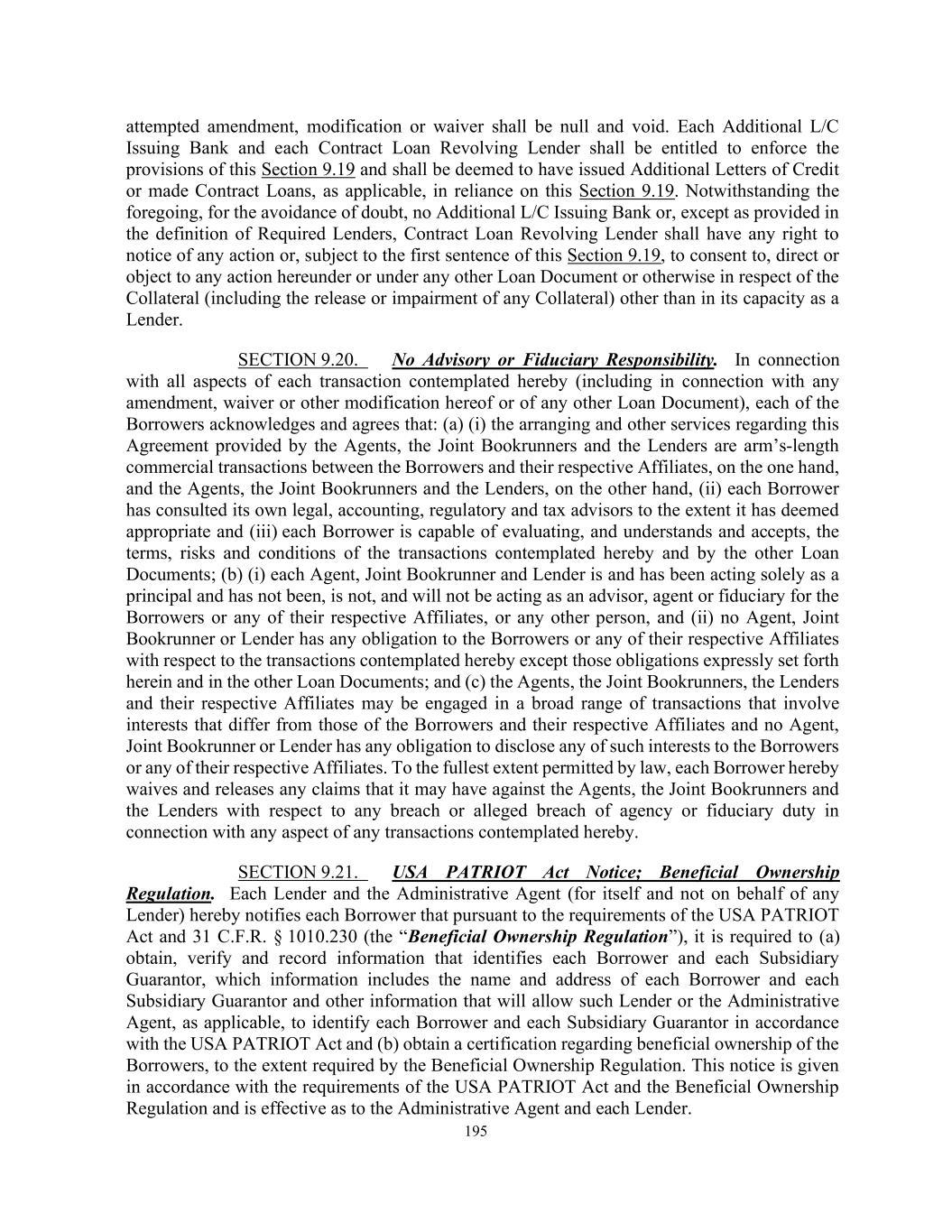 195 attempted amendment, modification or waiver shall be null and void. Each Additional L/C Issuing Bank and each Contract Loan Revolving Lender shall be entitled to enforce the provisions of this Section 9.19 and shall be deemed to have issued Additional Letters of Credit or made Contract Loans, as applicable, in reliance on this Section 9.19. Notwithstanding the foregoing, for the avoidance of doubt, no Additional L/C Issuing Bank or, except as provided in the definition of Required Lenders, Contract Loan Revolving Lender shall have any right to notice of any action or, subject to the first sentence of this Section 9.19, to consent to, direct or object to any action hereunder or under any other Loan Document or otherwise in respect of the Collateral (including the release or impairment of any Collateral) other than in its capacity as a Lender. SECTION 9.20. No Advisory or Fiduciary Responsibility. In connection with all aspects of each transaction contemplated hereby (including in connection with any amendment, waiver or other modification hereof or of any other Loan Document), each of the Borrowers acknowledges and agrees that: (a) (i) the arranging and other services regarding this Agreement provided by the Agents, the Joint Bookrunners and the Lenders are arm’s-length commercial transactions between the Borrowers and their respective Affiliates, on the one hand, and the Agents, the Joint Bookrunners and the Lenders, on the other hand, (ii) each Borrower has consulted its own legal, accounting, regulatory and tax advisors to the extent it has deemed appropriate and (iii) each Borrower is capable of evaluating, and understands and accepts, the terms, risks and conditions of the transactions contemplated hereby and by the other Loan Documents; (b) (i) each Agent, Joint Bookrunner and Lender is and has been acting solely as a principal and has not been, is not, and will not be acting as an advisor, agent or fiduciary for the Borrowers or any of their respective Affiliates, or any other person, and (ii) no Agent, Joint Bookrunner or Lender has any obligation to the Borrowers or any of their respective Affiliates with respect to the transactions contemplated hereby except those obligations expressly set forth herein and in the other Loan Documents; and (c) the Agents, the Joint Bookrunners, the Lenders and their respective Affiliates may be engaged in a broad range of transactions that involve interests that differ from those of the Borrowers and their respective Affiliates and no Agent, Joint Bookrunner or Lender has any obligation to disclose any of such interests to the Borrowers or any of their respective Affiliates. To the fullest extent permitted by law, each Borrower hereby waives and releases any claims that it may have against the Agents, the Joint Bookrunners and the Lenders with respect to any breach or alleged breach of agency or fiduciary duty in connection with any aspect of any transactions contemplated hereby. SECTION 9.21. USA PATRIOT Act Notice; Beneficial Ownership Regulation. Each Lender and the Administrative Agent (for itself and not on behalf of any Lender) hereby notifies each Borrower that pursuant to the requirements of the USA PATRIOT Act and 31 C.F.R. § 1010.230 (the “Beneficial Ownership Regulation”), it is required to (a) obtain, verify and record information that identifies each Borrower and each Subsidiary Guarantor, which information includes the name and address of each Borrower and each Subsidiary Guarantor and other information that will allow such Lender or the Administrative Agent, as applicable, to identify each Borrower and each Subsidiary Guarantor in accordance with the USA PATRIOT Act and (b) obtain a certification regarding beneficial ownership of the Borrowers, to the extent required by the Beneficial Ownership Regulation. This notice is given in accordance with the requirements of the USA PATRIOT Act and the Beneficial Ownership Regulation and is effective as to the Administrative Agent and each Lender.