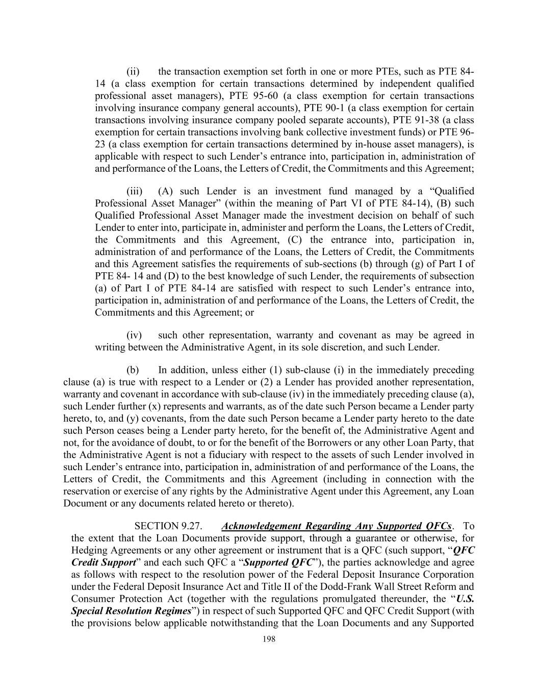 198 (ii) the transaction exemption set forth in one or more PTEs, such as PTE 84- 14 (a class exemption for certain transactions determined by independent qualified professional asset managers), PTE 95-60 (a class exemption for certain transactions involving insurance company general accounts), PTE 90-1 (a class exemption for certain transactions involving insurance company pooled separate accounts), PTE 91-38 (a class exemption for certain transactions involving bank collective investment funds) or PTE 96- 23 (a class exemption for certain transactions determined by in-house asset managers), is applicable with respect to such Lender’s entrance into, participation in, administration of and performance of the Loans, the Letters of Credit, the Commitments and this Agreement; (iii) (A) such Lender is an investment fund managed by a “Qualified Professional Asset Manager” (within the meaning of Part VI of PTE 84-14), (B) such Qualified Professional Asset Manager made the investment decision on behalf of such Lender to enter into, participate in, administer and perform the Loans, the Letters of Credit, the Commitments and this Agreement, (C) the entrance into, participation in, administration of and performance of the Loans, the Letters of Credit, the Commitments and this Agreement satisfies the requirements of sub-sections (b) through (g) of Part I of PTE 84- 14 and (D) to the best knowledge of such Lender, the requirements of subsection (a) of Part I of PTE 84-14 are satisfied with respect to such Lender’s entrance into, participation in, administration of and performance of the Loans, the Letters of Credit, the Commitments and this Agreement; or (iv) such other representation, warranty and covenant as may be agreed in writing between the Administrative Agent, in its sole discretion, and such Lender. (b) In addition, unless either (1) sub-clause (i) in the immediately preceding clause (a) is true with respect to a Lender or (2) a Lender has provided another representation, warranty and covenant in accordance with sub-clause (iv) in the immediately preceding clause (a), such Lender further (x) represents and warrants, as of the date such Person became a Lender party hereto, to, and (y) covenants, from the date such Person became a Lender party hereto to the date such Person ceases being a Lender party hereto, for the benefit of, the Administrative Agent and not, for the avoidance of doubt, to or for the benefit of the Borrowers or any other Loan Party, that the Administrative Agent is not a fiduciary with respect to the assets of such Lender involved in such Lender’s entrance into, participation in, administration of and performance of the Loans, the Letters of Credit, the Commitments and this Agreement (including in connection with the reservation or exercise of any rights by the Administrative Agent under this Agreement, any Loan Document or any documents related hereto or thereto). SECTION 9.27. Acknowledgement Regarding Any Supported QFCs. To the extent that the Loan Documents provide support, through a guarantee or otherwise, for Hedging Agreements or any other agreement or instrument that is a QFC (such support, “QFC Credit Support” and each such QFC a “Supported QFC”), the parties acknowledge and agree as follows with respect to the resolution power of the Federal Deposit Insurance Corporation under the Federal Deposit Insurance Act and Title II of the Dodd-Frank Wall Street Reform and Consumer Protection Act (together with the regulations promulgated thereunder, the “U.S. Special Resolution Regimes”) in respect of such Supported QFC and QFC Credit Support (with the provisions below applicable notwithstanding that the Loan Documents and any Supported