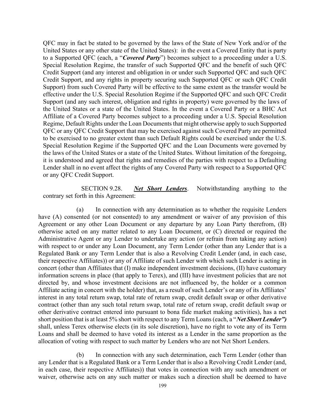 199 QFC may in fact be stated to be governed by the laws of the State of New York and/or of the United States or any other state of the United States): in the event a Covered Entity that is party to a Supported QFC (each, a “Covered Party”) becomes subject to a proceeding under a U.S. Special Resolution Regime, the transfer of such Supported QFC and the benefit of such QFC Credit Support (and any interest and obligation in or under such Supported QFC and such QFC Credit Support, and any rights in property securing such Supported QFC or such QFC Credit Support) from such Covered Party will be effective to the same extent as the transfer would be effective under the U.S. Special Resolution Regime if the Supported QFC and such QFC Credit Support (and any such interest, obligation and rights in property) were governed by the laws of the United States or a state of the United States. In the event a Covered Party or a BHC Act Affiliate of a Covered Party becomes subject to a proceeding under a U.S. Special Resolution Regime, Default Rights under the Loan Documents that might otherwise apply to such Supported QFC or any QFC Credit Support that may be exercised against such Covered Party are permitted to be exercised to no greater extent than such Default Rights could be exercised under the U.S. Special Resolution Regime if the Supported QFC and the Loan Documents were governed by the laws of the United States or a state of the United States. Without limitation of the foregoing, it is understood and agreed that rights and remedies of the parties with respect to a Defaulting Lender shall in no event affect the rights of any Covered Party with respect to a Supported QFC or any QFC Credit Support. SECTION 9.28. Net Short Lenders. Notwithstanding anything to the contrary set forth in this Agreement: (a) In connection with any determination as to whether the requisite Lenders have (A) consented (or not consented) to any amendment or waiver of any provision of this Agreement or any other Loan Document or any departure by any Loan Party therefrom, (B) otherwise acted on any matter related to any Loan Document, or (C) directed or required the Administrative Agent or any Lender to undertake any action (or refrain from taking any action) with respect to or under any Loan Document, any Term Lender (other than any Lender that is a Regulated Bank or any Term Lender that is also a Revolving Credit Lender (and, in each case, their respective Affiliates)) or any of Affiliate of such Lender with which such Lender is acting in concert (other than Affiliates that (I) make independent investment decisions, (II) have customary information screens in place (that apply to Terex), and (III) have investment policies that are not directed by, and whose investment decisions are not influenced by, the holder or a common Affiliate acting in concert with the holder) that, as a result of such Lender’s or any of its Affiliates’ interest in any total return swap, total rate of return swap, credit default swap or other derivative contract (other than any such total return swap, total rate of return swap, credit default swap or other derivative contract entered into pursuant to bona fide market making activities), has a net short position that is at least 5% short with respect to any Term Loans (each, a “Net Short Lender”) shall, unless Terex otherwise elects (in its sole discretion), have no right to vote any of its Term Loans and shall be deemed to have voted its interest as a Lender in the same proportion as the allocation of voting with respect to such matter by Lenders who are not Net Short Lenders. (b) In connection with any such determination, each Term Lender (other than any Lender that is a Regulated Bank or a Term Lender that is also a Revolving Credit Lender (and, in each case, their respective Affiliates)) that votes in connection with any such amendment or waiver, otherwise acts on any such matter or makes such a direction shall be deemed to have