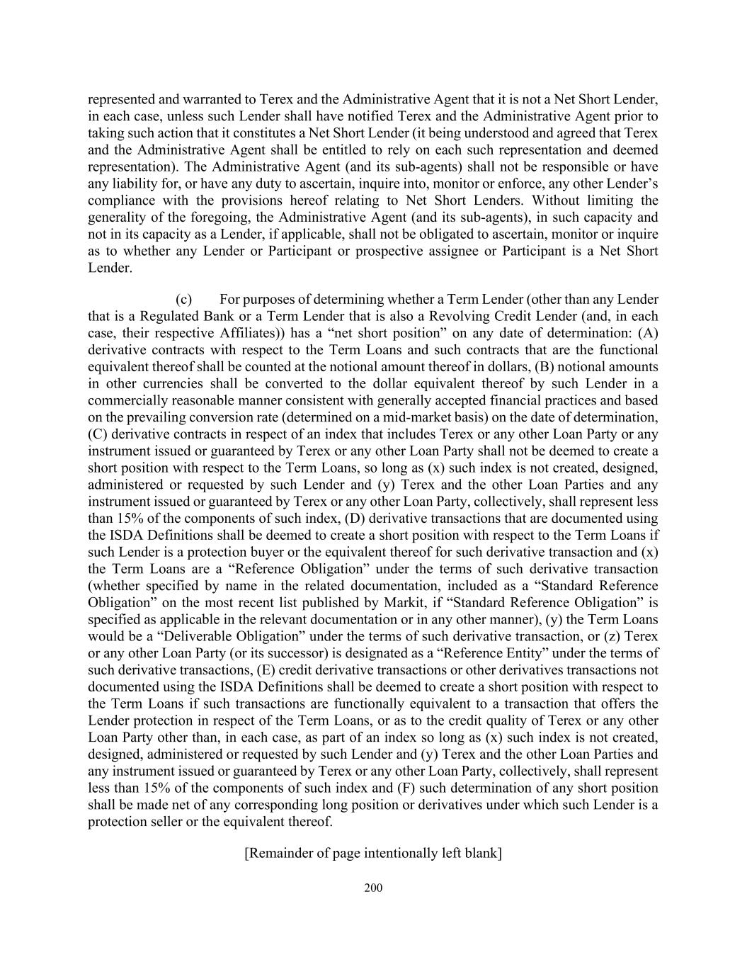 200 represented and warranted to Terex and the Administrative Agent that it is not a Net Short Lender, in each case, unless such Lender shall have notified Terex and the Administrative Agent prior to taking such action that it constitutes a Net Short Lender (it being understood and agreed that Terex and the Administrative Agent shall be entitled to rely on each such representation and deemed representation). The Administrative Agent (and its sub-agents) shall not be responsible or have any liability for, or have any duty to ascertain, inquire into, monitor or enforce, any other Lender’s compliance with the provisions hereof relating to Net Short Lenders. Without limiting the generality of the foregoing, the Administrative Agent (and its sub-agents), in such capacity and not in its capacity as a Lender, if applicable, shall not be obligated to ascertain, monitor or inquire as to whether any Lender or Participant or prospective assignee or Participant is a Net Short Lender. (c) For purposes of determining whether a Term Lender (other than any Lender that is a Regulated Bank or a Term Lender that is also a Revolving Credit Lender (and, in each case, their respective Affiliates)) has a “net short position” on any date of determination: (A) derivative contracts with respect to the Term Loans and such contracts that are the functional equivalent thereof shall be counted at the notional amount thereof in dollars, (B) notional amounts in other currencies shall be converted to the dollar equivalent thereof by such Lender in a commercially reasonable manner consistent with generally accepted financial practices and based on the prevailing conversion rate (determined on a mid-market basis) on the date of determination, (C) derivative contracts in respect of an index that includes Terex or any other Loan Party or any instrument issued or guaranteed by Terex or any other Loan Party shall not be deemed to create a short position with respect to the Term Loans, so long as (x) such index is not created, designed, administered or requested by such Lender and (y) Terex and the other Loan Parties and any instrument issued or guaranteed by Terex or any other Loan Party, collectively, shall represent less than 15% of the components of such index, (D) derivative transactions that are documented using the ISDA Definitions shall be deemed to create a short position with respect to the Term Loans if such Lender is a protection buyer or the equivalent thereof for such derivative transaction and (x) the Term Loans are a “Reference Obligation” under the terms of such derivative transaction (whether specified by name in the related documentation, included as a “Standard Reference Obligation” on the most recent list published by Markit, if “Standard Reference Obligation” is specified as applicable in the relevant documentation or in any other manner), (y) the Term Loans would be a “Deliverable Obligation” under the terms of such derivative transaction, or (z) Terex or any other Loan Party (or its successor) is designated as a “Reference Entity” under the terms of such derivative transactions, (E) credit derivative transactions or other derivatives transactions not documented using the ISDA Definitions shall be deemed to create a short position with respect to the Term Loans if such transactions are functionally equivalent to a transaction that offers the Lender protection in respect of the Term Loans, or as to the credit quality of Terex or any other Loan Party other than, in each case, as part of an index so long as (x) such index is not created, designed, administered or requested by such Lender and (y) Terex and the other Loan Parties and any instrument issued or guaranteed by Terex or any other Loan Party, collectively, shall represent less than 15% of the components of such index and (F) such determination of any short position shall be made net of any corresponding long position or derivatives under which such Lender is a protection seller or the equivalent thereof. [Remainder of page intentionally left blank]