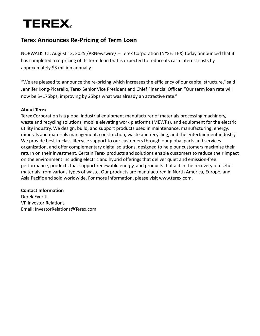 EXECUTION VERSION [[7995111]] BORROWING SUBSIDIARY TERMINATION AND GUARANTOR RELEASE August 12, 2025 UBS AG, Stamford Branch, as Administrative Agent 600 Washington Boulevard Stamford, CT 06901 ATTN: Agency Group Ladies and Gentlemen: Reference is hereby made to (a) the Amended and Restated Credit Agreement dated as of April 1, 2021 (as amended, restated, supplemented or otherwise modified from time to time, the “Credit Agreement”), among Terex Corporation, a Delaware corporation (“Terex”), the Subsidiaries of Terex from time to time party thereto (together with Terex, the “Borrowers”), the Lenders and Issuing Banks from time to time party thereto and UBS AG, Stamford Branch, as administrative agent (in such capacity, the “Administrative Agent”) and as collateral agent (in such capacity, the “Collateral Agent”), (b) the Refinancing Facility Agreement and Amendment No. 3 dated as of the date hereof (the “Amendment”), among Terex, the Subsidiary Borrowers and Subsidiary Guarantors party thereto, the Lenders and Issuing Banks party thereto, the Administrative Agent and the Collateral Agent, and (c) the Amended and Restated North Atlantic Guarantee Agreement dated as of October 8, 2024 (as amended, restated, supplemented or otherwise modified from time to time, the “NA Guaranty”), among New Terex Holdings UK Limited, a limited company organized under the laws of England, Terex International Holdings 2 Limited, a limited company organized under the laws of England and Wales, Terex International Financial Services Company Unlimited Company, a company incorporated under the laws of the Republic of Ireland (the “Terminated Borrowing Subsidiary”), and the Collateral Agent. Capitalized terms used herein but not otherwise defined herein shall have the meanings assigned to such terms in the Credit Agreement, the Amendment or the NA Guaranty, as applicable. Pursuant to Section 9.22 under the Credit Agreement, Terex hereby terminates the status of the Terminated Borrowing Subsidiary as a Subsidiary Borrower and a Borrower. Terex represents and warrants that (a) no Loans made to the Terminated Borrowing Subsidiary are outstanding as of the date hereof, (b) no Letters of Credit issued for the account of the Terminated Borrowing Subsidiary are outstanding as of the date hereof and (c) all amounts payable by the Terminated Borrowing Subsidiary in respect of interest and/or Fees (and, to the extent notified by the Administrative Agent, any Issuing Bank or any Lender, any other amounts payable under the Credit Agreement) pursuant to the Credit Agreement have been paid in full on or prior to the date hereof. The parties hereto agree that pursuant to Section 4 of the Amendment the Terminated Borrowing Subsidiary shall also be released from its obligations under the NA Guaranty, and agree that from and after the date hereof, the Terminated Borrowing Subsidiary shall cease to be a North Atlantic Guarantor thereunder. For the avoidance of doubt, (a) nothing herein authorizes any release other than to the extent expressly set forth herein, (b) nothing herein shall in any manner discharge, affect or impair the obligations of the other Loan Parties (other than the Terminated Borrowing Subsidiary) under the Loan Documents and (c) no North Atlantic Guarantor other than the Terminated Borrowing Subsidiary is released from its obligations under the Loan Documents. It is understood and agreed that the Loan Documents shall otherwise remain in full force and effect.