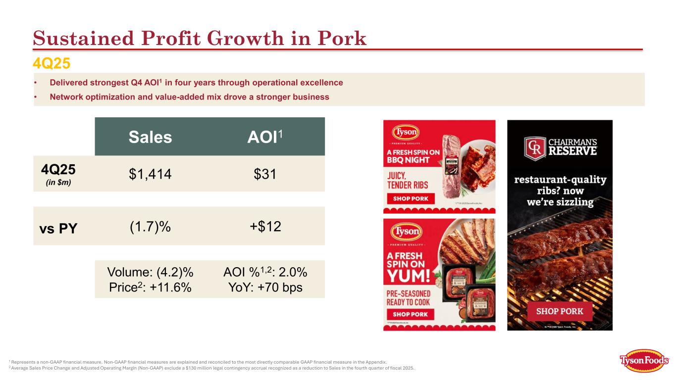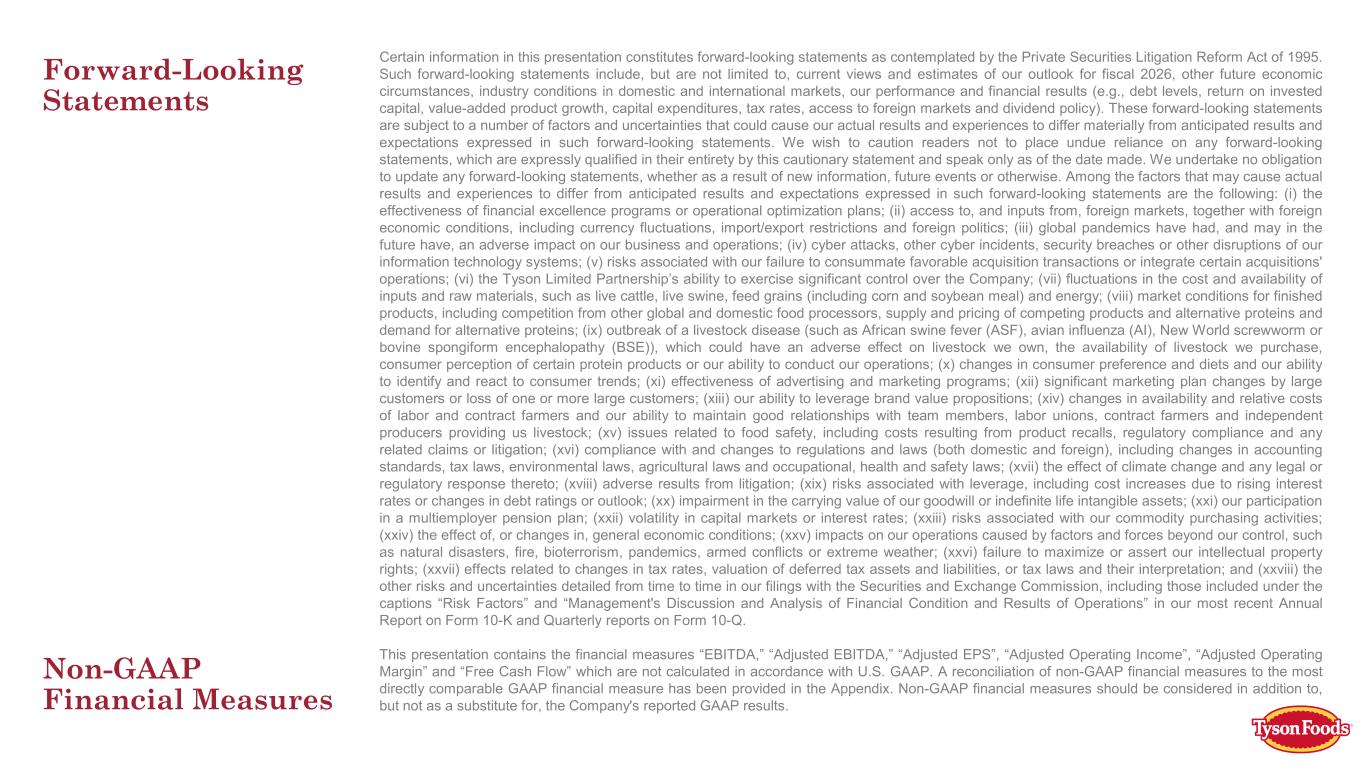 米国農務省(USDA)は、直近の2026年度のデータとして、国内の蛋白質生産量(牛肉、豚肉、鶏肉、七面鳥)は2025年度比で約1%増加するとしている。以下は、更新された各セグメント別の見通し、ならびに2026年度の売上高、資本支出、純支払利息、流動性、フリー・キャッシュ・フロー、税率、配当金の見通しの要約です。見通し数値の一部には、各セグメントの調整後営業利益(損失)(非GAAP指標)が含まれています。当社の会計サイクルは2025年度の52週制に対し、2026年度は53週制となるため、2026年度の見通しは比較可能な52週制に基づいています。2026年度通期の調整後業績見通しと2026年度通期のGAAPベースの業績見通しとの調整は、GAAPベースでそのような指標を算出するために必要な一部の情報が入手不可能であるか、または当社のコントロールの及ばない将来の事象のタイミングに依存しているため、当社ではできません。従って、将来的に適用される可能性のある調整項目の性質や金額は不確実で変動性があり、その金額は多額になる可能性があるため、当社はこれらの将来見通しに関する非GAAP基準の調整項目を不合理な努力なしに提供することはできません。調整後営業利益(損失)は、営業利益(損失)またはGAAPに準拠して報告される財務業績のその他の指標の代替とみなされるべきではありません。投資家は主に当社のGAAPベースの業績に依拠し、非GAAPベースの財務指標は投資判断の補助的にのみ使用してください。