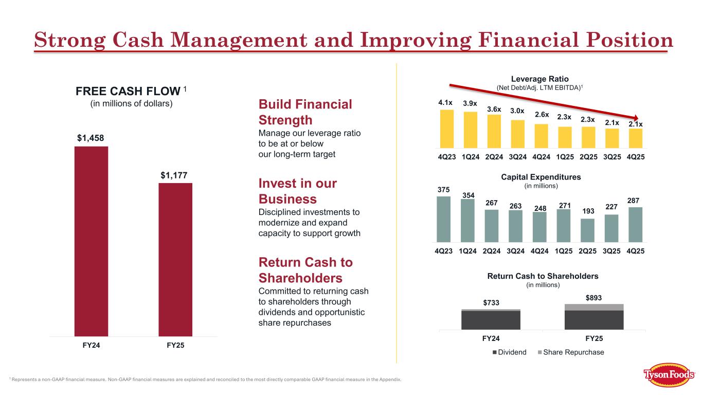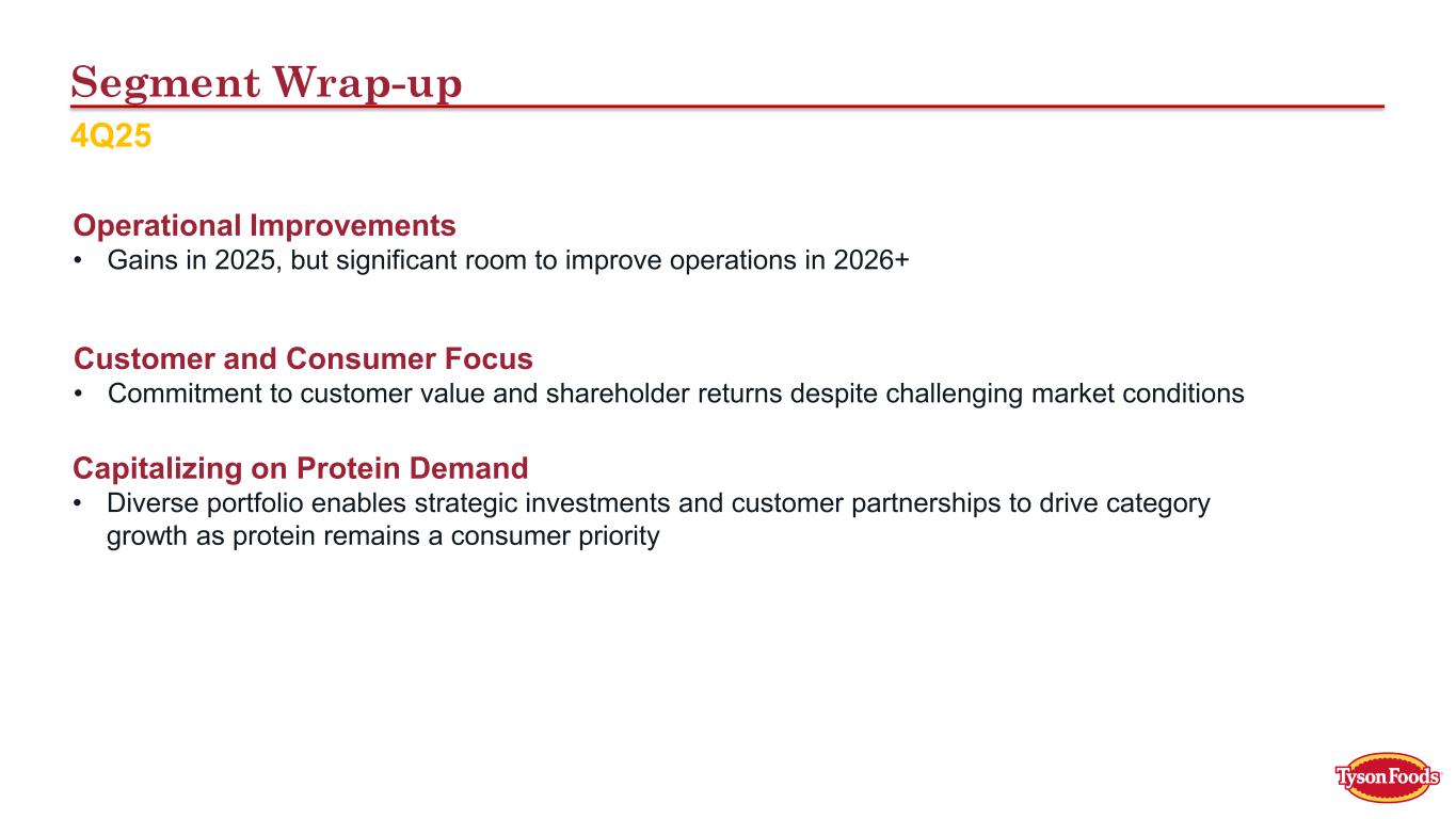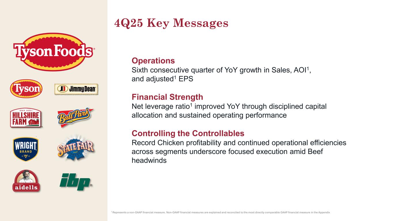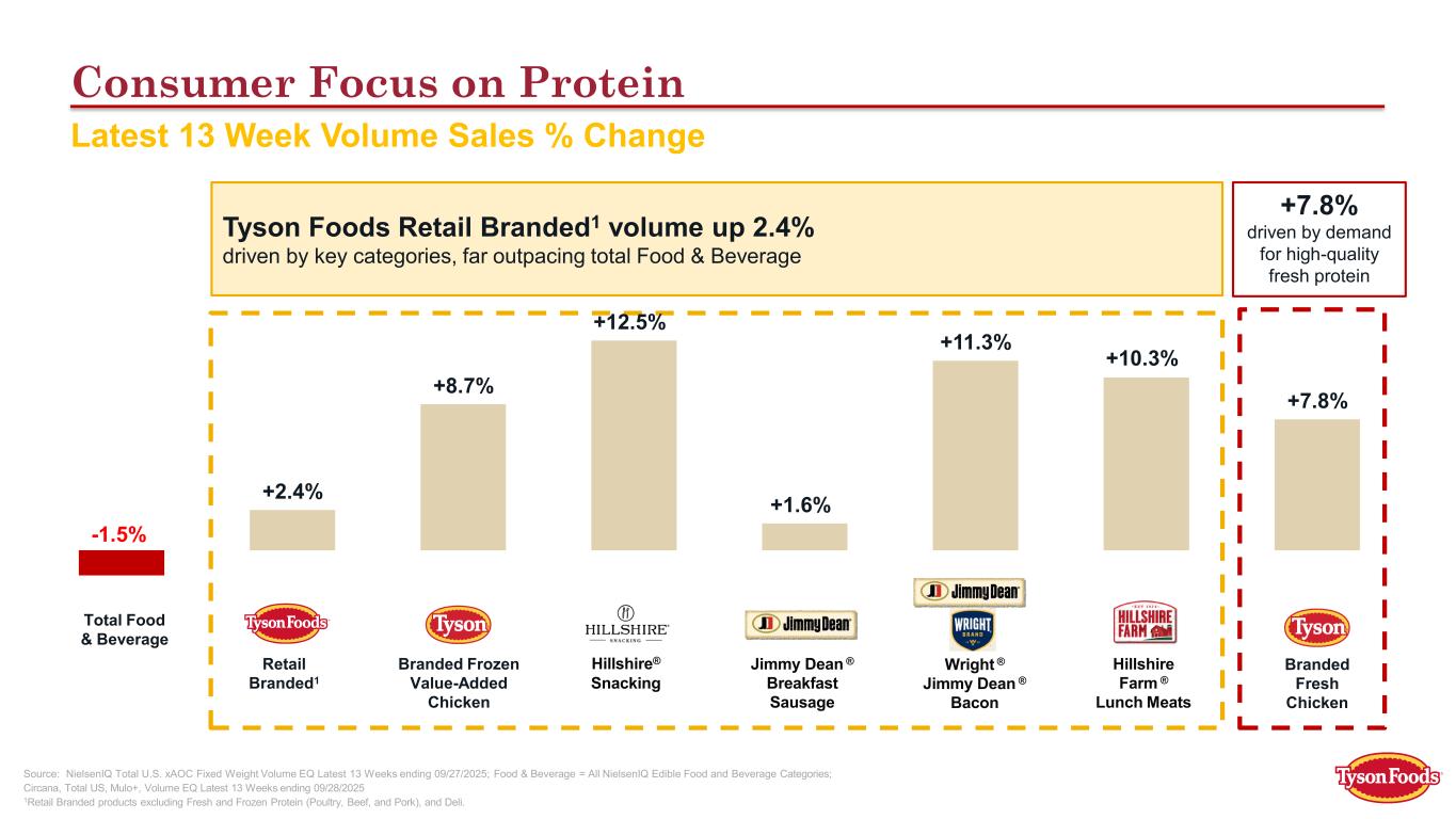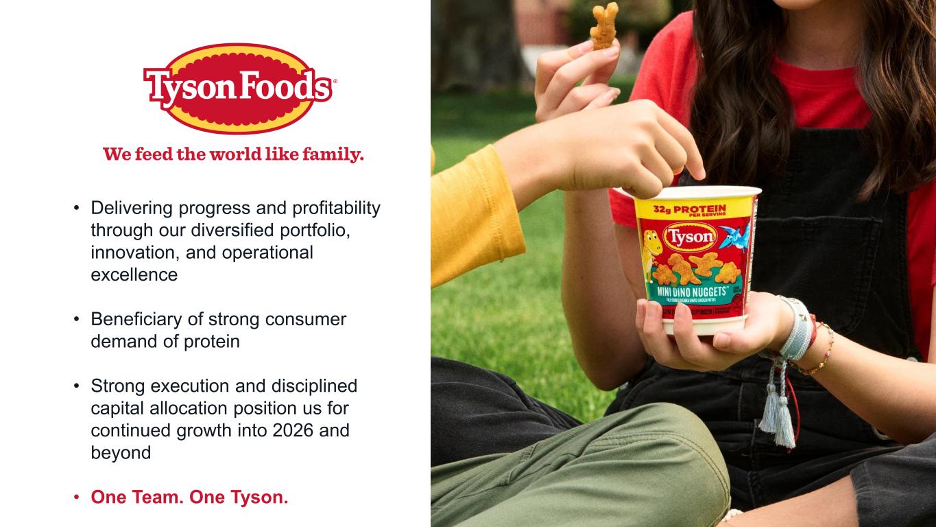 アーカンソー州スプリングデール-2025年11月10日-世界最大級の食品会社であり、タイソン、ジミー・ディーン、ヒルシャー・ファーム、ボールパーク、ライト、エイデルス、ibp、ステート・フェアなどの一流ブランドを擁し、タンパク質のリーダーとして知られるタイソン・フーズ・インク(NYSE:TSN)は、以下の決算を発表した: