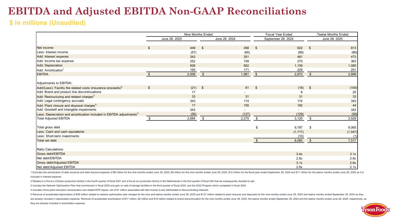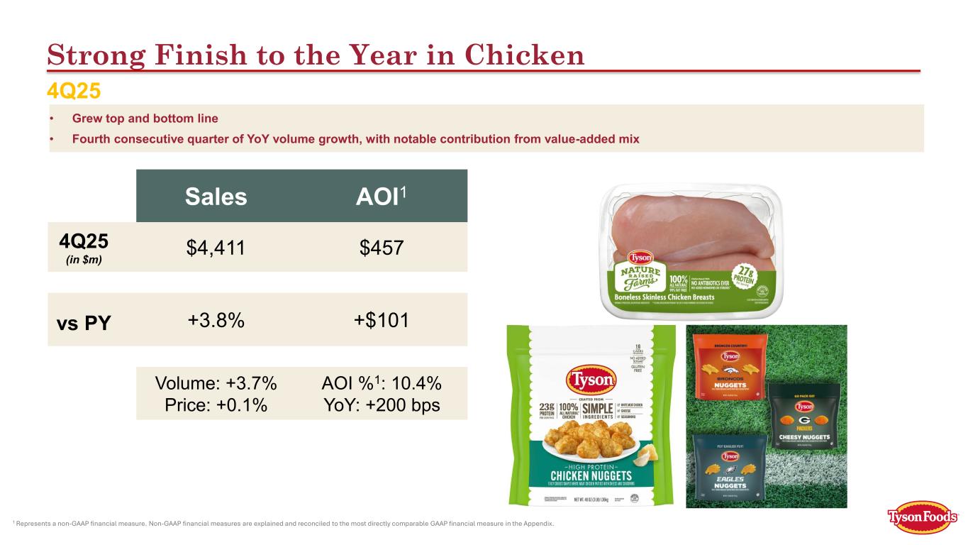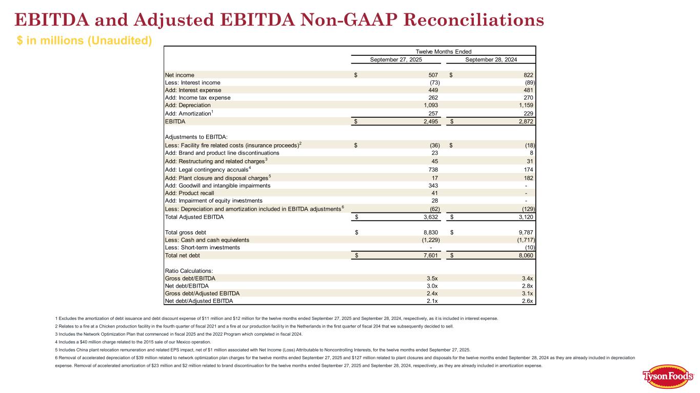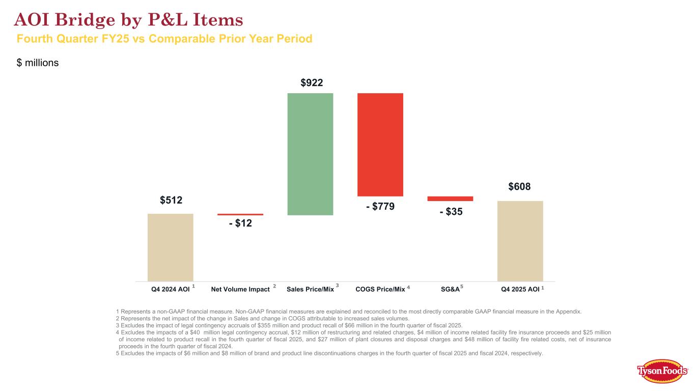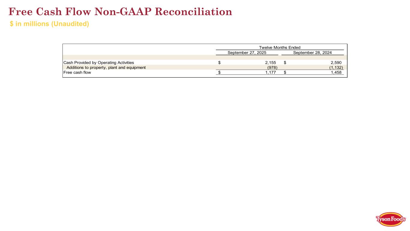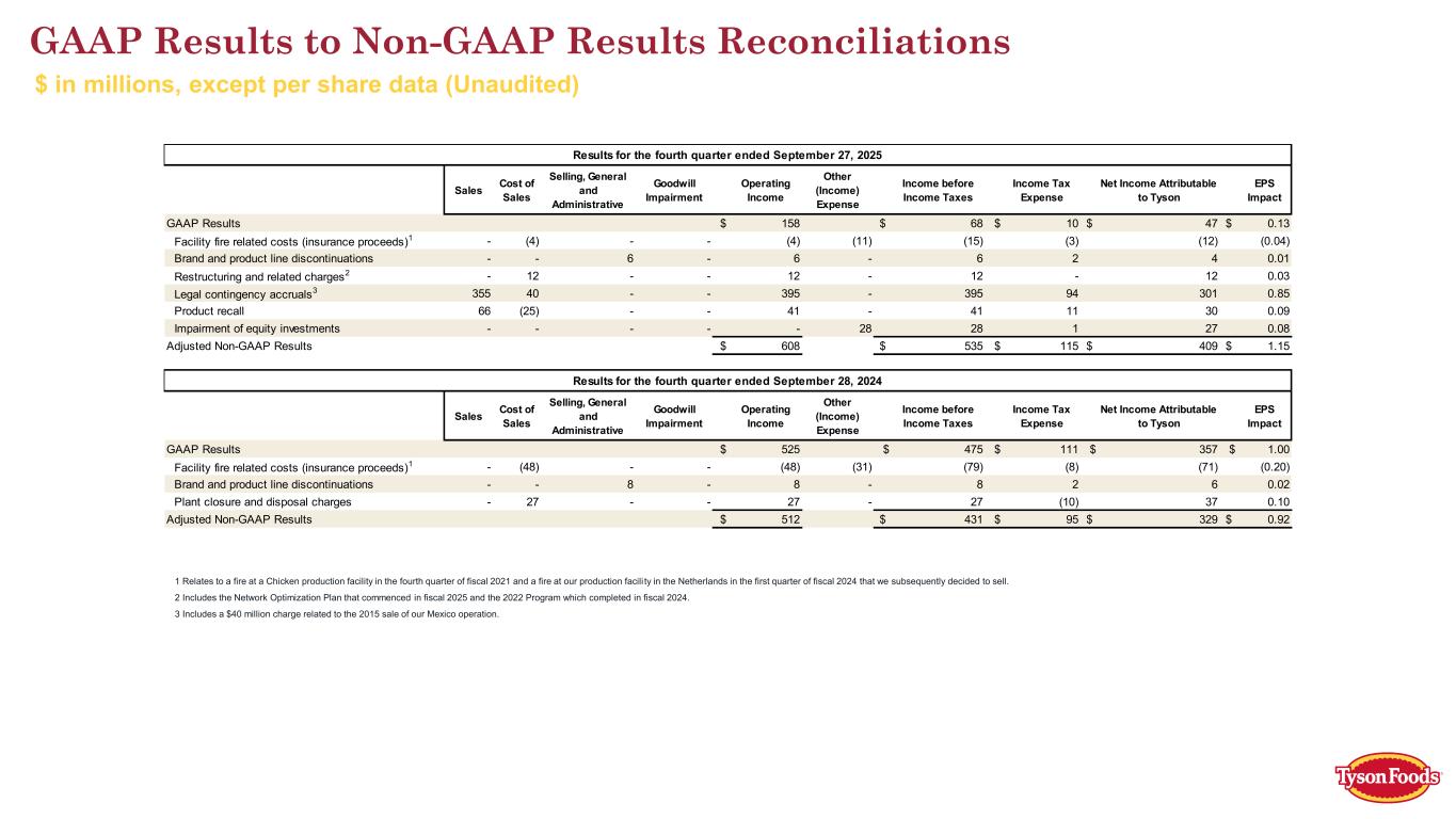 アーカンソー州スプリングデール-2025年11月10日-世界最大級の食品会社であり、タイソン、ジミー・ディーン、ヒルシャー・ファーム、ボールパーク、ライト、エイデルス、ibp、ステート・フェアなどの一流ブランドを擁し、タンパク質のリーダーとして知られるタイソン・フーズ・インク(NYSE:TSN)は、以下の決算を発表した: