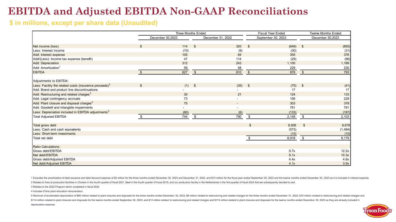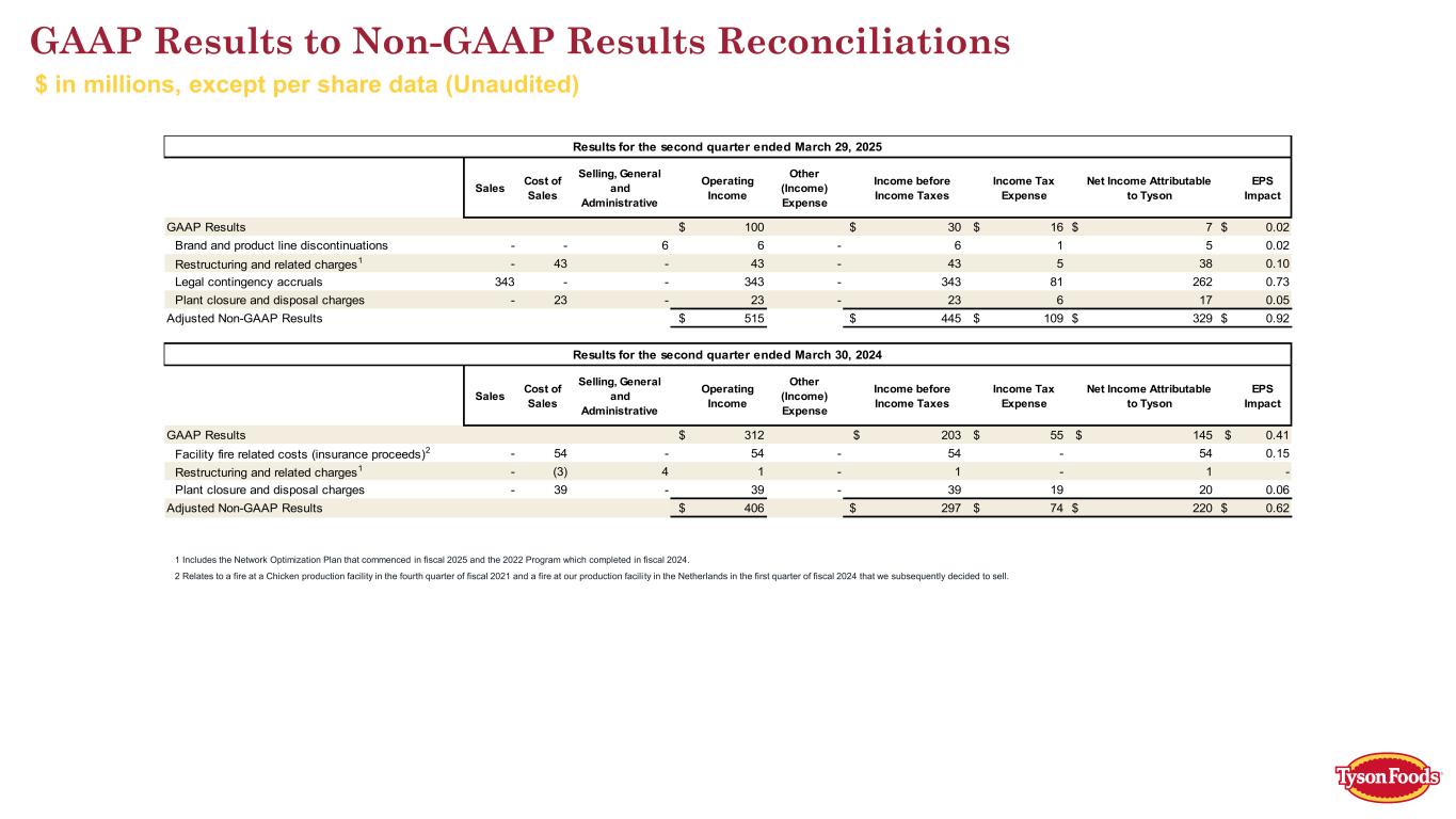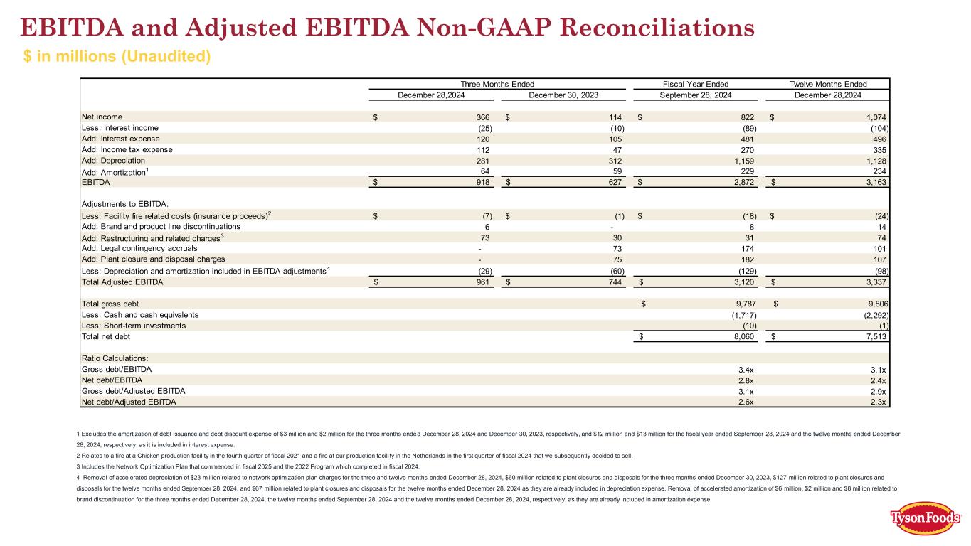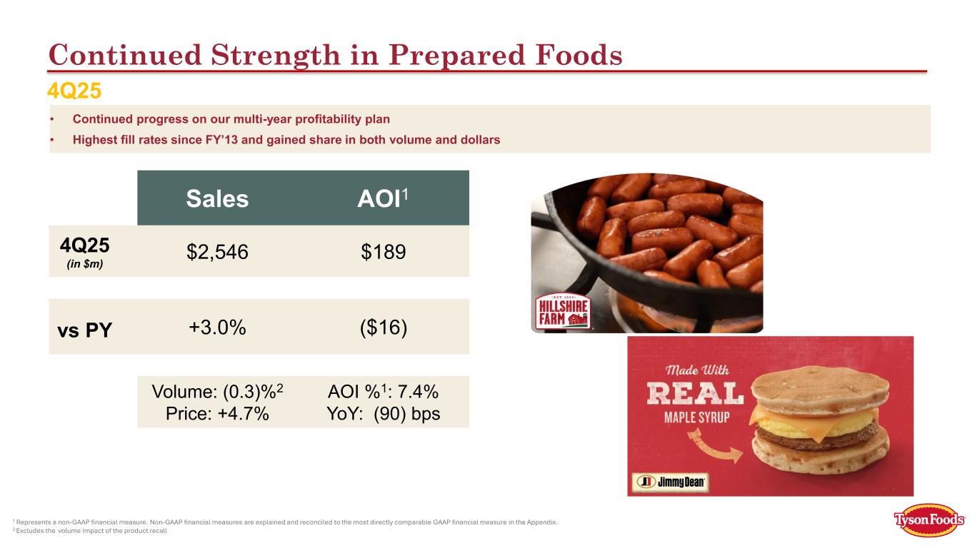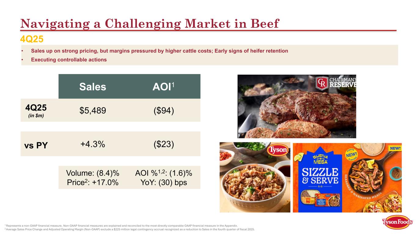 アーカンソー州スプリングデール-2025年11月10日-世界最大級の食品会社であり、タイソン、ジミー・ディーン、ヒルシャー・ファーム、ボールパーク、ライト、エイデルス、ibp、ステート・フェアなどの一流ブランドを擁し、タンパク質のリーダーとして知られるタイソン・フーズ・インク(NYSE:TSN)は、以下の決算を発表した:
