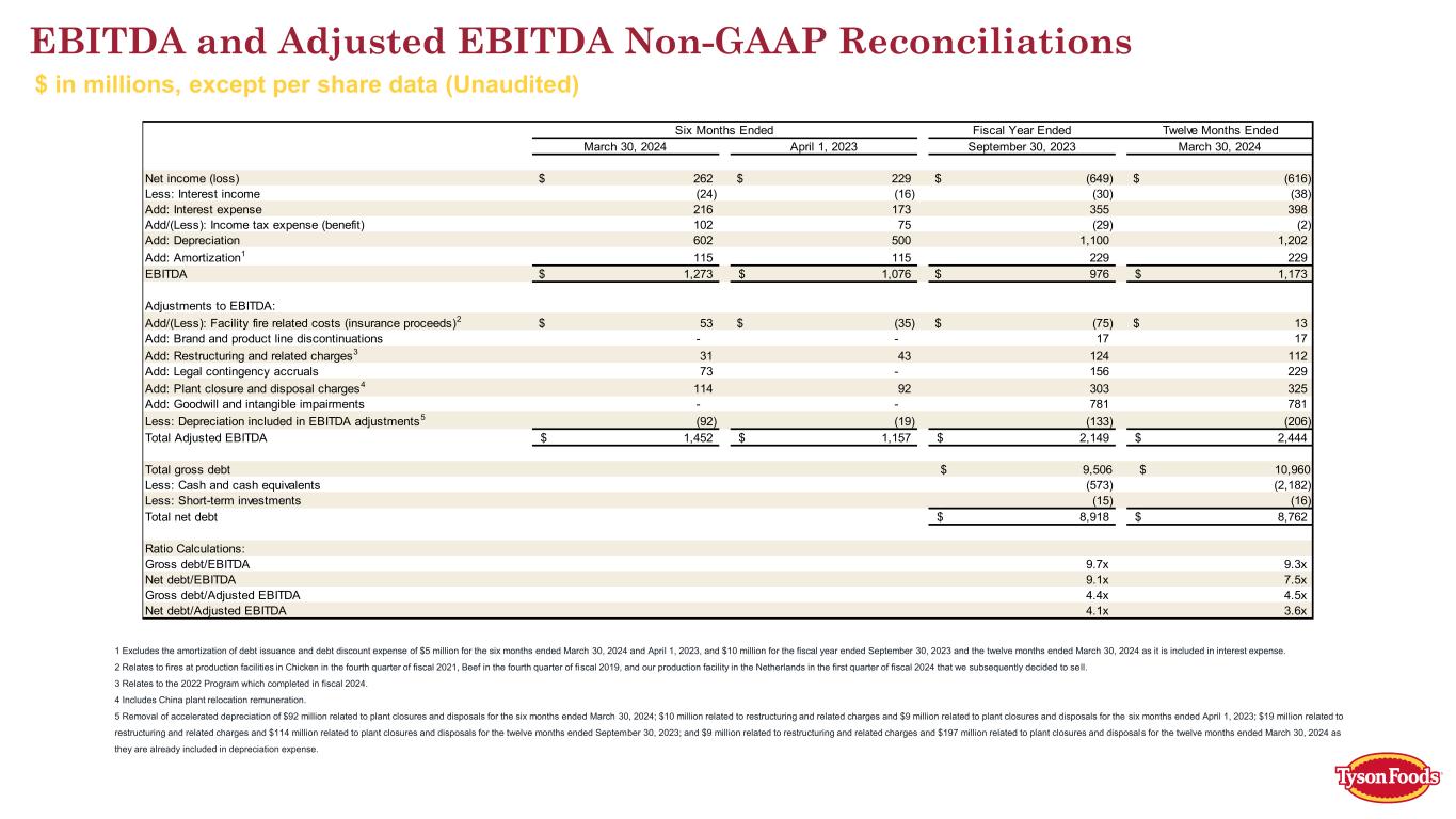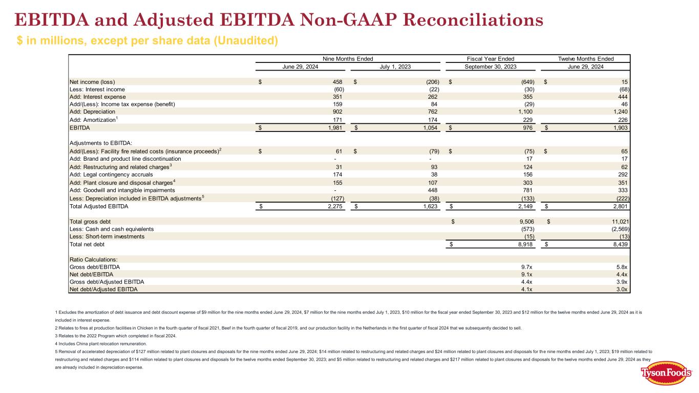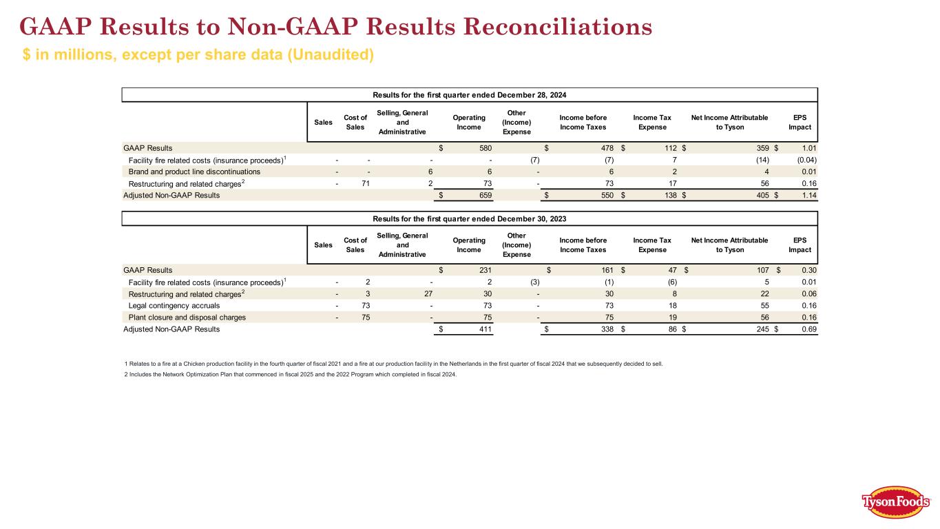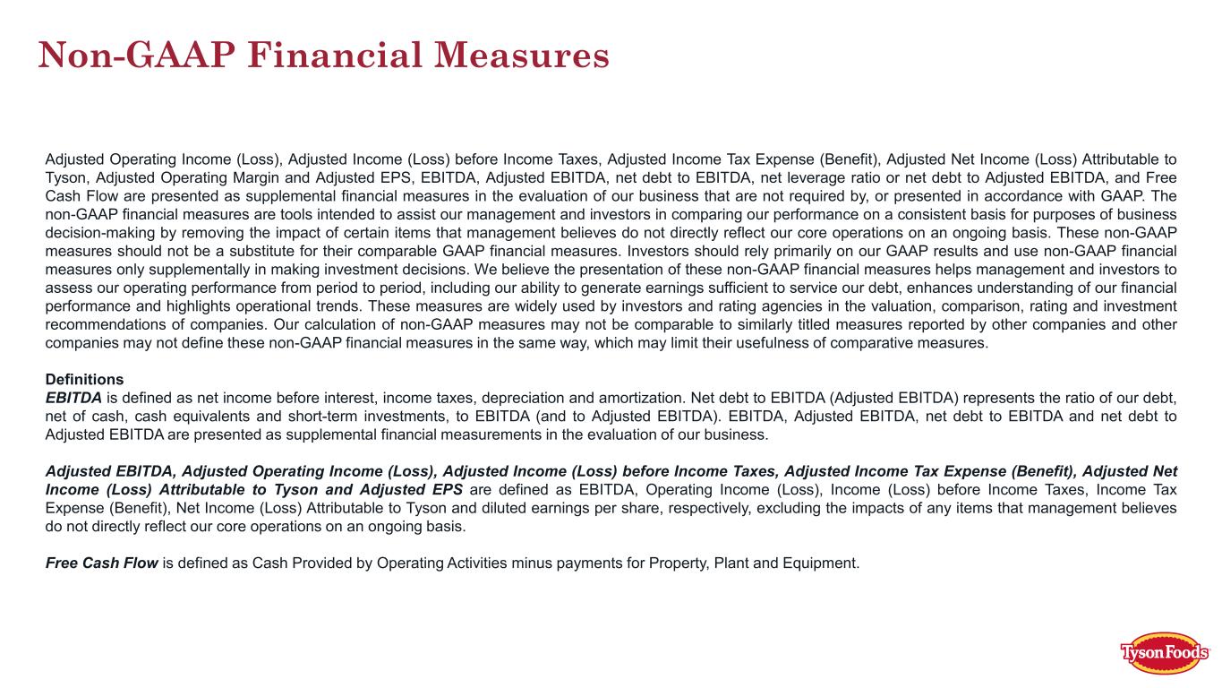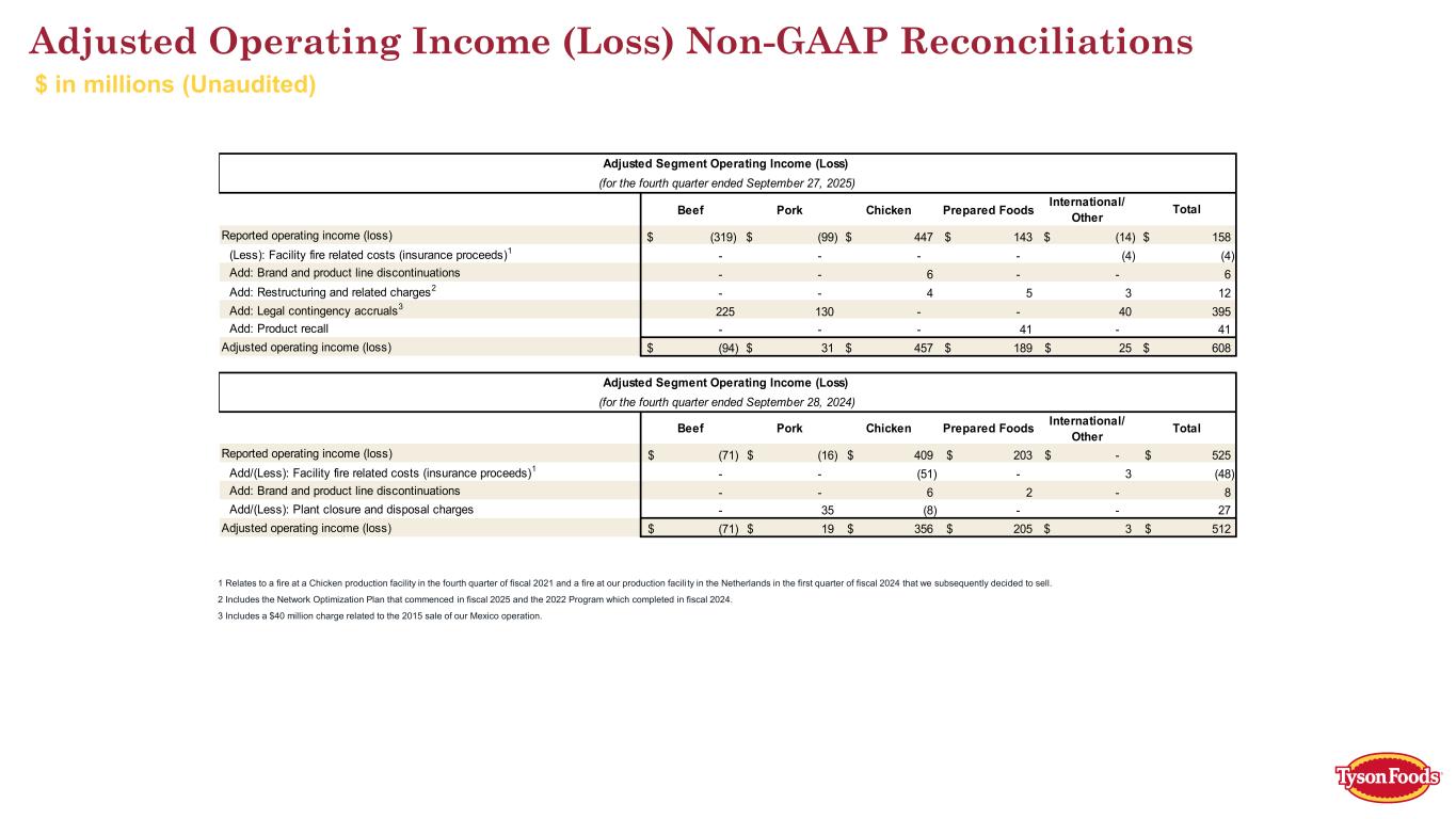2 2025年9月27日に終了した3ヵ月間の牛肉・豚肉セグメントおよび全社合計の平均価格変動および調整後営業利益率(非GAAP基準)には、売上高への減額として認識された法的偶発事象の発生による影響額、それぞれ2億2,500万ドル、1億3,000万ドル、3億5,500万ドルが含まれていない。2025年9月27日に終了した12ヵ月間の牛肉・豚肉セグメントおよび全社合計の平均価格変動および調整後営業利益率(非GAAP基準)は、売上高への減額として認識された訴訟偶発債務の影響額(それぞれ3億1,800万ドル、3億8,000万ドル、6億9,800万ドル)を除外しています。2024年9月28日に終了した12ヶ月間の豚肉セグメントおよび全社合計の平均価格変動および調整後営業利益率(非GAAP基準)には、売上高への減額として認識された偶発債務4,500万ドルの影響は含まれていません。