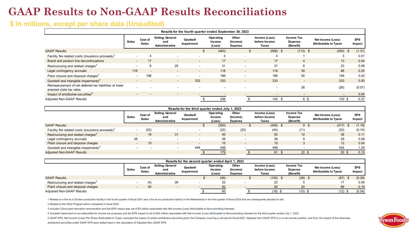 「タイソン・フーズのドニー・キング社長兼最高経営責任者(CEO)は、「当社の多タンパク質・多チャネル・ポートフォリオの強みを反映し、売上高、調整後営業利益、調整後1株当たり利益は前年同期比で増加しました。「今会計年度の進捗は、顧客と消費者の進化するニーズを満たしながら、卓越した経営へのコミットメントを実証するものです。世界トップクラスの食品会社として、またタンパク質のリーダーとして認知される企業として、当社は引き続き、事業の管理可能な側面を継続的に改善し、株主価値を提供することに注力していきます。"