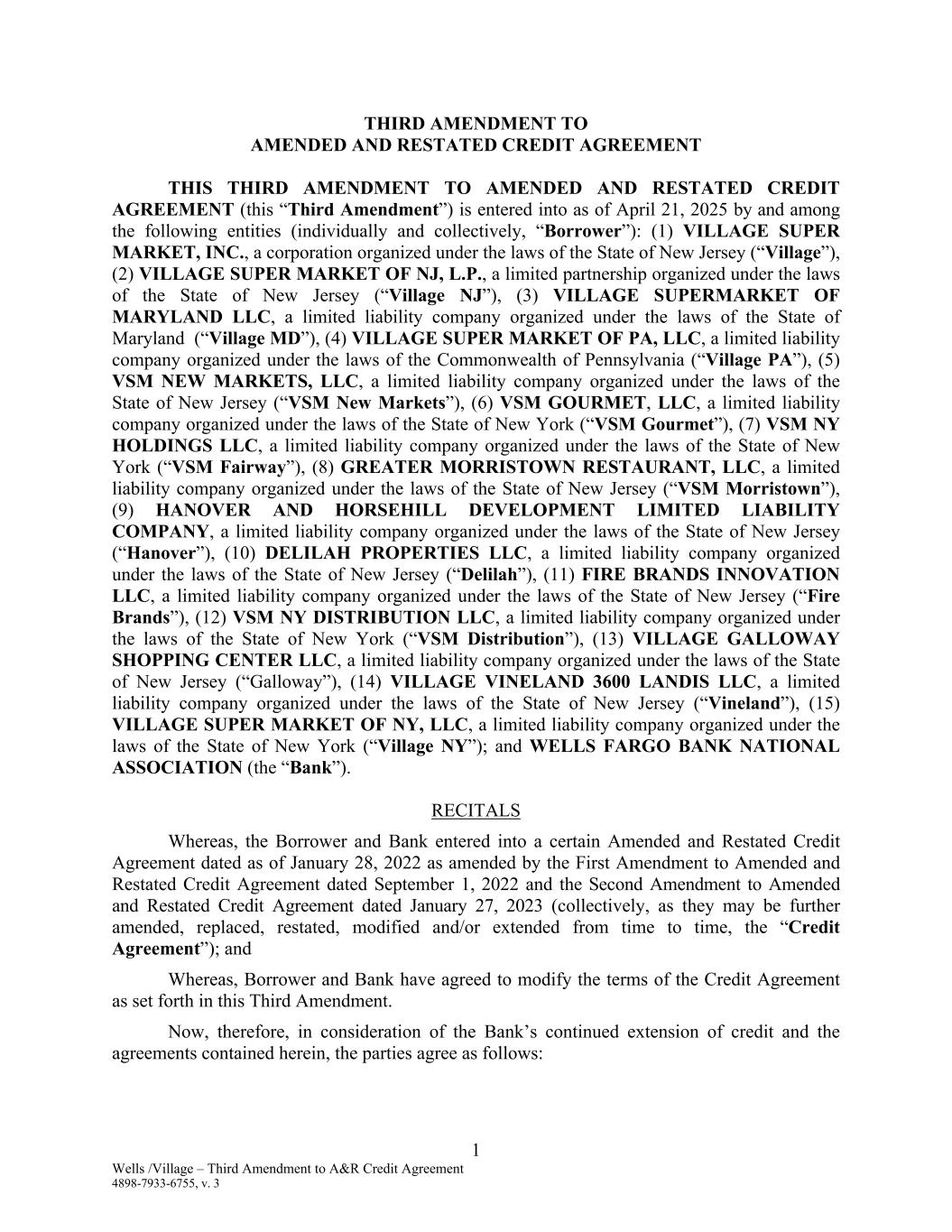 8 Wells /Village – Third Amendment to A&R Credit Agreement 4898-7933-6755, v. 3 IN WITNESS WHEREOF, the undersigned have signed and sealed this Third Amendment the day and year first above written. VILLAGE SUPER MARKET, INC. By:__________________________ Name: John Van Orden Title: Chief Financial Officer VILLAGE SUPER MARKET OF NJ, L.P. By: Village Super Market, Inc., a New Jersey corporation, its General Partner By:________________________ Name: John Van Orden Title: Chief Financial Officer VILLAGE SUPERMARKET OF MARYLAND LLC By: Village Super Market, Inc., a New Jersey corporation, its Sole Member By:_________________________ Name: John Van Orden Title: Chief Financial Officer VILLAGE SUPER MARKET OF PA, LLC By: Village Super Market, Inc., a New Jersey corporation, its Sole Member By:_________________________ Name: John Van Orden Title: Chief Financial Officer [SIGNATURE PAGES TO THE THIRD AMENDMENT TO A&R CREDIT AGREEMENT – Additional Signature Pages Follow] /s/ John Van Orden /s/ John Van Orden /s/ John Van Orden /s/ John Van Orden