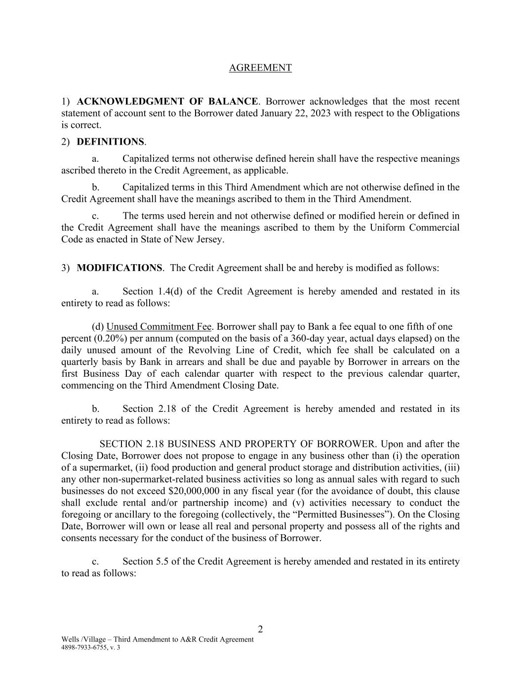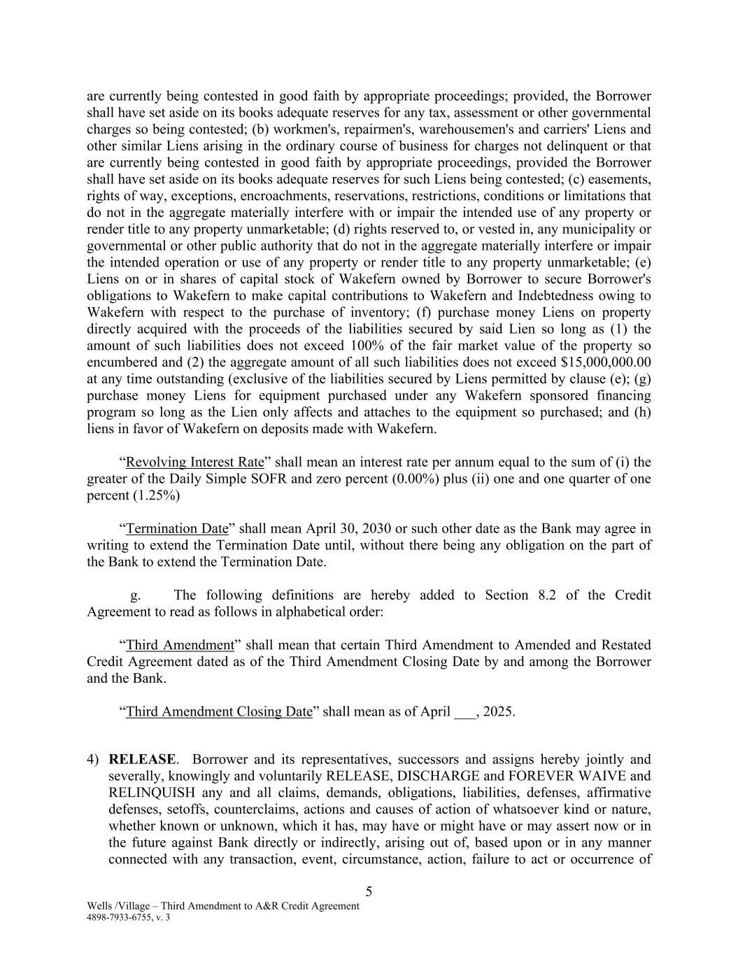 5 Wells /Village – Third Amendment to A&R Credit Agreement 4898-7933-6755, v. 3 are currently being contested in good faith by appropriate proceedings; provided, the Borrower shall have set aside on its books adequate reserves for any tax, assessment or other governmental charges so being contested; (b) workmen's, repairmen's, warehousemen's and carriers' Liens and other similar Liens arising in the ordinary course of business for charges not delinquent or that are currently being contested in good faith by appropriate proceedings, provided the Borrower shall have set aside on its books adequate reserves for such Liens being contested; (c) easements, rights of way, exceptions, encroachments, reservations, restrictions, conditions or limitations that do not in the aggregate materially interfere with or impair the intended use of any property or render title to any property unmarketable; (d) rights reserved to, or vested in, any municipality or governmental or other public authority that do not in the aggregate materially interfere or impair the intended operation or use of any property or render title to any property unmarketable; (e) Liens on or in shares of capital stock of Wakefern owned by Borrower to secure Borrower's obligations to Wakefern to make capital contributions to Wakefern and Indebtedness owing to Wakefern with respect to the purchase of inventory; (f) purchase money Liens on property directly acquired with the proceeds of the liabilities secured by said Lien so long as (1) the amount of such liabilities does not exceed 100% of the fair market value of the property so encumbered and (2) the aggregate amount of all such liabilities does not exceed $15,000,000.00 at any time outstanding (exclusive of the liabilities secured by Liens permitted by clause (e); (g) purchase money Liens for equipment purchased under any Wakefern sponsored financing program so long as the Lien only affects and attaches to the equipment so purchased; and (h) liens in favor of Wakefern on deposits made with Wakefern. “Revolving Interest Rate” shall mean an interest rate per annum equal to the sum of (i) the greater of the Daily Simple SOFR and zero percent (0.00%) plus (ii) one and one quarter of one percent (1.25%) “Termination Date” shall mean April 30, 2030 or such other date as the Bank may agree in writing to extend the Termination Date until, without there being any obligation on the part of the Bank to extend the Termination Date. g. The following definitions are hereby added to Section 8.2 of the Credit Agreement to read as follows in alphabetical order: “Third Amendment” shall mean that certain Third Amendment to Amended and Restated Credit Agreement dated as of the Third Amendment Closing Date by and among the Borrower and the Bank. “Third Amendment Closing Date” shall mean as of April ___, 2025. 4) RELEASE. Borrower and its representatives, successors and assigns hereby jointly and severally, knowingly and voluntarily RELEASE, DISCHARGE and FOREVER WAIVE and RELINQUISH any and all claims, demands, obligations, liabilities, defenses, affirmative defenses, setoffs, counterclaims, actions and causes of action of whatsoever kind or nature, whether known or unknown, which it has, may have or might have or may assert now or in the future against Bank directly or indirectly, arising out of, based upon or in any manner connected with any transaction, event, circumstance, action, failure to act or occurrence of