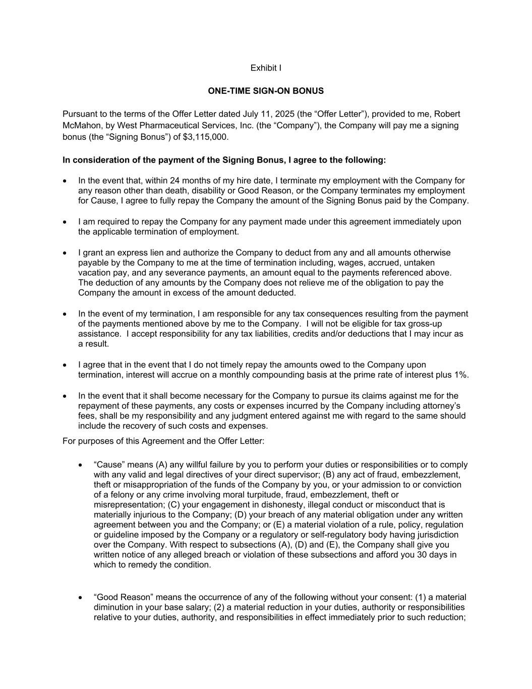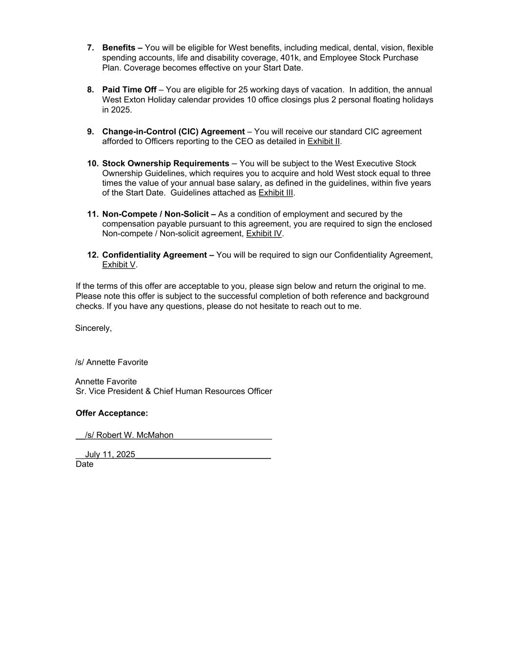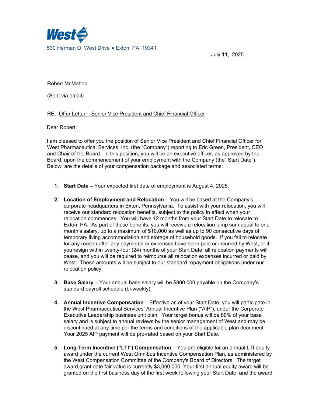 ウエスト・ファーマシューティカル・サービス・インクとロバート・マクマホンとの間の2025年7月11日付オファーレター。 |