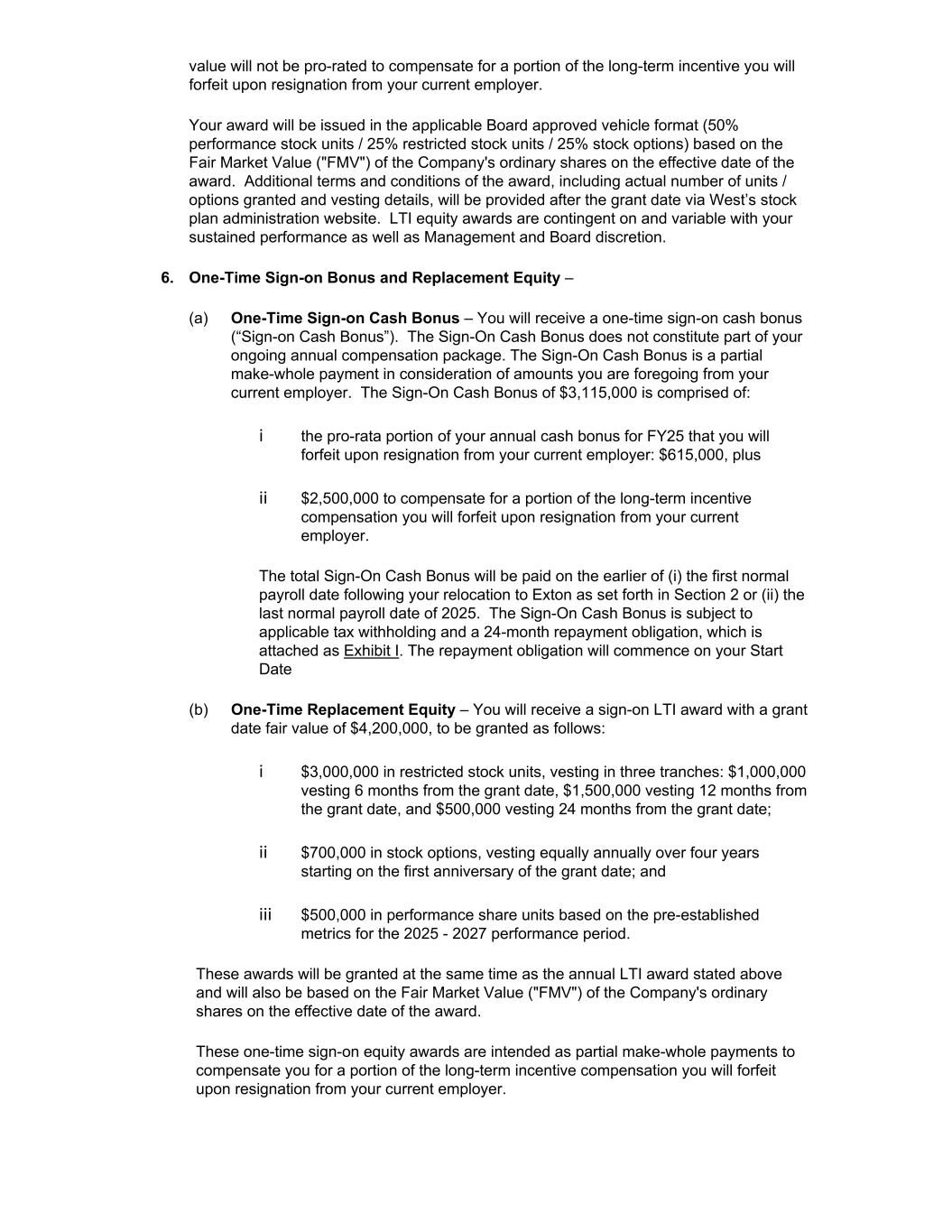 マクマホン氏はまた、3,115,000ドルの1回限りの現金サインオンボーナスと、4,200,000ドルの付与日公正価値を持つ1回限りのサインオン代替株式付与(以下、「代替株式付与」)を受け取る。代替株式付与は、付与日公正価値3,000,000ドルのRSU、付与日公正価値700,000ドルのストック・オプション、付与日公正価値500,000ドルのPSUで構成される。サインオン・キャッシュボーナスと代替株式付与はいずれも、マクマホン氏が以前の雇用主を退職した際に放棄した、短期的な現金および株式インセンティブと長期的な株式インセンティブ報酬の価値を部分的に補償するためのものです。マクマホン氏には、(i) エクストンへの移転後の最初の通常の給与支払日、または (ii) 2025 年の最後の通常の給与支払日のいずれか早い日に、現金サインオンボーナスが支払われます。マクマホン氏が、開始日から2年目以前に、みなし解雇、死亡、障害以外の何らかの理由で当社との雇用を終了した場合、または当社がマクマホン氏の雇用を理由によって終了した場合、すべてオファー・レターに定義されているとおり、サインオン・ボーナスは2年間の返済義務の対象となります。当社は、当初付与日に代替株式付与を行います。100万ドルは当初付与日から6カ月、150万ドルは当初付与日から12カ月、50万ドルは当初付与日から24カ月で権利が確定します。