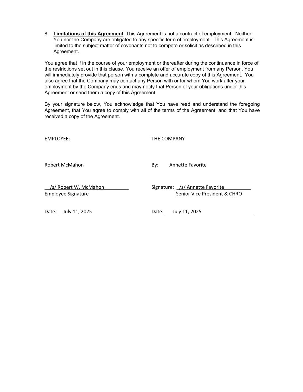 同氏の就任に関連して、マクマホン氏と当社は2025年7月11日付のオファー・レター(以下「オファー・レター」)を締結した。オファー・レターに従い、マクマホン氏は当初年間基本給800,000ドルを受け取る。また、年次インセンティブ・プランによるボーナスを受け取る資格もあり、その目標額は基本給の80%で、2025年の雇用期間に応じて按分される。