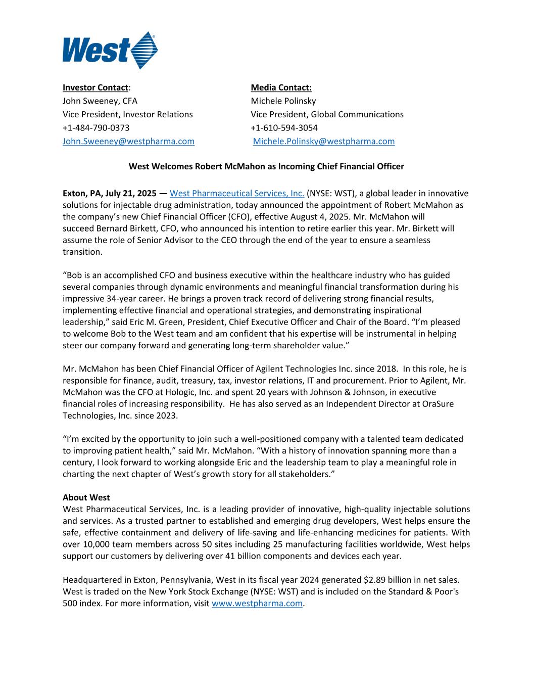 2025年7月21日、ウェスト・ファーマシューティカル・サービス社(以下「当社」)は、2025年8月4日付(以下「入社日」)で、ロバート・マクマホン氏を上級副社長兼最高財務責任者(CFO)に任命したことを発表しました。マクマホン氏は、当社のシニア・リーダーシップ・チームの一員として、財務、監査、財務、税務、IR、調達を統括します。