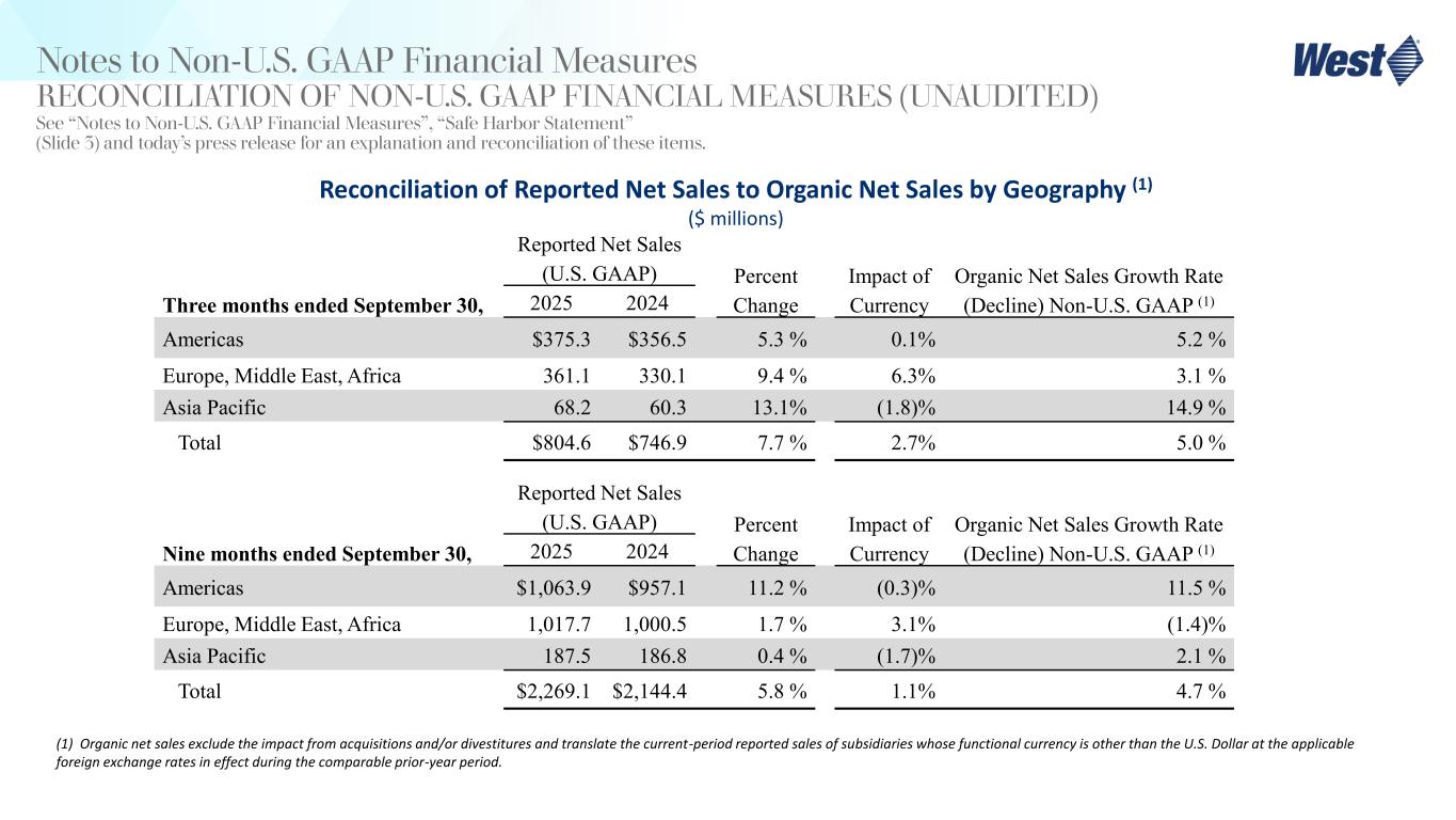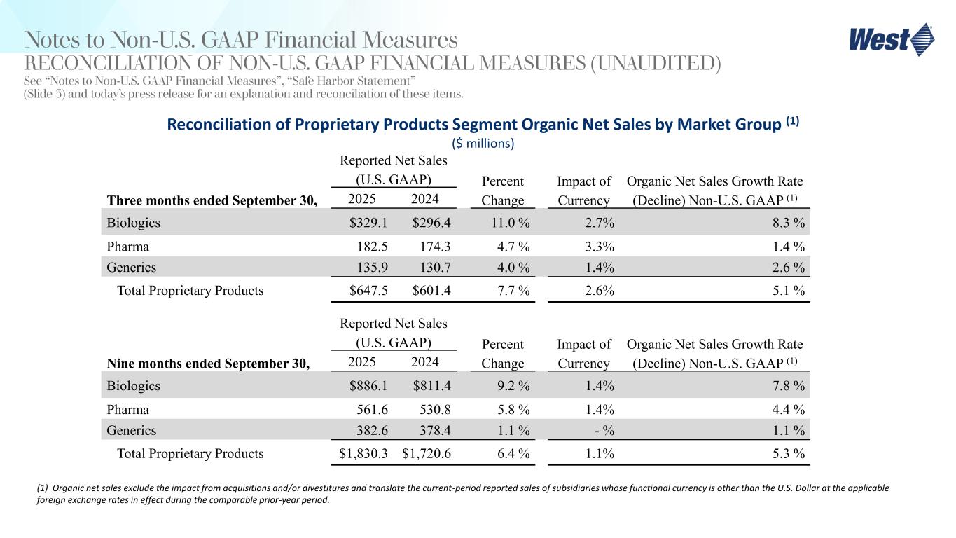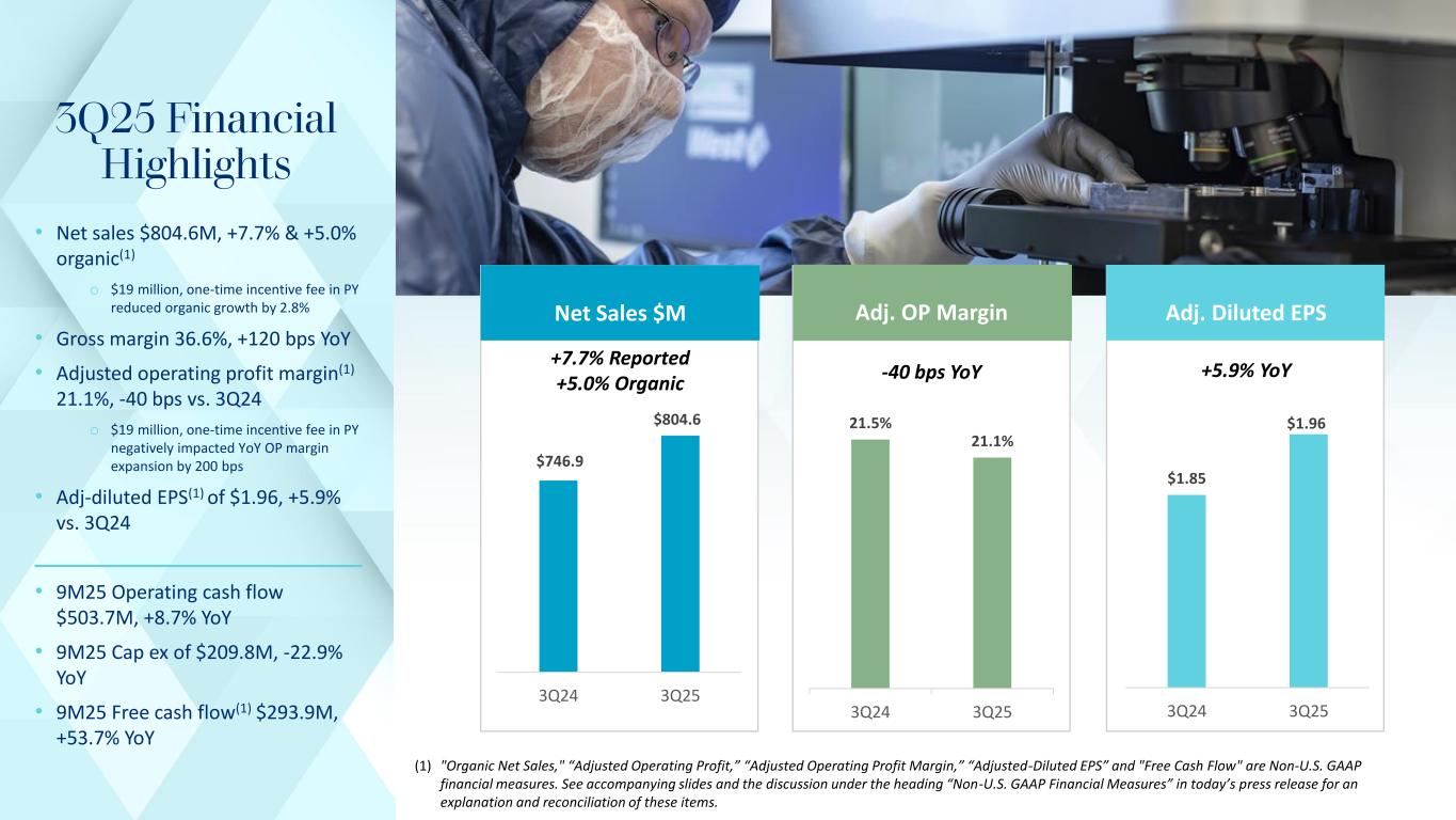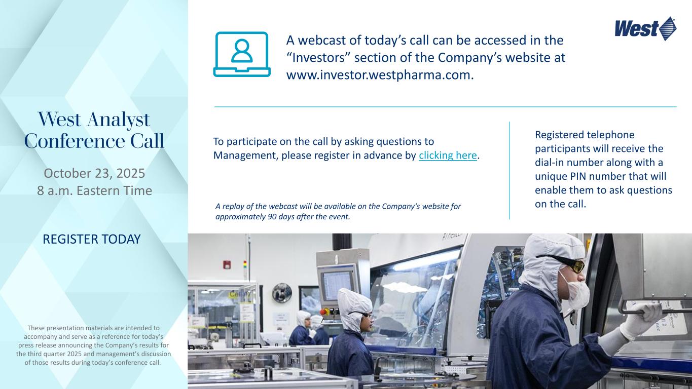 ペンシルベニア州エクストン、2025年10月23日-革新的で高品質な注射剤ソリューションとサービスの大手プロバイダーであるウエスト・ファーマシューティカル・サービス(NYSE:WST)は本日、2025年第3四半期の業績を発表した。