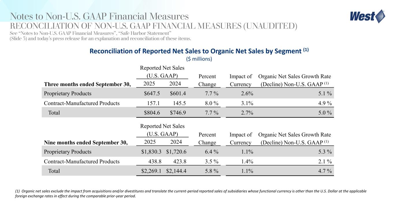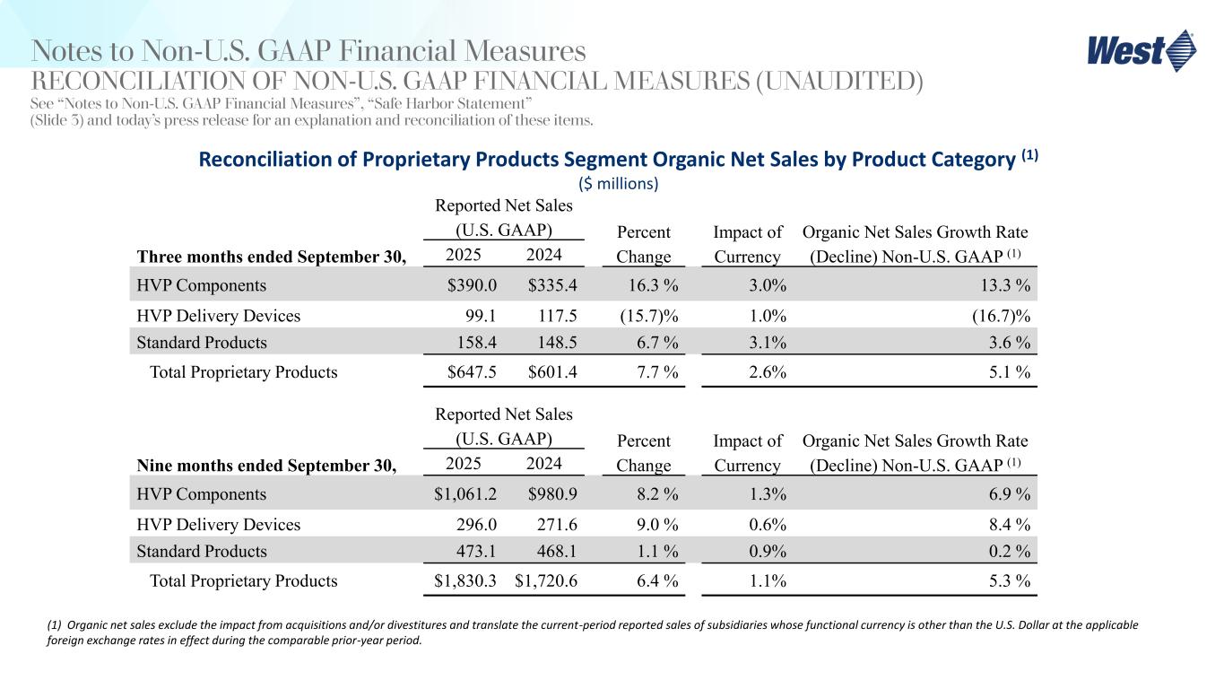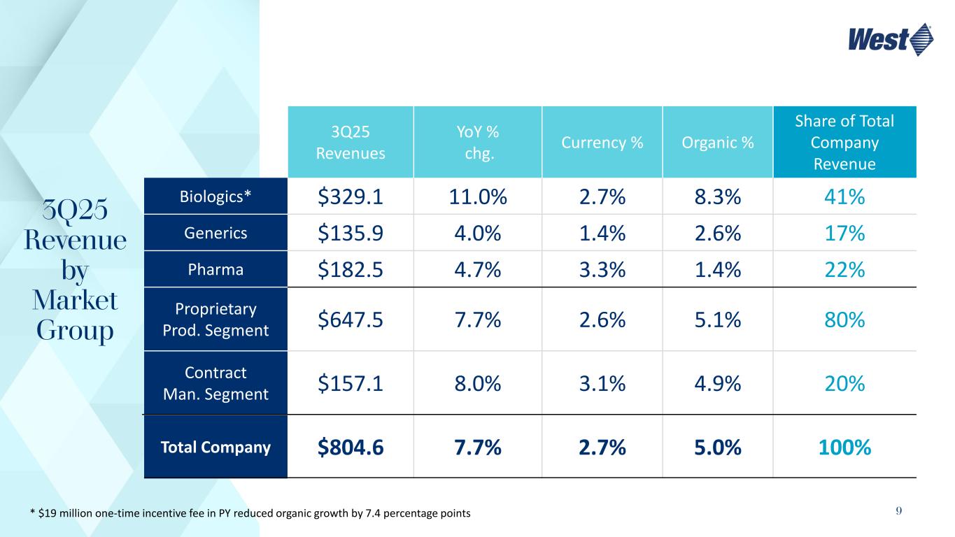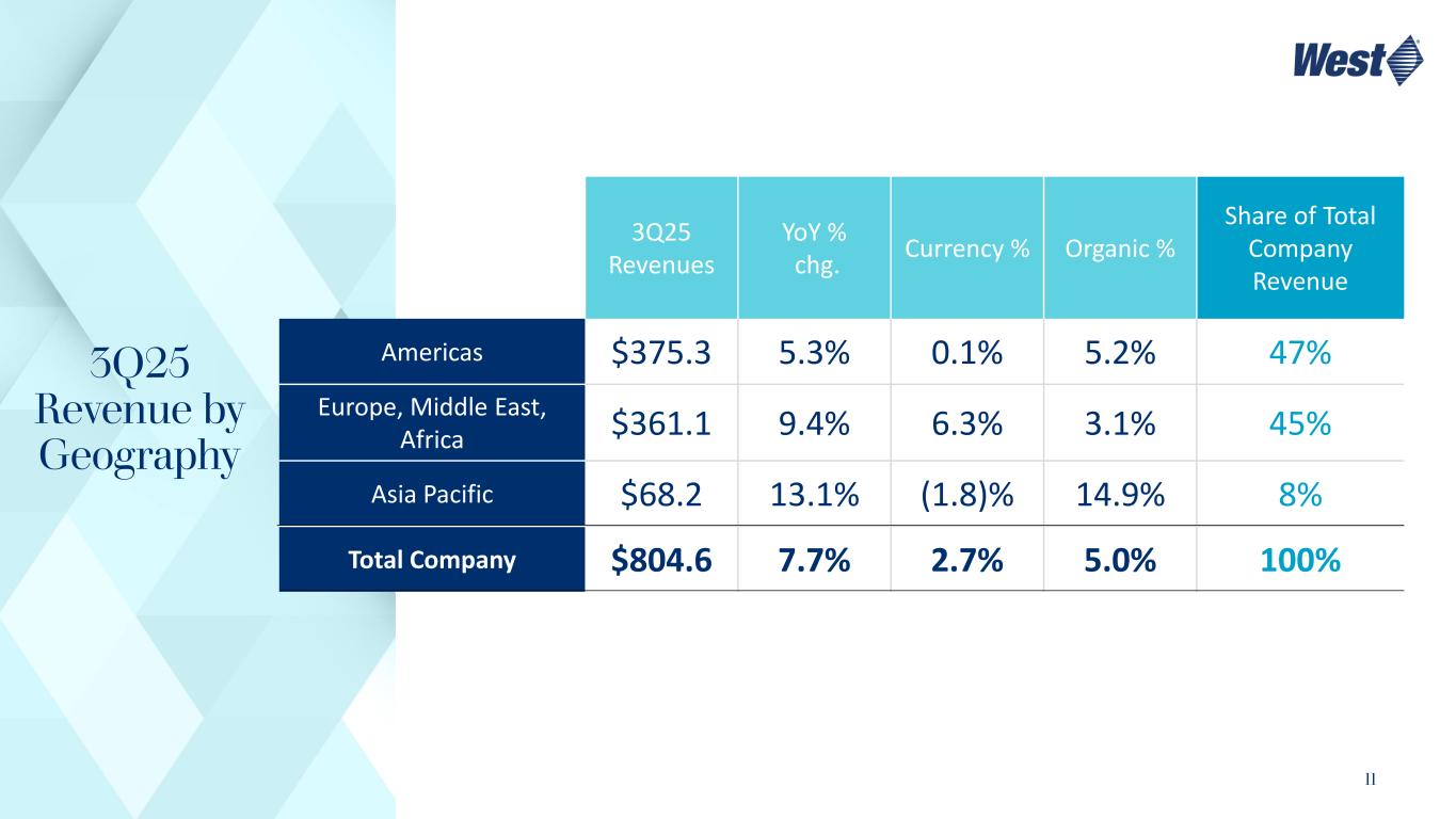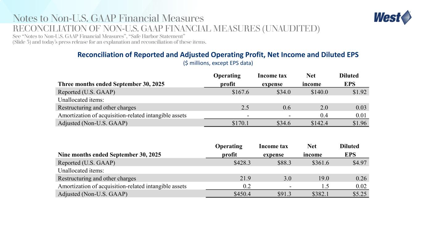ペンシルベニア州エクストン、2025年10月23日-革新的で高品質な注射剤ソリューションとサービスの大手プロバイダーであるウエスト・ファーマシューティカル・サービス(NYSE:WST)は本日、2025年第3四半期の業績を発表した。