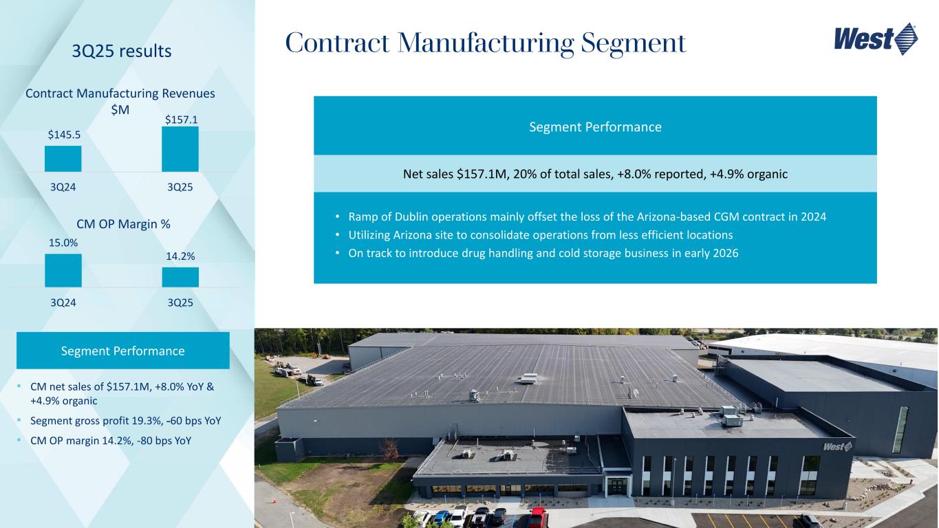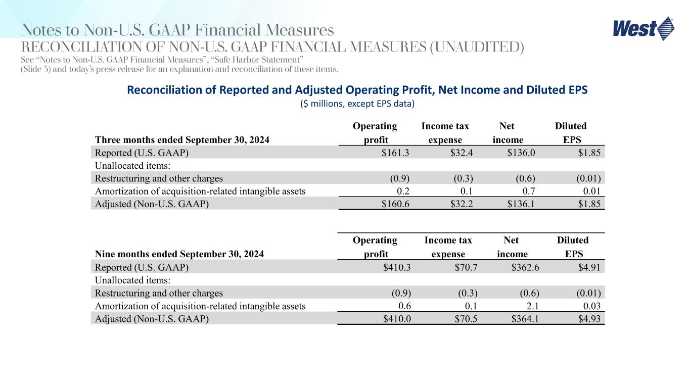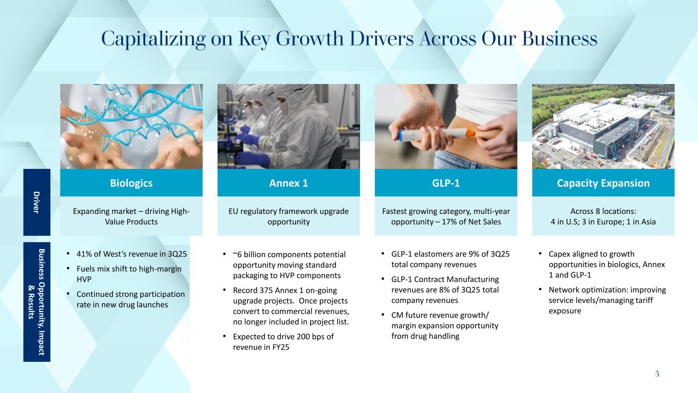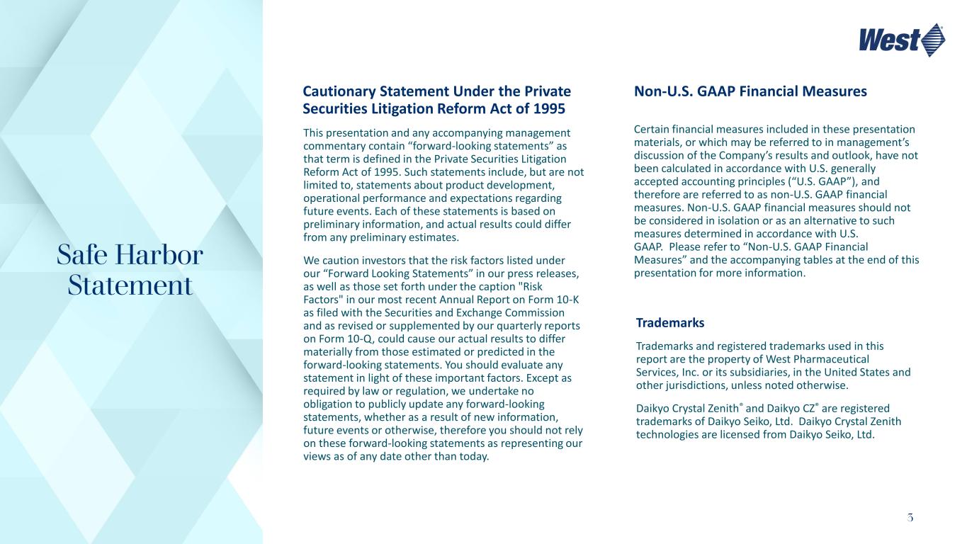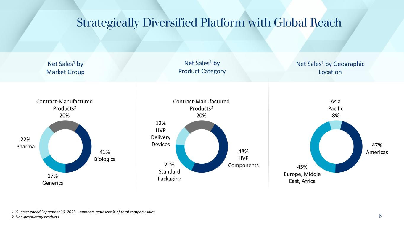 社長兼最高経営責任者兼取締役会会長のエリック・M・グリーンは次のようにコメントした:「当四半期も堅調に推移し、売上高、利益ともにガイダンスを上回ったことをご報告できることを嬉しく思います。当社の好調は、自社製品と受託製造の両セグメントにまたがる広範囲なものでした。GLP-1製品の継続的な実行、アネックス1を含むHVP転換の増加、全体的な需要環境の改善に牽引され、HVPコンポーネント事業は2桁成長を達成しました。当四半期の堅調な業績と事業の継続的なモメンタムの結果、通期ガイダンスの予想を再び上方修正します。"