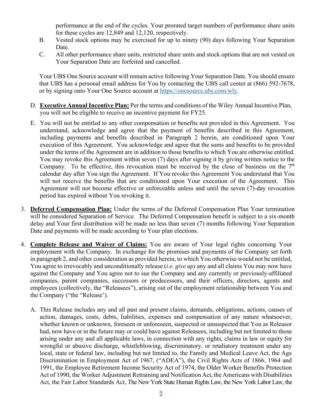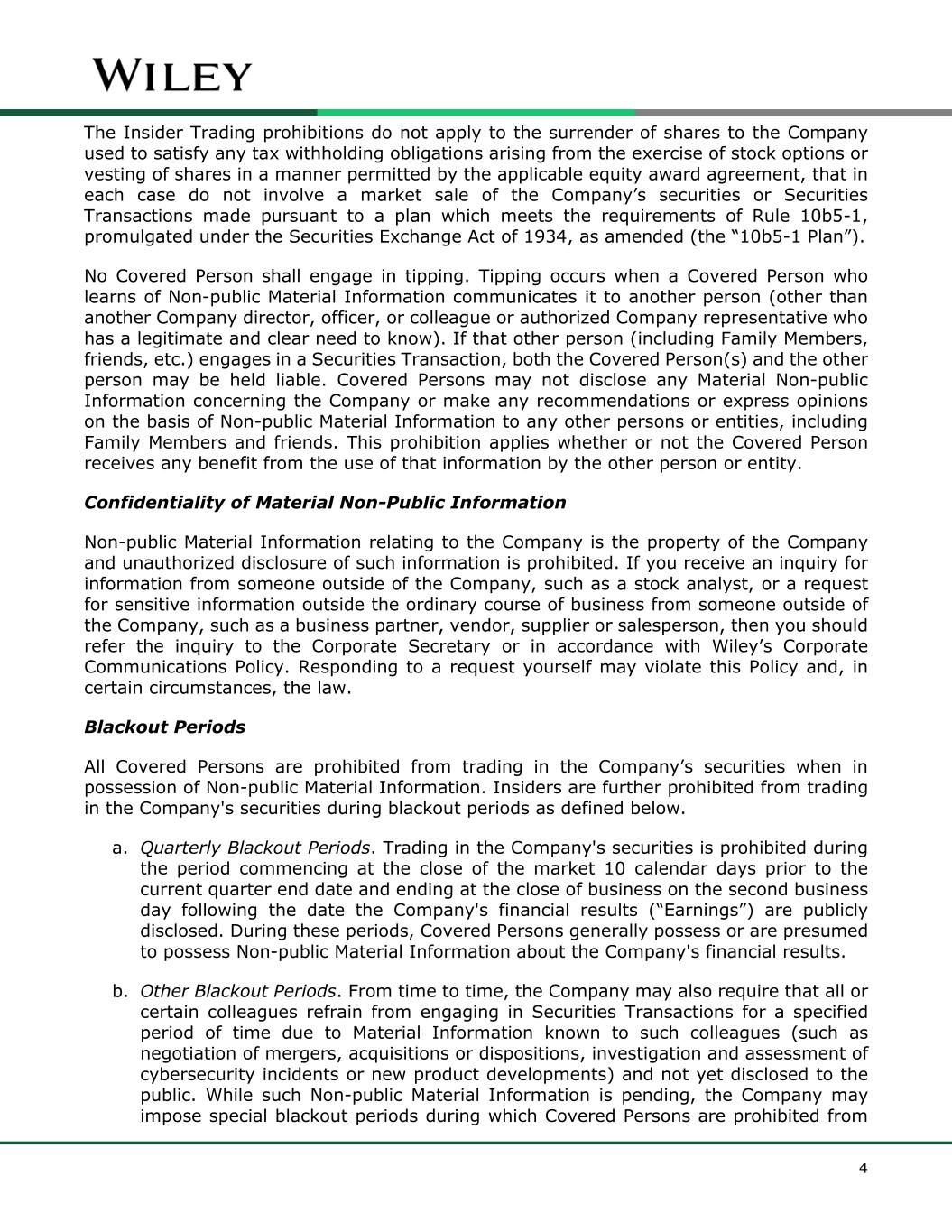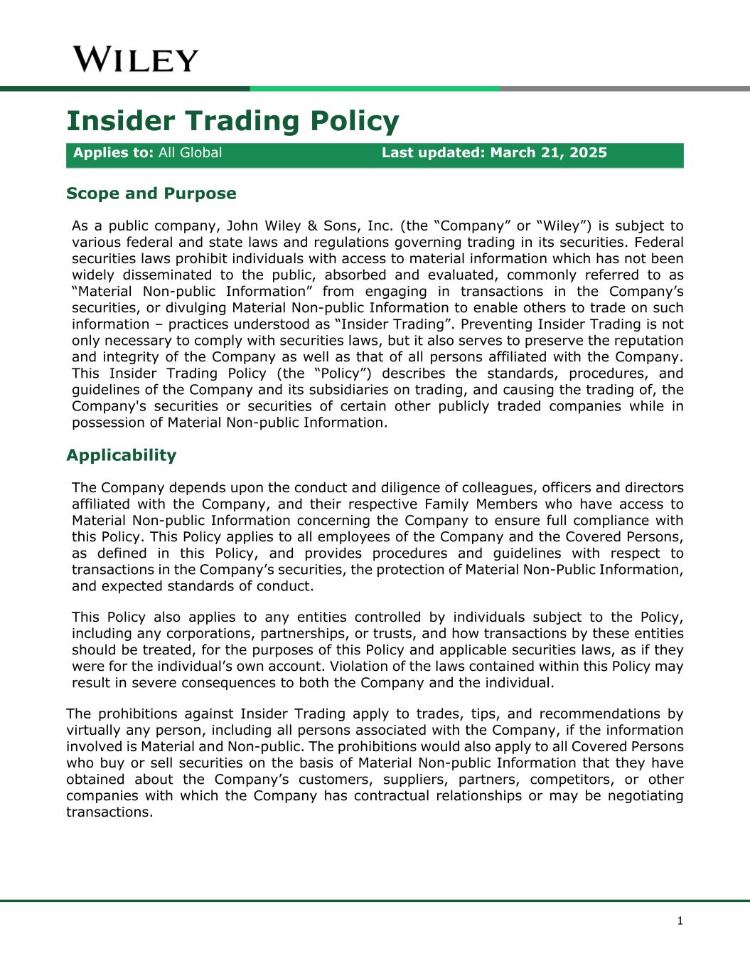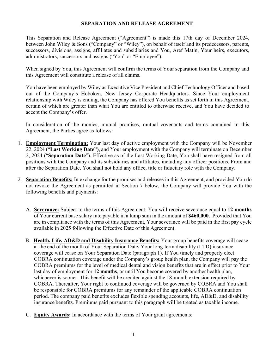 This report contains “forward-looking statements” within the meaning of the safe harbor provisions of the Private Securities Litigation Reform Act of 1995 concerning our business, consolidated financial condition, and results of operations. The Securities and Exchange Commission (SEC) encourages companies to disclose forward-looking information so that investors can better understand a company’s prospects and make informed investment decisions. Forward-looking statements are subject to risks and uncertainties, many of which are outside our control, which could cause actual results to differ materially from these statements. Therefore, you should not rely on any of these forward-looking statements. Forward-looking statements can be identified by such words as “anticipates,” “believes,” “plan,” “assumes,” “could,” “should,” “estimates,” “expects,” “intends,” “potential,” “seek,” “predict,” “may,” “will,” and similar references to future periods. All statements other than statements of historical facts included in this report regarding our strategies, prospects, financial condition, operations, costs, plans, and objectives are forward-looking statements. Examples of forward-looking statements include, among others, anticipated restructuring charges and savings, operations, performance, and financial condition. Reliance should not be placed on forward-looking statements, as actual results may differ materially from those described in any forward-looking statements. Any such forward-looking statements are based upon many assumptions and estimates that are inherently subject to uncertainties and contingencies, many of which are beyond our control, and are subject to change based on many important factors. Such factors include, but are not limited to (i) the level of investment by Wiley in new technologies and products; (ii) subscriber renewal rates for our journals; (iii) the financial stability and liquidity of journal subscription agents; (iv) the consolidation of book wholesalers and retail accounts; (v) the market position and financial stability of key retailers; (vi) the seasonal nature of our educational business and the impact of the used book market; (vii) worldwide economic and political conditions; (viii) our ability to protect our copyrights and other intellectual property worldwide; (ix) our ability to successfully integrate acquired operations and realize expected opportunities; (x) the ability to realize operating savings over time and in fiscal year 2026 in connection with our multiyear Global Restructuring Program and completed dispositions; (xi) cyber risk and the failure to maintain the integrity of our operational or security systems or infrastructure, or those of third parties with which we do business; (xii) as a result of acquisitions, we have and may record a significant amount of goodwill and other identifiable intangible assets and we may never realize the full carrying value of these assets; (xiii) our ability to leverage artificial intelligence technologies in our products and services, including generative artificial intelligence, large language models, machine learning, and other artificial intelligence tools; and (xiv) other factors detailed from time to time in our filings with the SEC. We undertake no obligation to update or revise any such forward-looking statements to reflect subsequent events or circumstances.