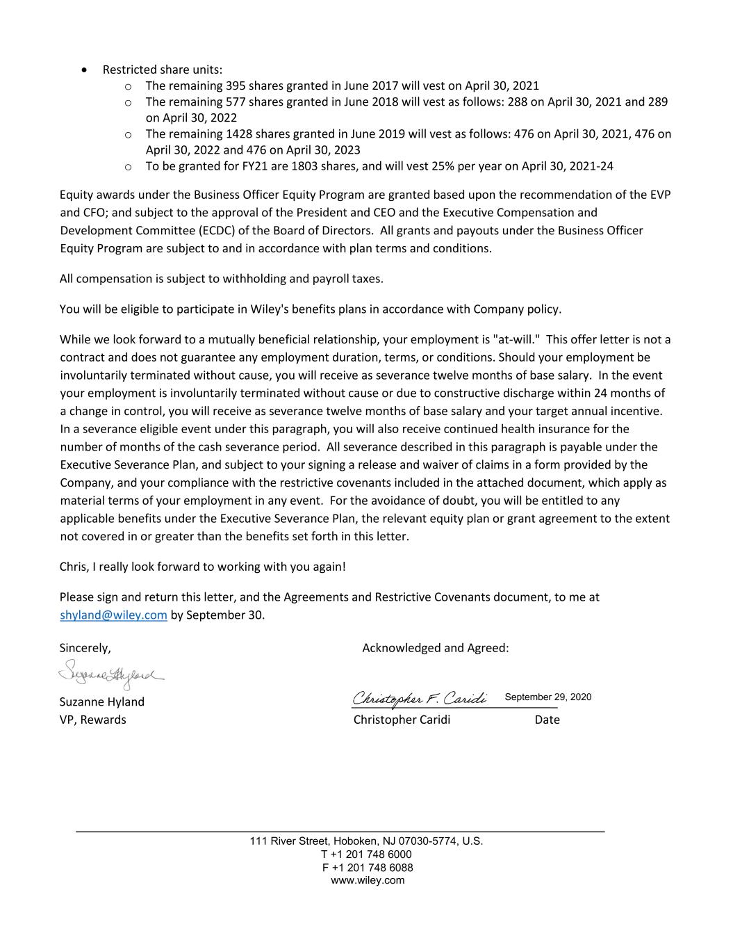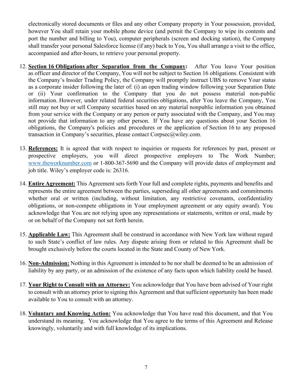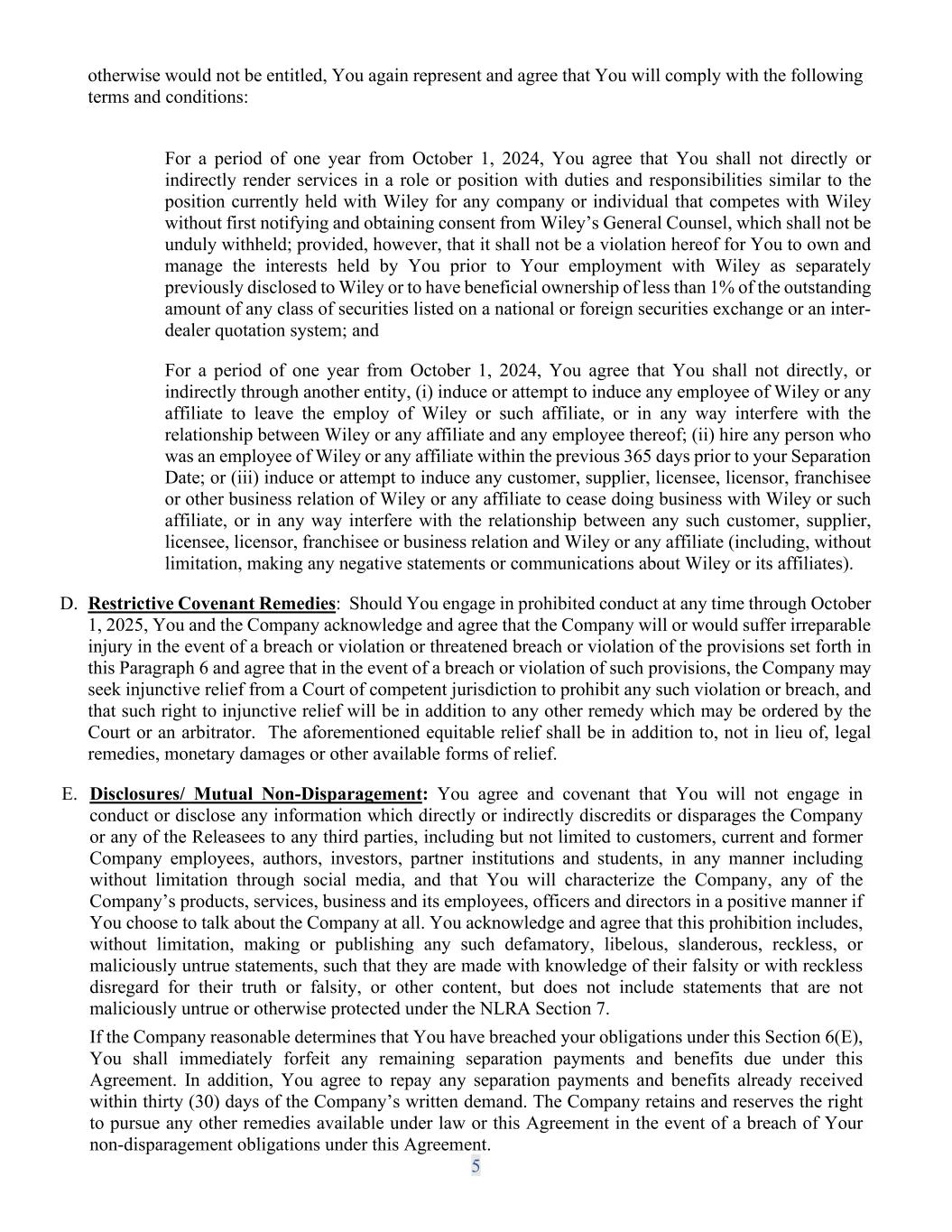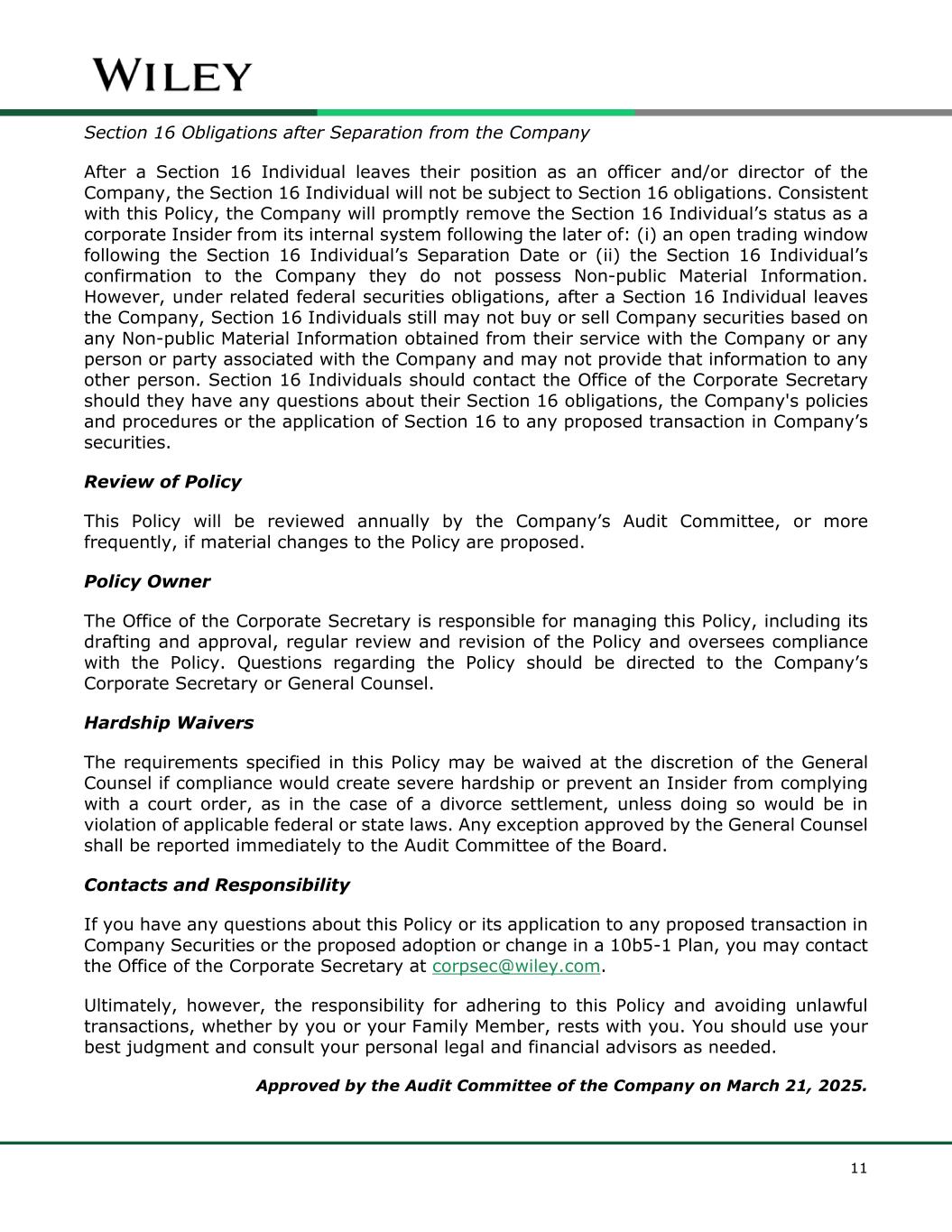 This report contains “forward-looking statements” within the meaning of the safe harbor provisions of the Private Securities Litigation Reform Act of 1995 concerning our business, consolidated financial condition, and results of operations. The Securities and Exchange Commission (SEC) encourages companies to disclose forward-looking information so that investors can better understand a company’s prospects and make informed investment decisions. Forward-looking statements are subject to risks and uncertainties, many of which are outside our control, which could cause actual results to differ materially from these statements. Therefore, you should not rely on any of these forward-looking statements. Forward-looking statements can be identified by such words as “anticipates,” “believes,” “plan,” “assumes,” “could,” “should,” “estimates,” “expects,” “intends,” “potential,” “seek,” “predict,” “may,” “will,” and similar references to future periods. All statements other than statements of historical facts included in this report regarding our strategies, prospects, financial condition, operations, costs, plans, and objectives are forward-looking statements. Examples of forward-looking statements include, among others, anticipated restructuring charges and savings, operations, performance, and financial condition. Reliance should not be placed on forward-looking statements, as actual results may differ materially from those described in any forward-looking statements. Any such forward-looking statements are based upon many assumptions and estimates that are inherently subject to uncertainties and contingencies, many of which are beyond our control, and are subject to change based on many important factors. Such factors include, but are not limited to (i) the level of investment by Wiley in new technologies and products; (ii) subscriber renewal rates for our journals; (iii) the financial stability and liquidity of journal subscription agents; (iv) the consolidation of book wholesalers and retail accounts; (v) the market position and financial stability of key retailers; (vi) the seasonal nature of our educational business and the impact of the used book market; (vii) worldwide economic and political conditions; (viii) our ability to protect our copyrights and other intellectual property worldwide; (ix) our ability to successfully integrate acquired operations and realize expected opportunities; (x) the ability to realize operating savings over time and in fiscal year 2026 in connection with our multiyear Global Restructuring Program and completed dispositions; (xi) cyber risk and the failure to maintain the integrity of our operational or security systems or infrastructure, or those of third parties with which we do business; (xii) as a result of acquisitions, we have and may record a significant amount of goodwill and other identifiable intangible assets and we may never realize the full carrying value of these assets; (xiii) our ability to leverage artificial intelligence technologies in our products and services, including generative artificial intelligence, large language models, machine learning, and other artificial intelligence tools; and (xiv) other factors detailed from time to time in our filings with the SEC. We undertake no obligation to update or revise any such forward-looking statements to reflect subsequent events or circumstances.