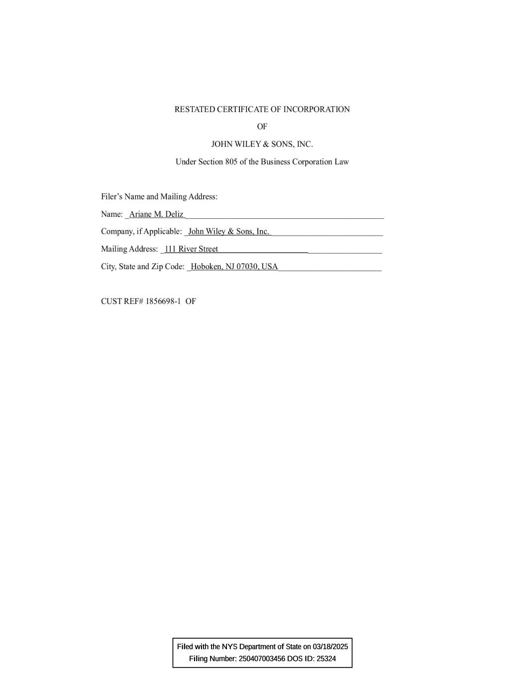 In connection with the Annual Report of John Wiley & Sons, Inc. (the “Company”) on Form 10-K for the year ended April 30, 2025 as filed with the Securities and Exchange Commission on the date hereof (the “Report”), I, Matthew S. Kissner, President and Chief Executive Officer of the Company, certify, pursuant to 18 U.S.C. Section 1350, as adopted pursuant to Section 906 of the Sarbanes-Oxley Act of 2002, that based on my knowledge: