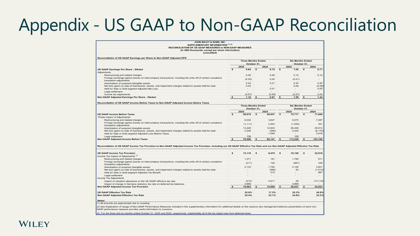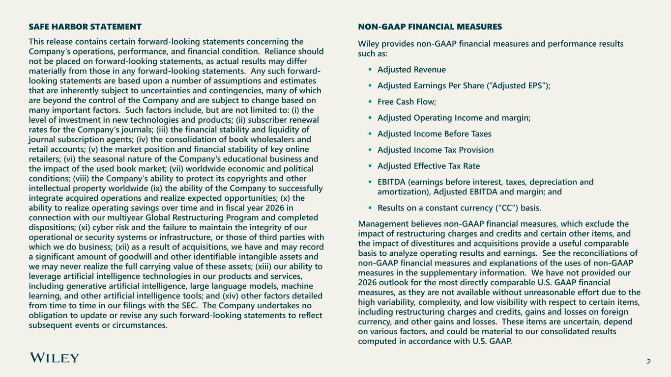 Wiley provides non-GAAP financial measures and performance results such as “Adjusted EPS,” “Adjusted Operating Income and Margin,” “EBITDA, Adjusted EBITDA and Margin,” “Adjusted Income before Taxes,” “Adjusted Income Tax Provision,” “Adjusted Effective Tax Rate,” “Free Cash Flow less Product Development Spending,” “Adjusted Revenue,” and results on a Constant Currency basis to assess underlying business performance and trends. Management believes non-GAAP financial measures, which exclude the impact of restructuring charges and credits and certain other items, and the impact of divestitures and acquisitions provide a useful comparable basis to analyze operating results and earnings. See the reconciliations of non-GAAP financial measures and explanations of the uses of non-GAAP measures in the supplementary information. We have not provided our 2026 outlook for the most directly comparable U.S. GAAP financial measures, as they are not available without unreasonable effort due to the high variability, complexity, and low visibility with respect to certain items, including restructuring charges and credits, gains and losses on foreign currency, and other gains and losses. These items are uncertain, depend on various factors, and could be material to our consolidated results computed in accordance with U.S. GAAP.