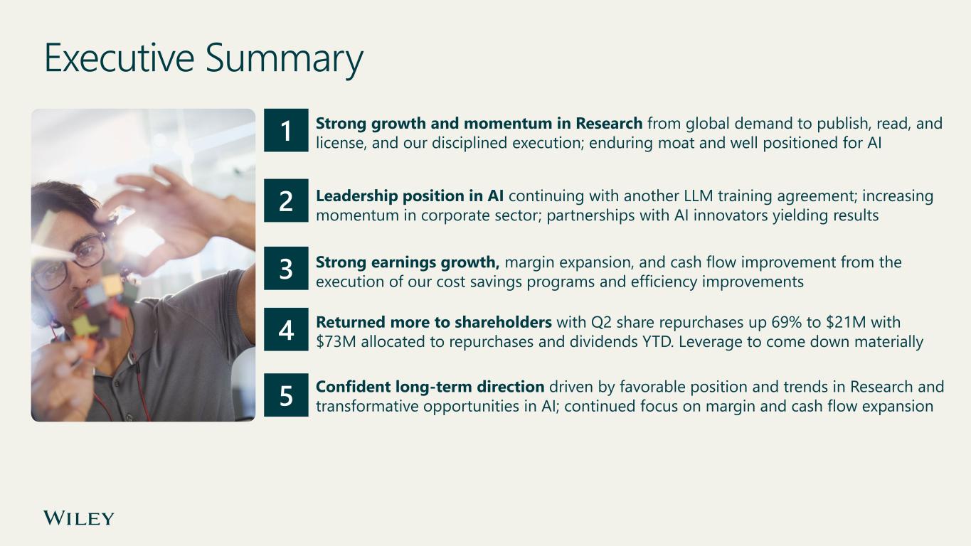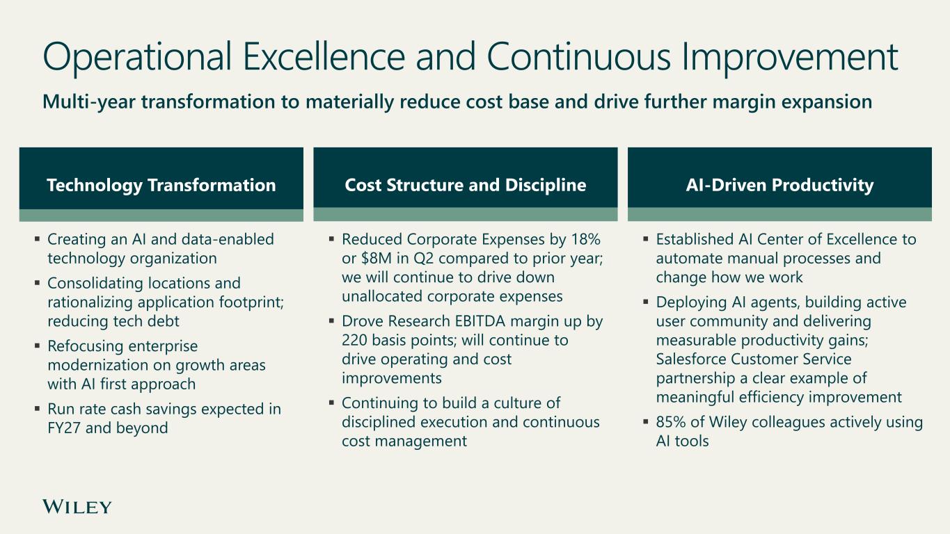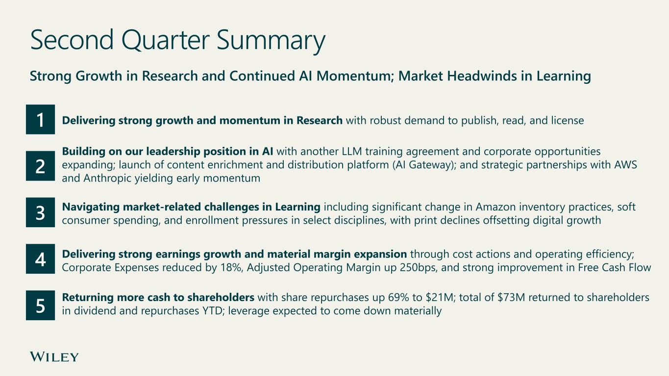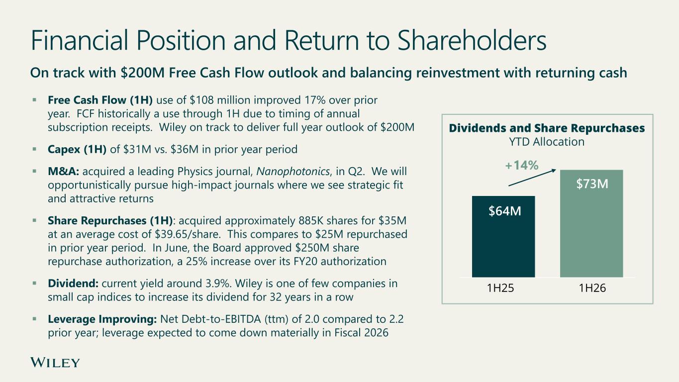 •Returns to Shareholders: Wiley allocated $40 million in the quarter toward both repurchases ($21 million) and dividends ($19 million), up 26% over prior year. The Company acquired approximately 553,000 shares at an average cost of $38.11/share. Year-to-date, Wiley allocated $73 million to repurchases and dividends. During the first half, the Board approved a $250 million share repurchase authorization, deployed a 10b5-1 plan for repurchases outside open windows, and raised its dividend for the 32nd consecutive year.