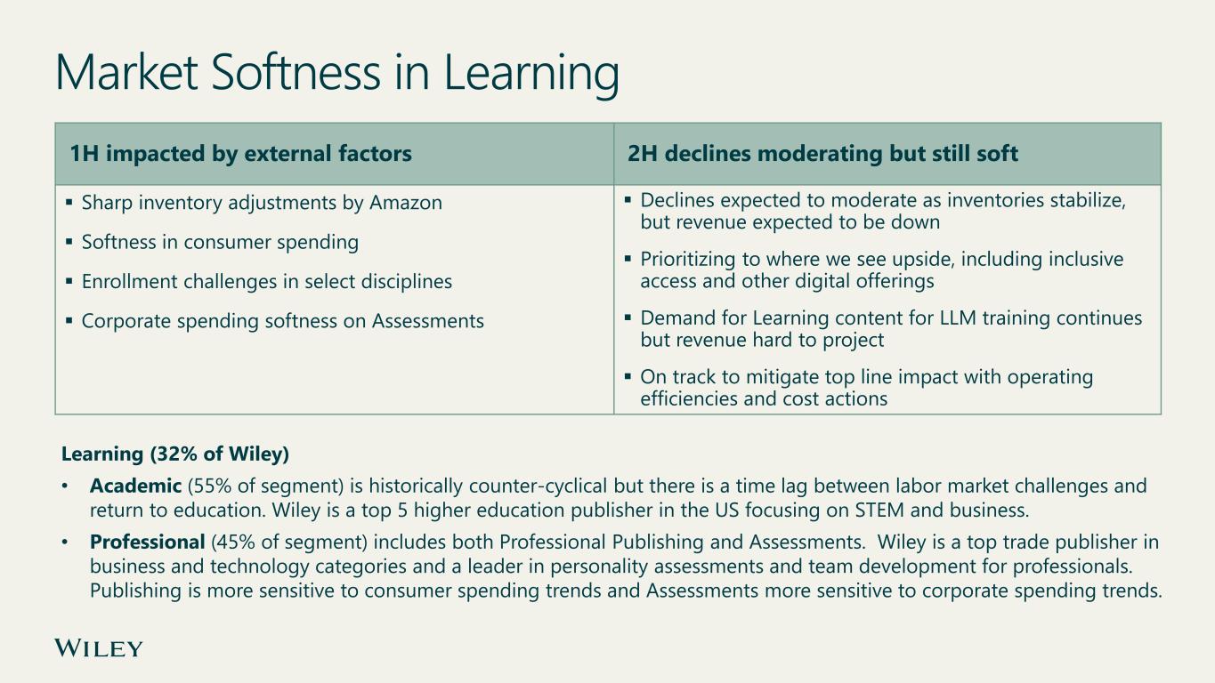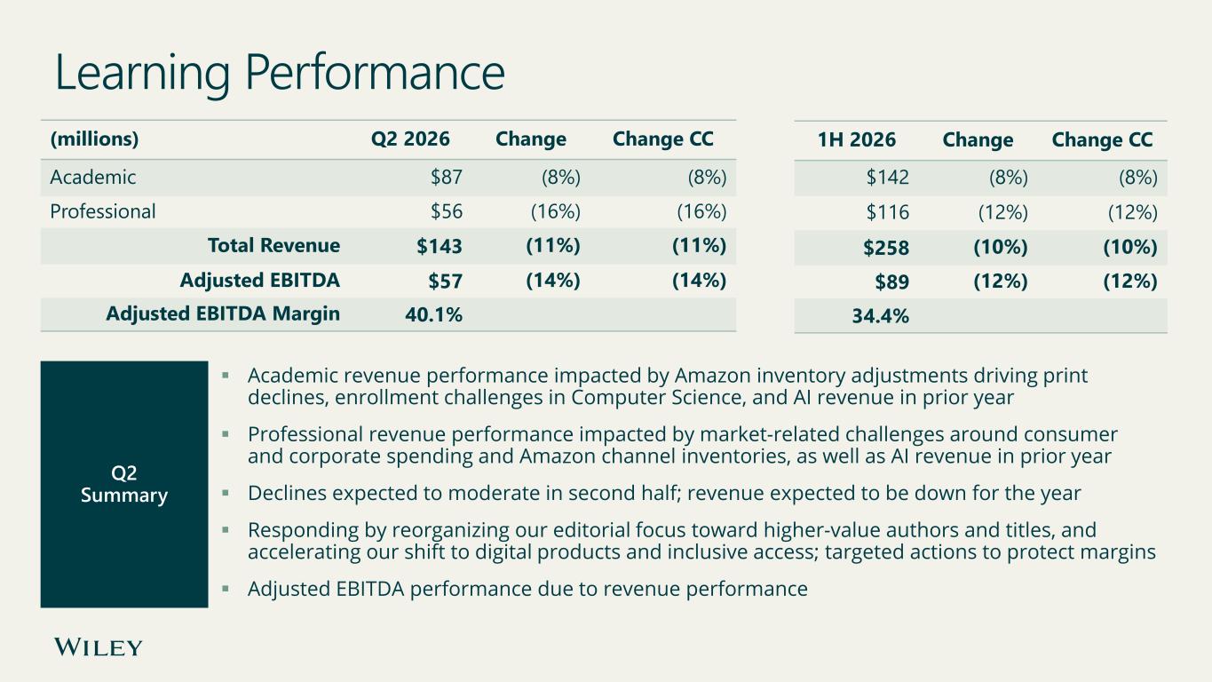 •Q2 Learning revenue of $143 million was down 11% as reported and at constant currency due to market-related softness, including a sharp inventory drop off at an online retailer and a slowdown in consumer and corporate spending. Professional was down 16%. Academic was down 8%. Learning was also impacted by $4 million of AI revenue in the prior year. Across the segment, print declines more than offset digital growth. Year-to-date, Learning revenue was down 10% as reported and at constant currency. Declines are expected to moderate in the second half of the year as retail inventory levels stabilize.