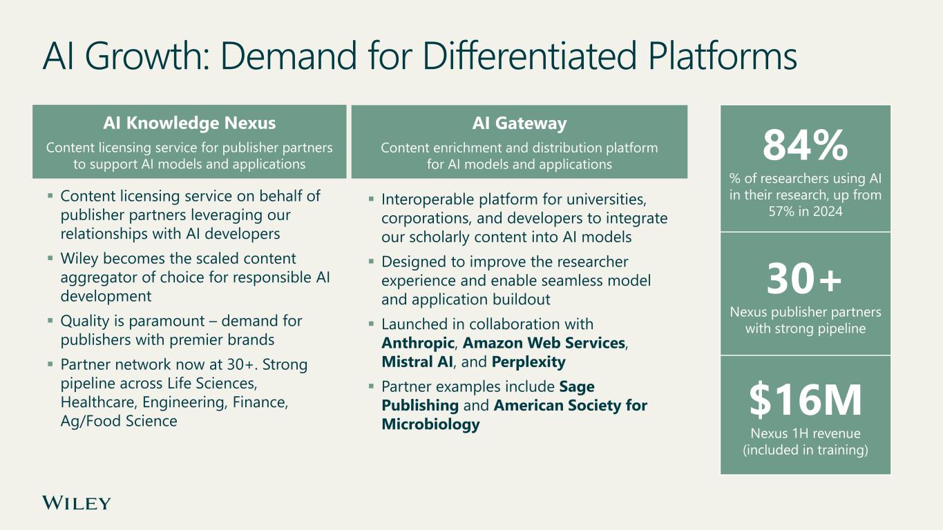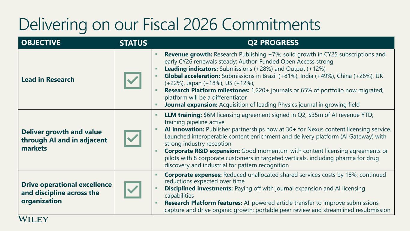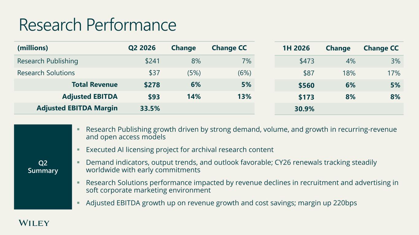•Q2 Research revenue of $279 million was up 6% as reported and 5% at constant currency driven by 7% growth in Research Publishing including AI revenue of $5 million. Article submissions and output rose by 28% and 12%, respectively, with robust growth across all key geographies. Strong volume drove double-digit growth in author-funded open access and solid growth in Wiley’s recurring revenue models, combining subscriptions and transformational agreements. Year-to-date, Research revenue was up 6% as reported and 5% at constant currency.