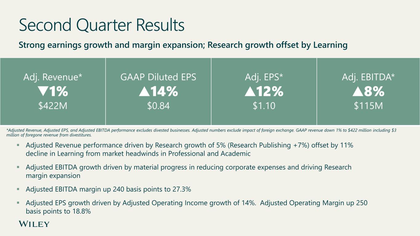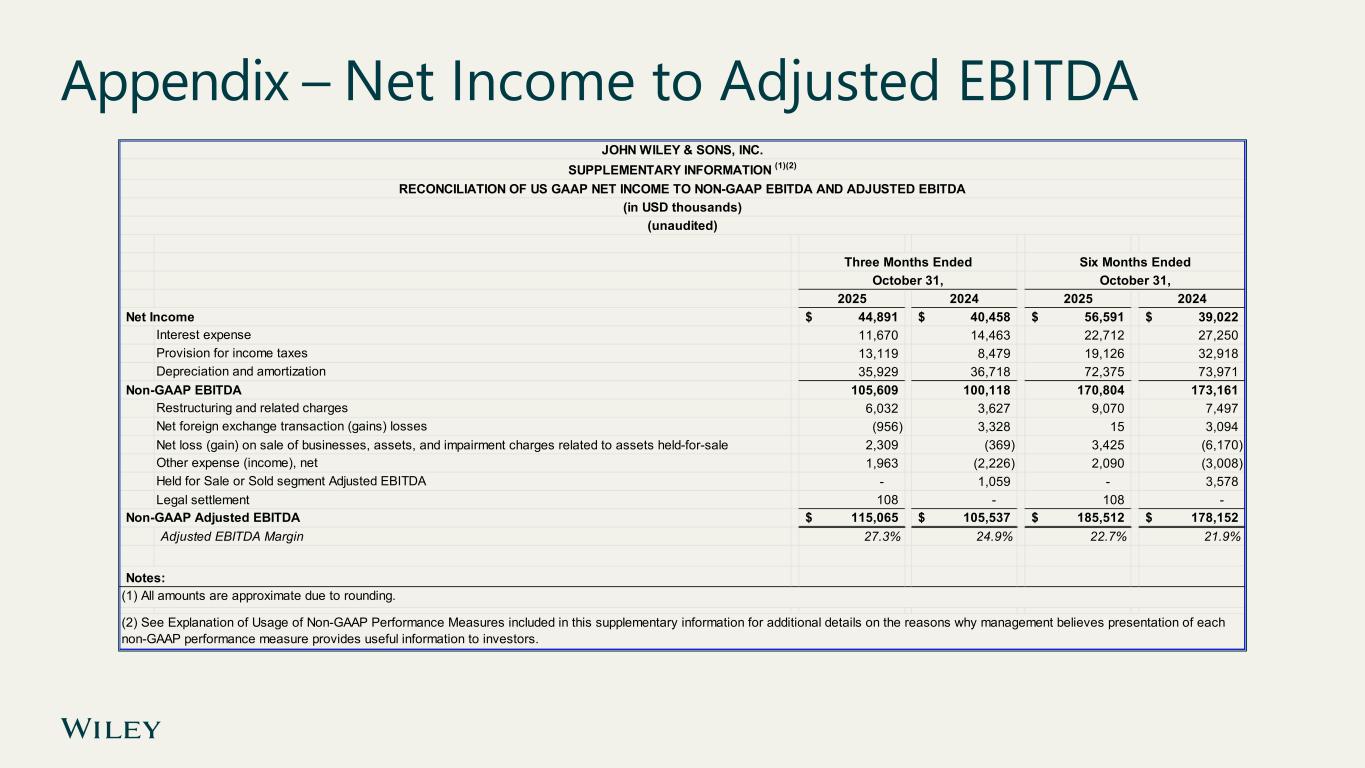 December 4, 2025 - Hoboken, NJ – Wiley (NYSE: WLY), a global leader in authoritative content and research intelligence for the advancement of scientific discovery, innovation, and learning, today reported results for the second quarter ended October 31, 2025.