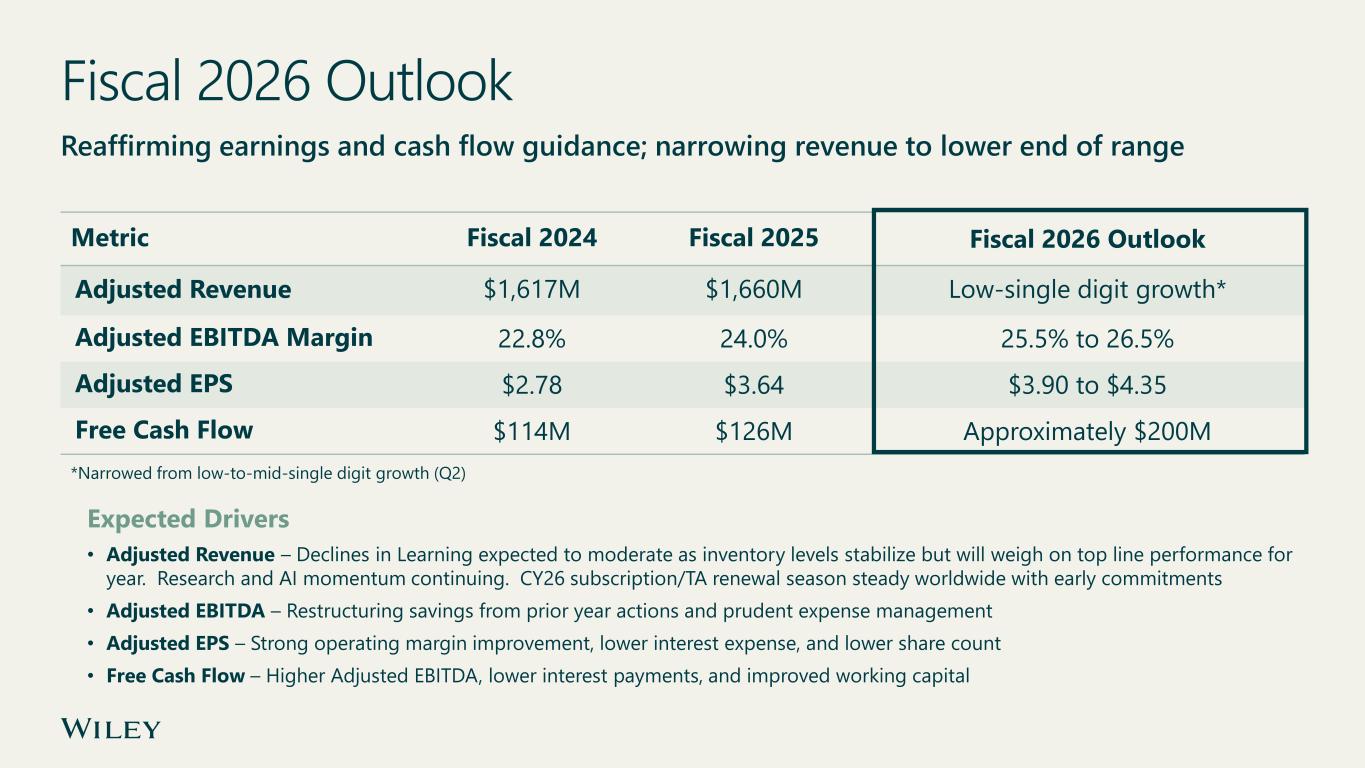 Wiley is reaffirming its full year outlook for Adjusted EBITDA margin, Adjusted EPS, and Free Cash Flow and narrowing its Revenue guidance to the low end of the range due to market challenges in Learning. Research and AI momentum are expected to remain strong. The revenue range is narrowed to low-single digit growth from low-to-mid single digit growth.