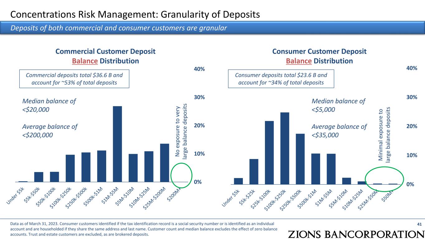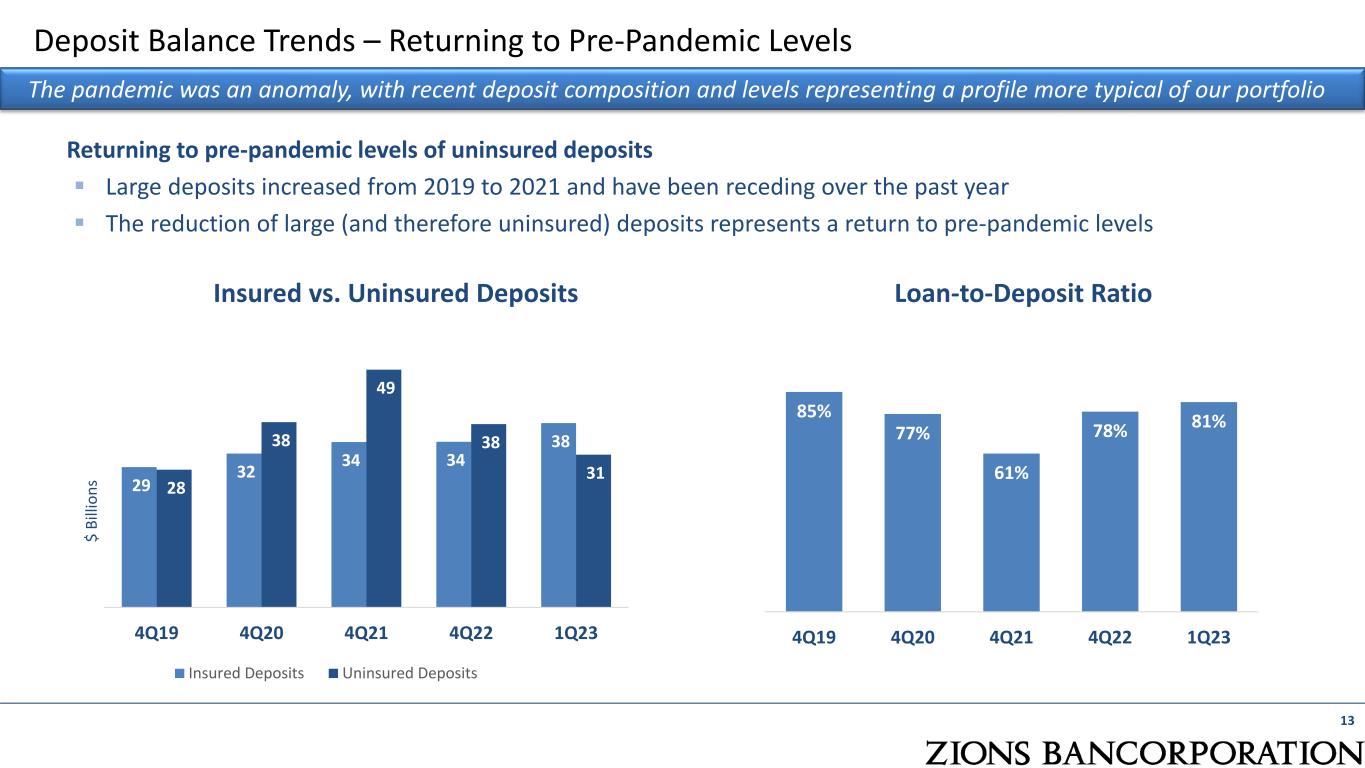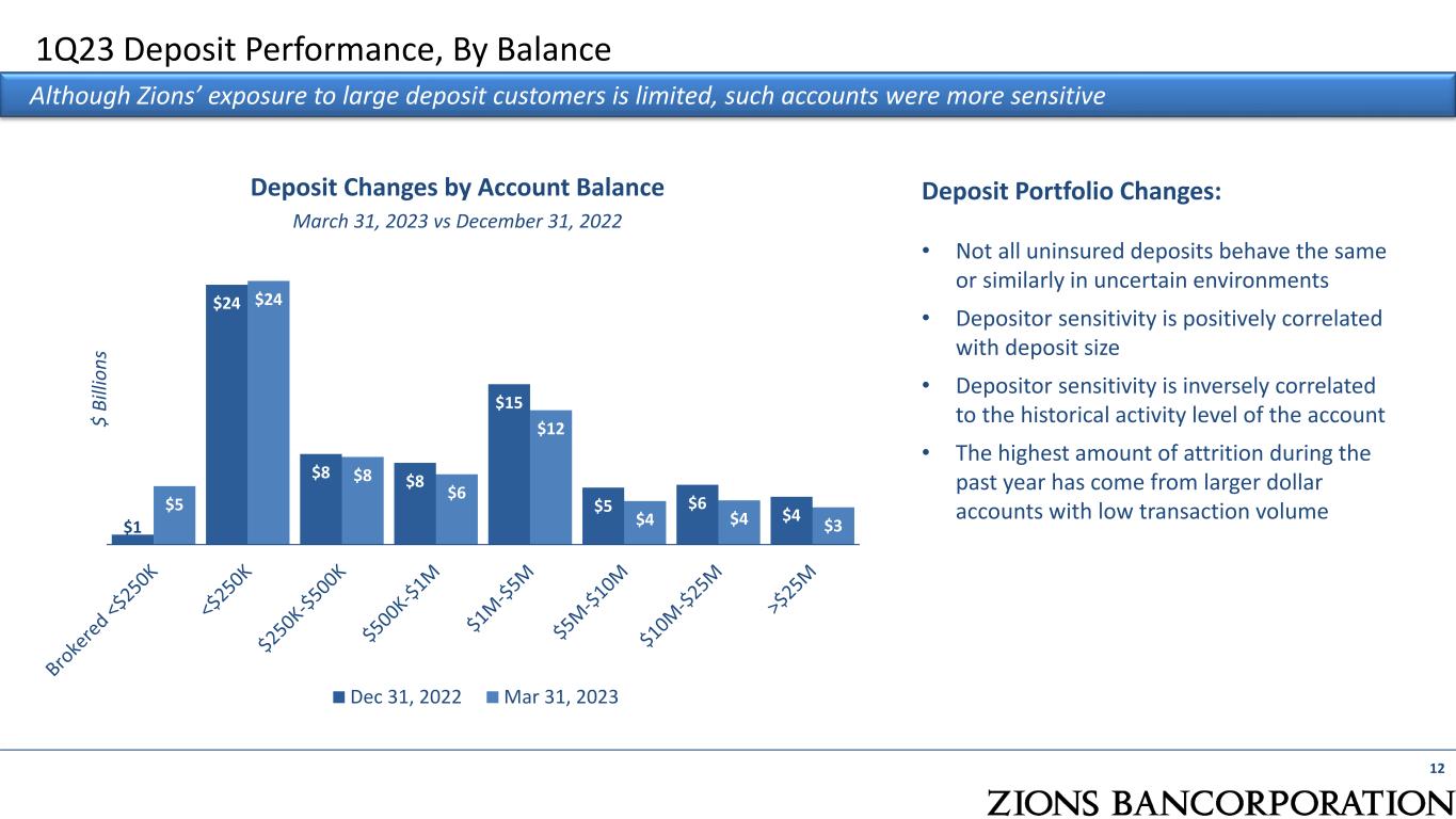 | ザイオンス・バンコーポレーションの会長兼CEOであるハリス・H・シモンズは、「当行および他の多くの銀行が第1四半期に出した基本的に堅調な業績は、3月中旬の2つの著名な銀行の破綻を受け、流動性と資本力に対する懸念によって影をひそめた。業界全体の預金は、パンデミック時に急速に増加した後、最近の四半期では減少していました。当行や他の銀行は、これらの銀行破綻によるマイナスの影響を受けましたが、当行の預金(仲介預金を除く)は四半期末時点でパンデミック前(19/12/31)の水準を18%上回っており、この間に非利息の要求預金は31%増加、ローンは16%増加しました。"当四半期は、正味の償却がなく、引き続き強力な信用指標で、非常に良好な信用力を証明し続けました。これは、金利が上昇する中で固定金利の収益資産の価値が低下する中で、小規模の中核的な営業預金口座の価値が上昇したことを一部反映しています。商業用不動産(CRE)ポートフォリオに注目が集まる中、当行は長年にわたりこのポートフォリオの成長を慎重に管理してきました。過去10年間、当社のCREポートフォリオの複利年率はわずか2.5%であり、現在不良債権となっているのはポートフォリオのわずか0.1%に過ぎません」。シモンズ氏は続けて、「最後に、当四半期の出来事により、資金調達ミックスとコストの変化が加速し、当面の四半期収益の「ランレート」が約4%減少すると見込んでいますが、営業コストへの注力を強化することにより、この影響の一部を相殺できると考えています」と述べました。 |
