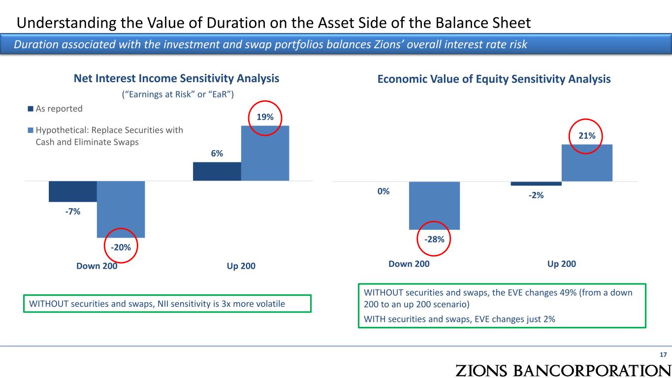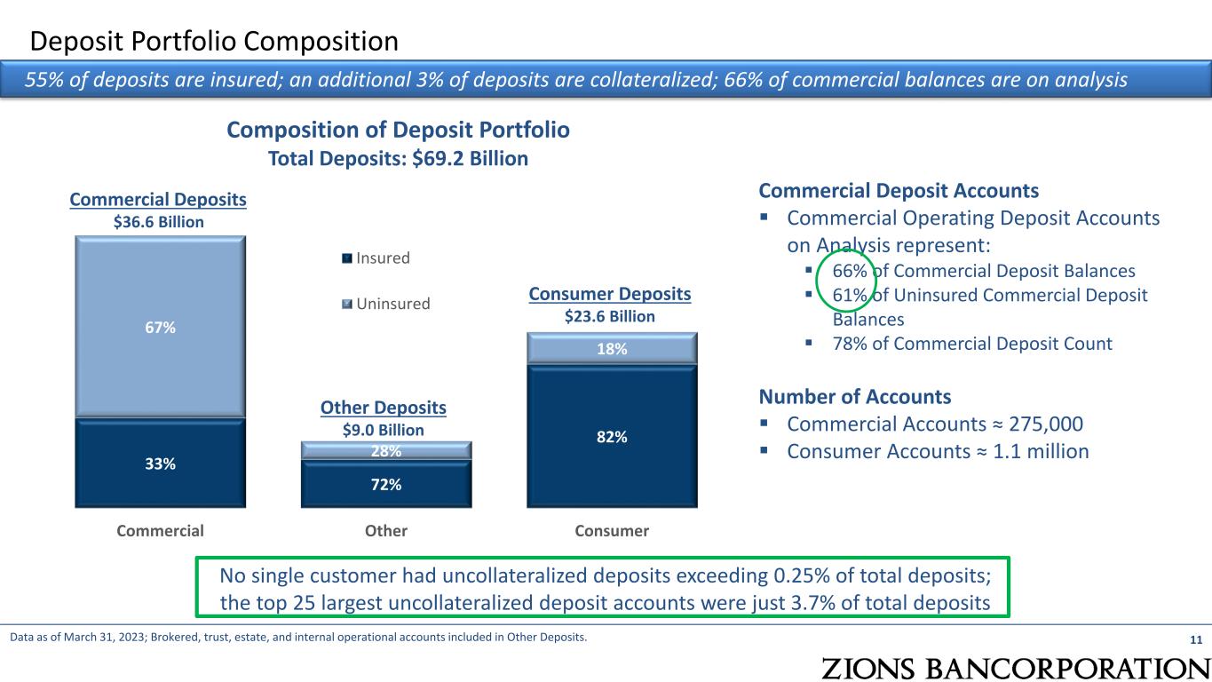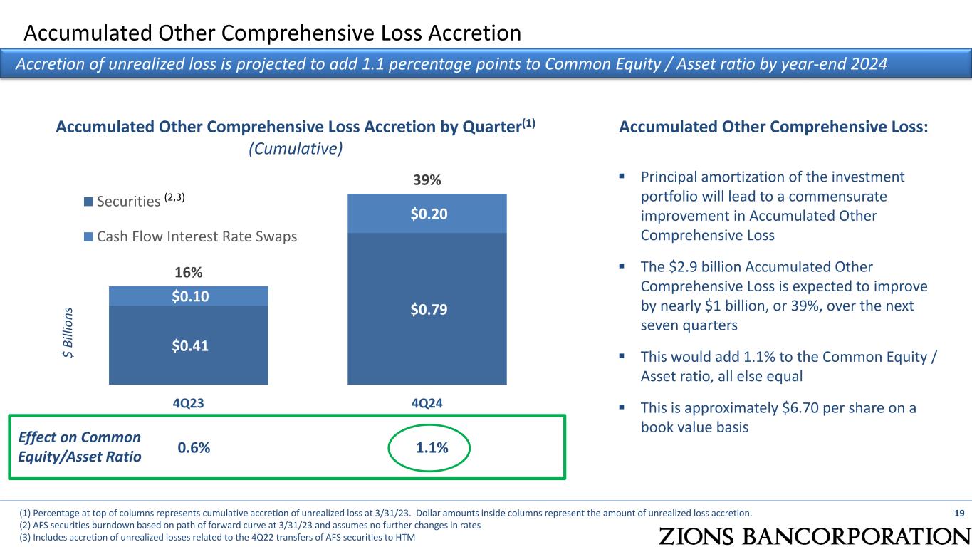 | ザイオンス・バンコーポレーションの会長兼CEOであるハリス・H・シモンズは、「当行および他の多くの銀行が第1四半期に出した基本的に堅調な業績は、3月中旬の2つの著名な銀行の破綻を受け、流動性と資本力に対する懸念によって影をひそめた。業界全体の預金は、パンデミック時に急速に増加した後、最近の四半期では減少していました。当行や他の銀行は、これらの銀行破綻によるマイナスの影響を受けましたが、当行の預金(仲介預金を除く)は四半期末時点でパンデミック前(19/12/31)の水準を18%上回っており、この間に非利息の要求預金は31%増加、ローンは16%増加しました。"当四半期は、正味の償却がなく、引き続き強力な信用指標で、非常に良好な信用力を証明し続けました。これは、金利が上昇する中で固定金利の収益資産の価値が低下する中で、小規模の中核的な営業預金口座の価値が上昇したことを一部反映しています。商業用不動産(CRE)ポートフォリオに注目が集まる中、当行は長年にわたりこのポートフォリオの成長を慎重に管理してきました。過去10年間、当社のCREポートフォリオの複利年率はわずか2.5%であり、現在不良債権となっているのはポートフォリオのわずか0.1%に過ぎません」。シモンズ氏は続けて、「最後に、当四半期の出来事により、資金調達ミックスとコストの変化が加速し、当面の四半期収益の「ランレート」が約4%減少すると見込んでいますが、営業コストへの注力を強化することにより、この影響の一部を相殺できると考えています」と述べました。 |