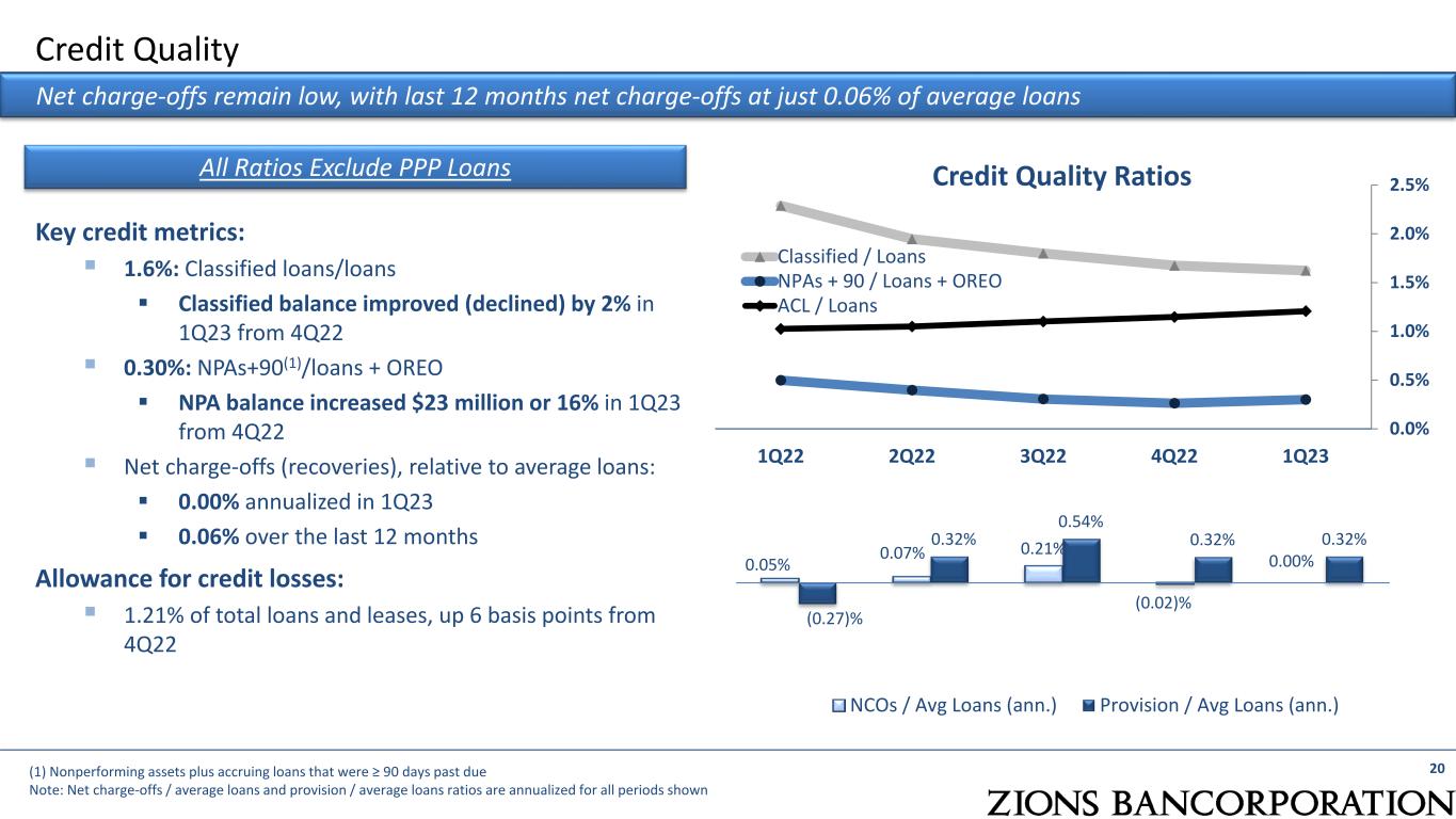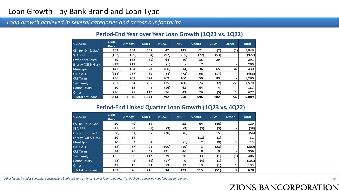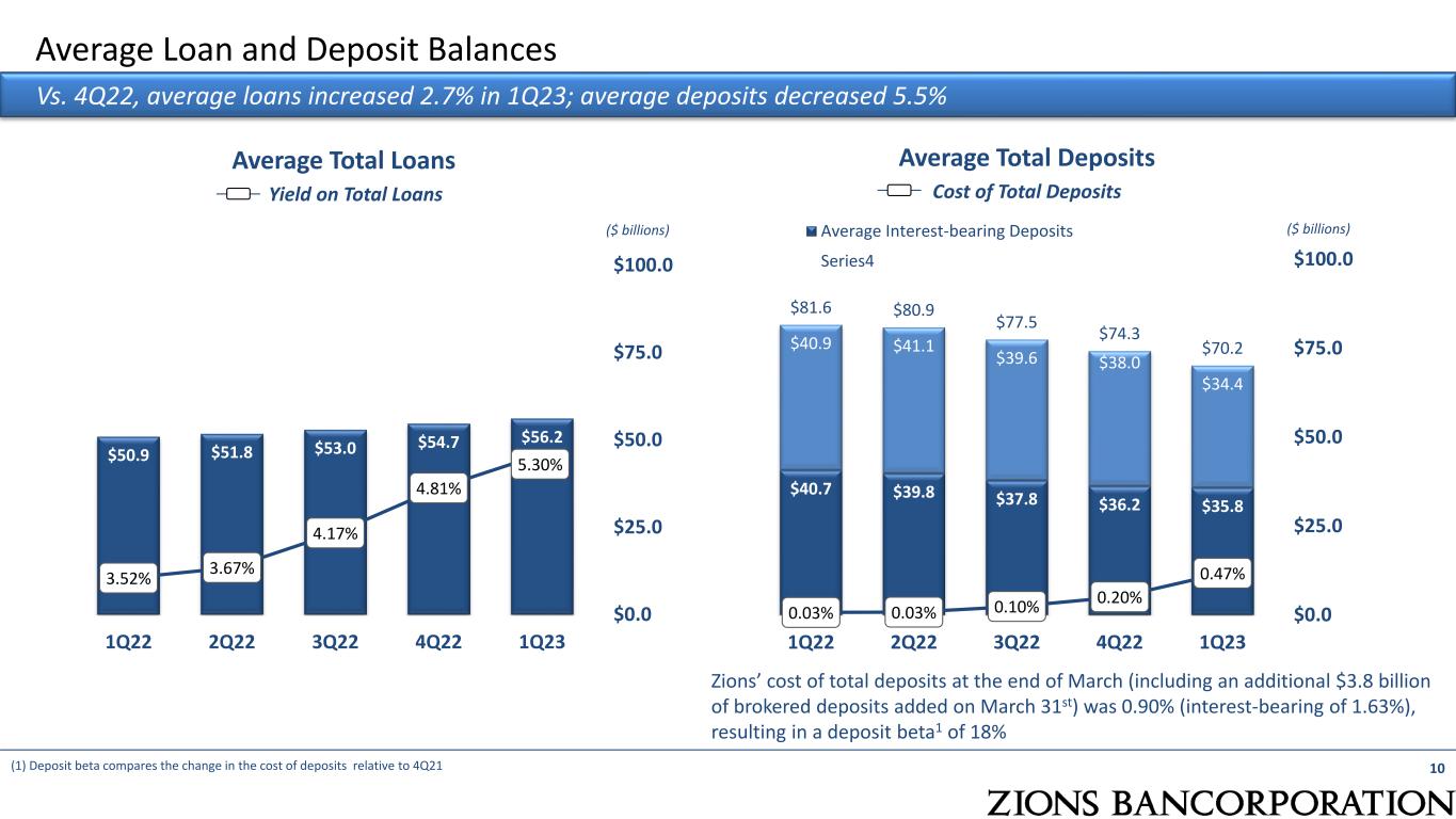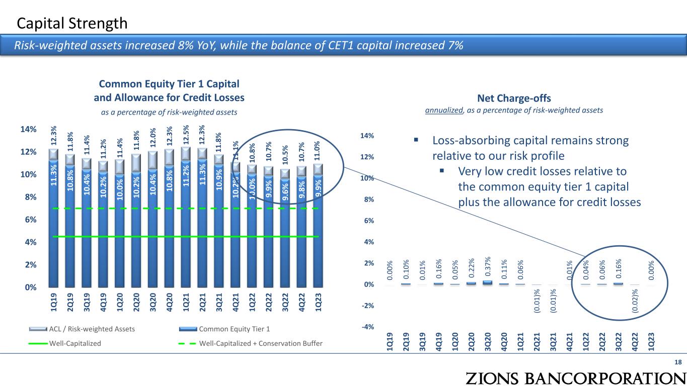 Harris H. Simmons, Chairman and CEO of Zions Bancorporation, commented, “The fundamentally solid results that we and many other banks produced in the first quarter were overshadowed by concerns about liquidity and capital strength in the wake of two prominent bank failures in mid-March. Deposits across the industry had been declining in recent quarters after growing rapidly during the pandemic, and although we and other banks experienced negative impacts from these bank failures, our own deposits (excluding any brokered deposits) at quarter end were 18% greater than pre-pandemic (12/31/19) levels, with noninterest-bearing demand deposits up 31% during that period, and loans up 16%.