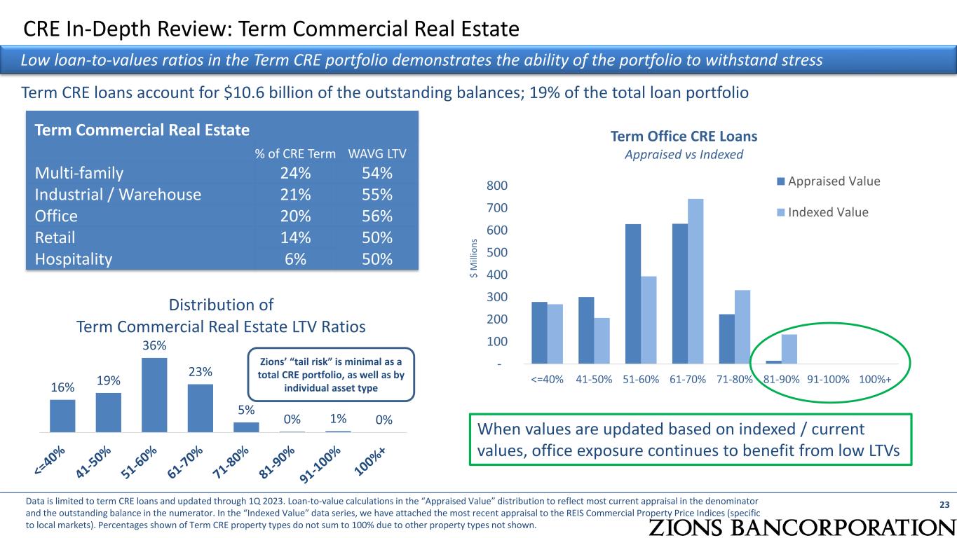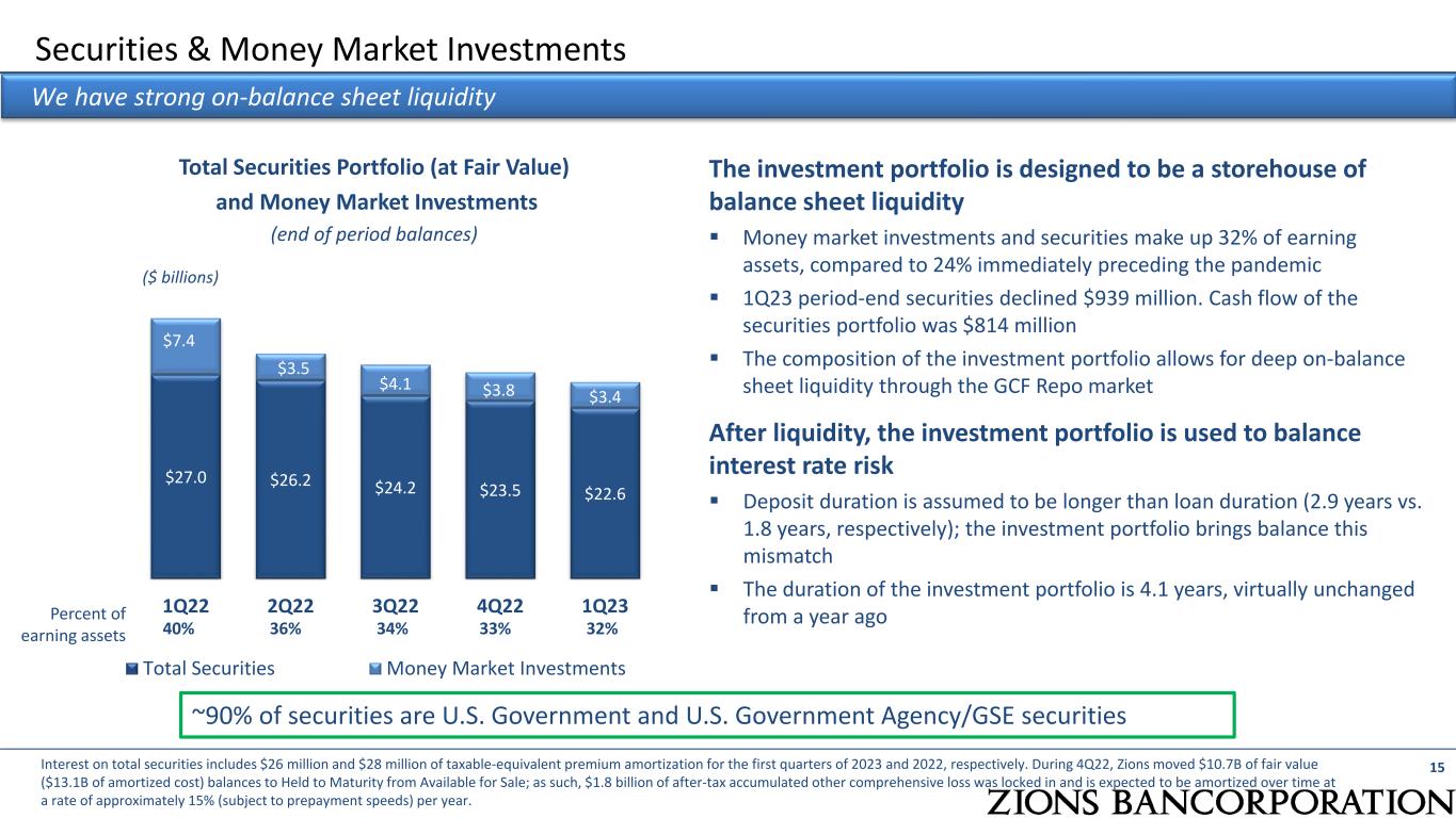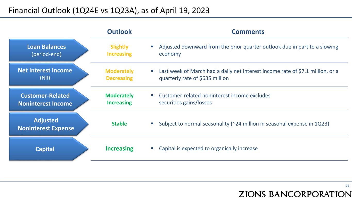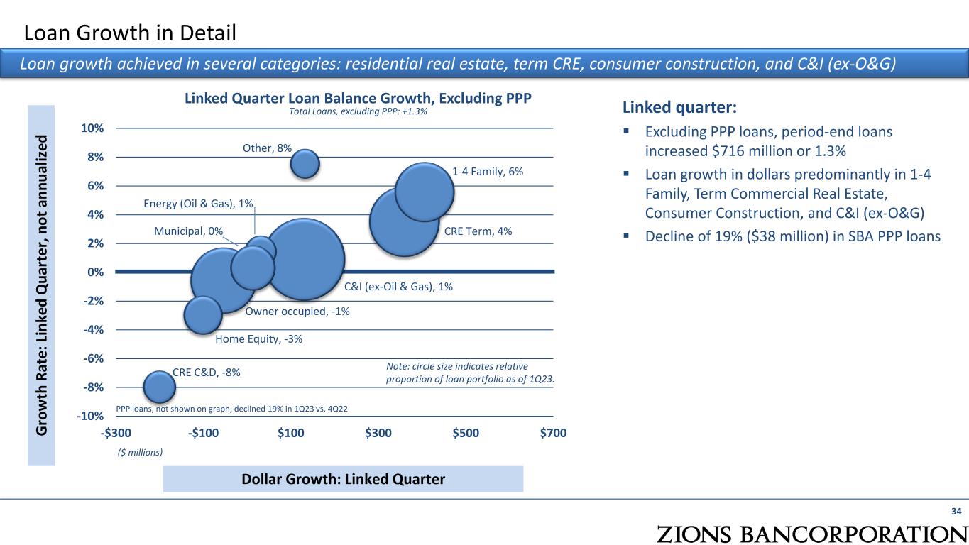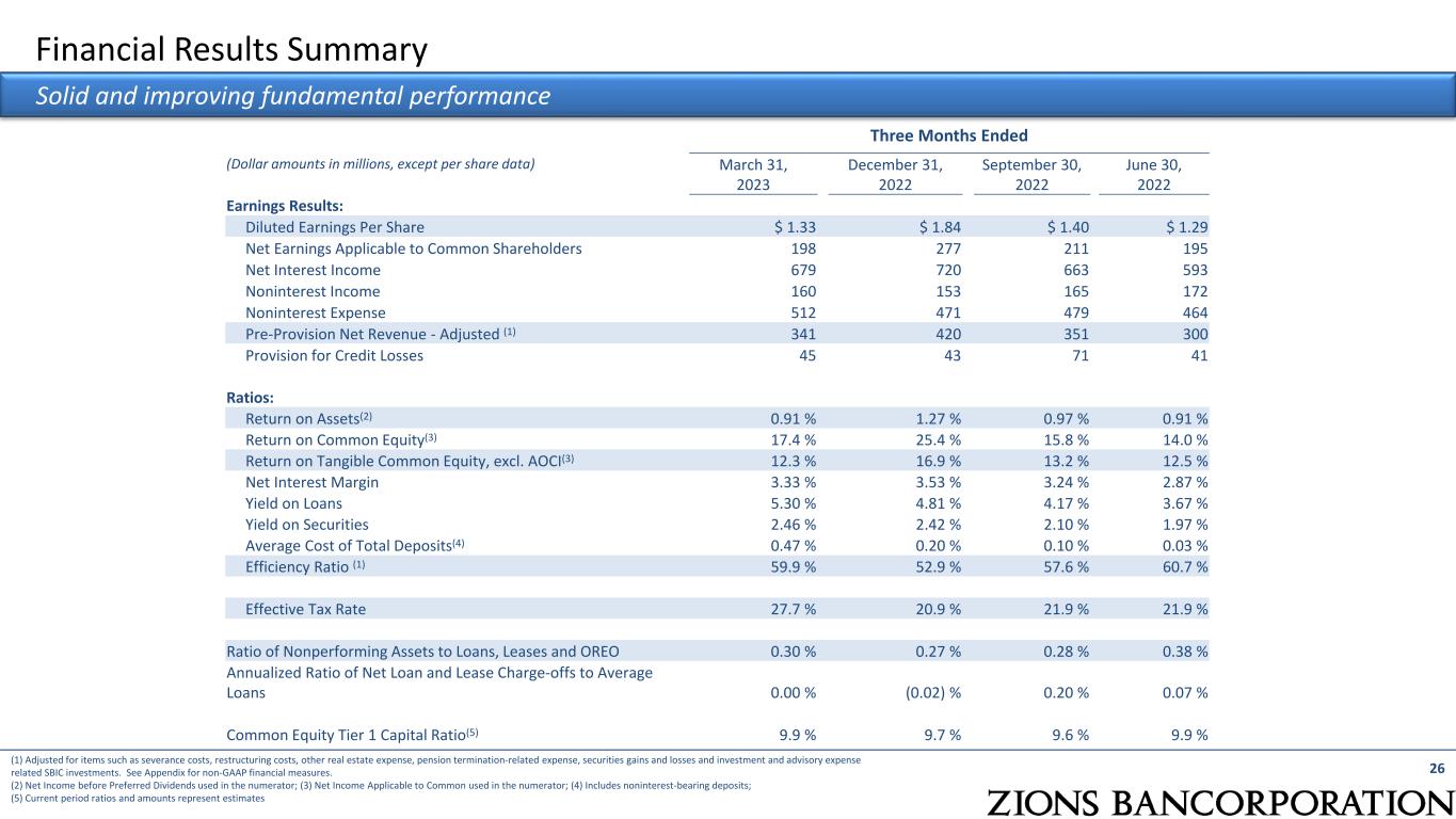 Harris H. Simmons, Chairman and CEO of Zions Bancorporation, commented, “The fundamentally solid results that we and many other banks produced in the first quarter were overshadowed by concerns about liquidity and capital strength in the wake of two prominent bank failures in mid-March. Deposits across the industry had been declining in recent quarters after growing rapidly during the pandemic, and although we and other banks experienced negative impacts from these bank failures, our own deposits (excluding any brokered deposits) at quarter end were 18% greater than pre-pandemic (12/31/19) levels, with noninterest-bearing demand deposits up 31% during that period, and loans up 16%.