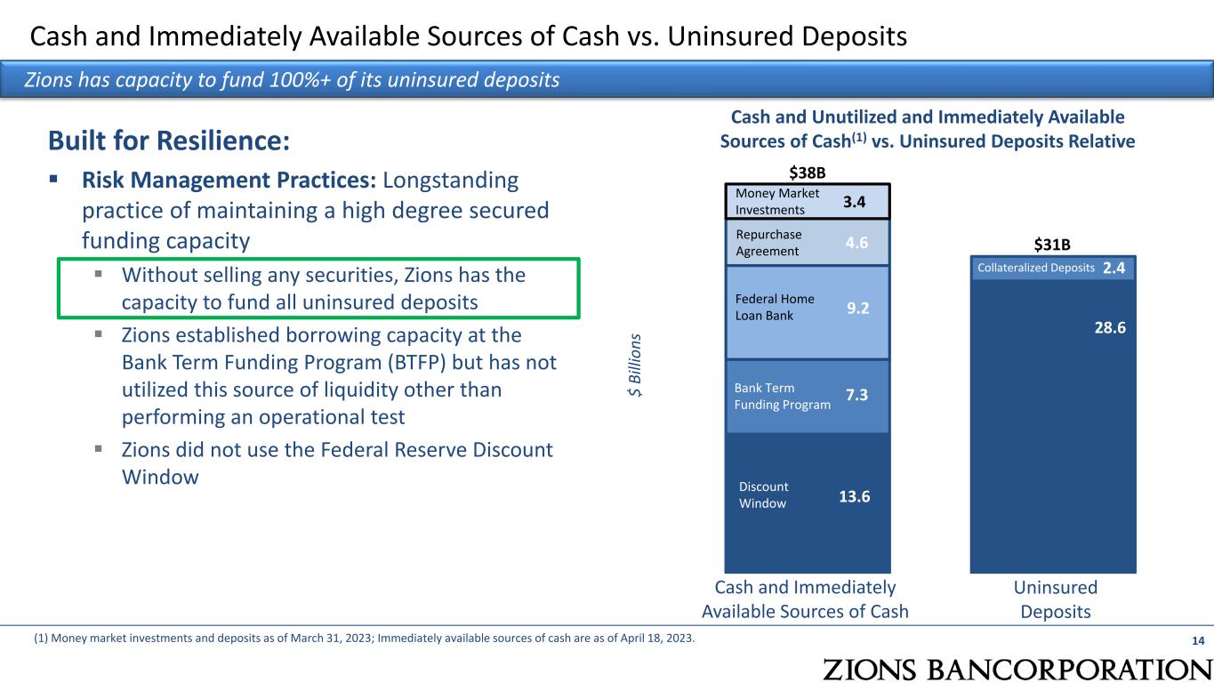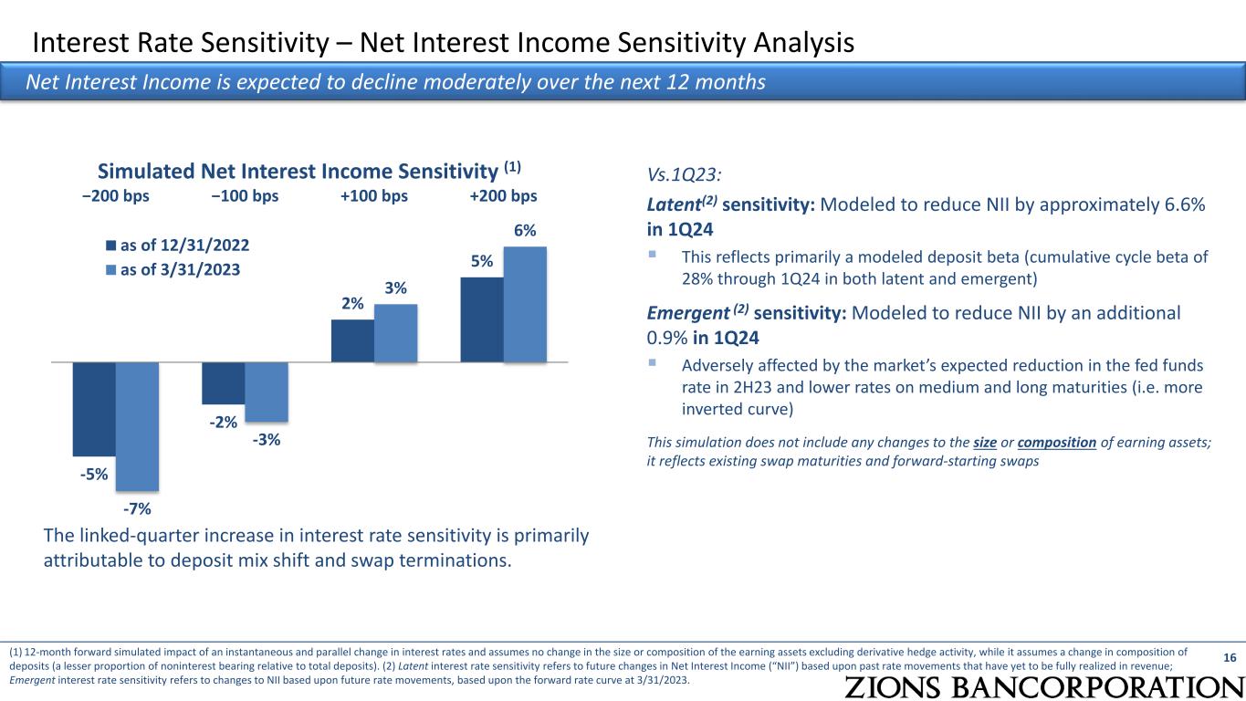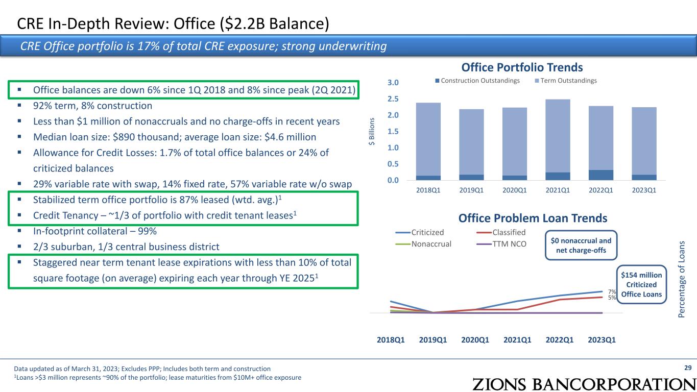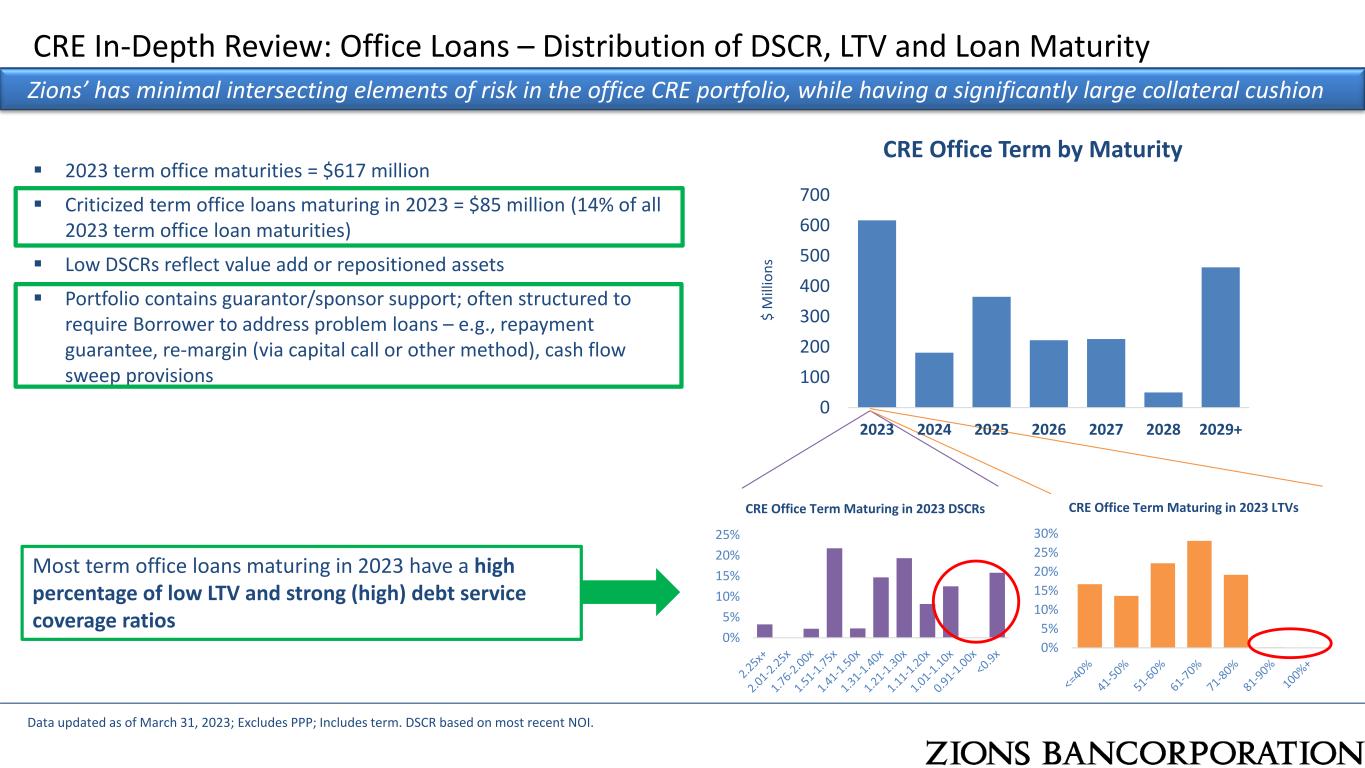 Harris H. Simmons, Chairman and CEO of Zions Bancorporation, commented, “The fundamentally solid results that we and many other banks produced in the first quarter were overshadowed by concerns about liquidity and capital strength in the wake of two prominent bank failures in mid-March. Deposits across the industry had been declining in recent quarters after growing rapidly during the pandemic, and although we and other banks experienced negative impacts from these bank failures, our own deposits (excluding any brokered deposits) at quarter end were 18% greater than pre-pandemic (12/31/19) levels, with noninterest-bearing demand deposits up 31% during that period, and loans up 16%.