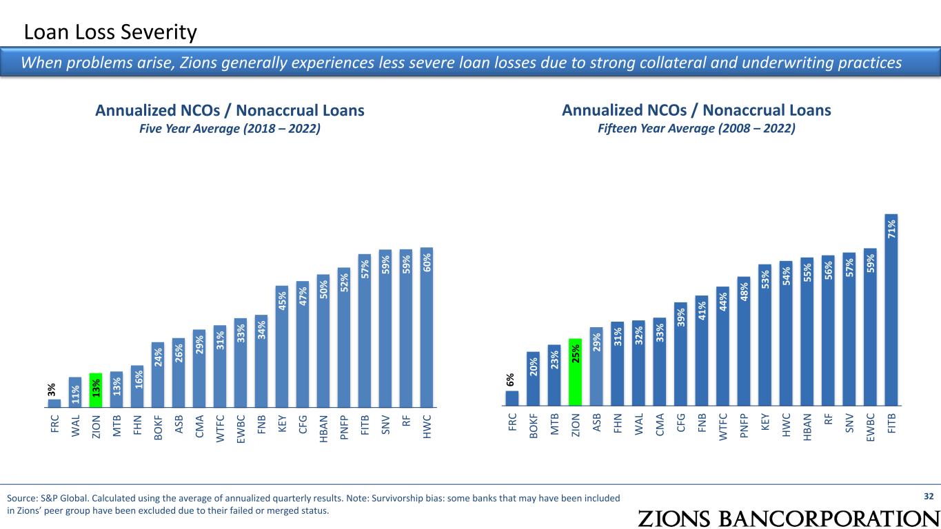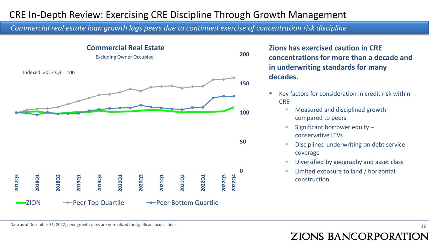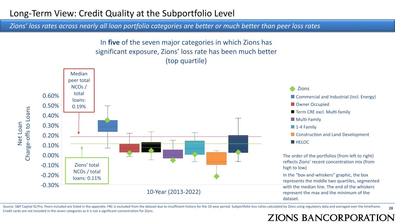 “We continued to evidence very good credit quality during the quarter, with no net charge-offs and continued strong credit metrics. Both regulatory and economic capital also remained durable during the quarter, reflecting in part the increased value of a solid base of smaller core operating deposit accounts whose value has increased even as the value of fixed-rate earning assets has diminished in a period of higher interest rates. With growing attention on commercial real estate, or CRE, portfolios, we would note that we’ve carefully managed the growth in this portfolio for a number of years. Over the past decade, our CRE portfolio has grown at a compounded annual rate of only 2.5%, and a mere 0.1% of the portfolio is currently in nonperforming status.”