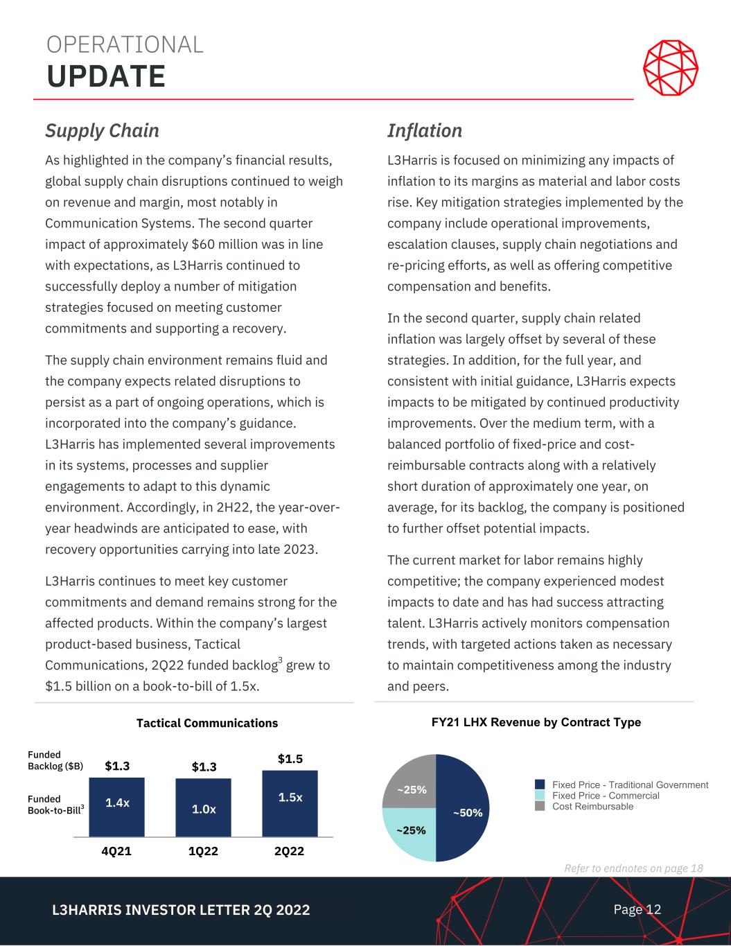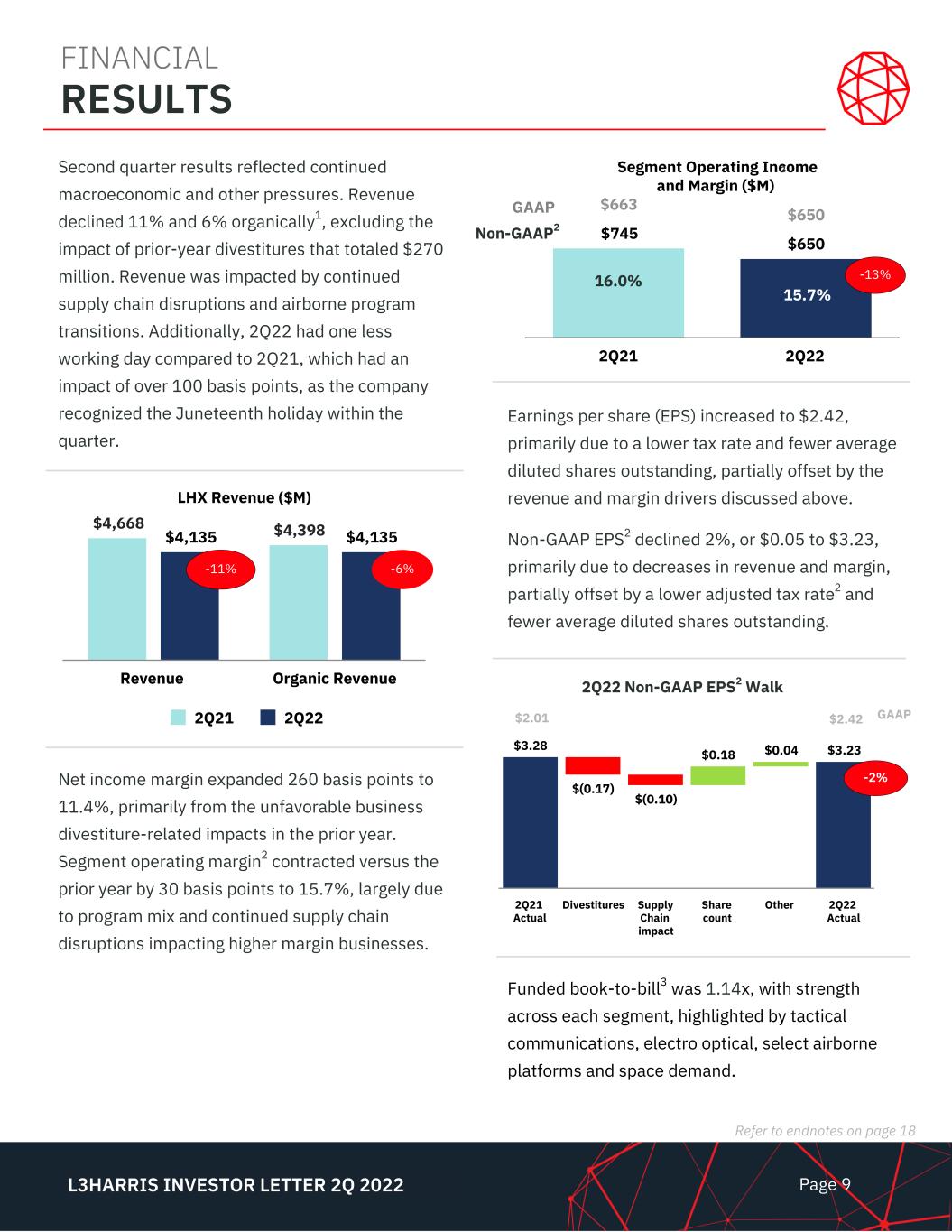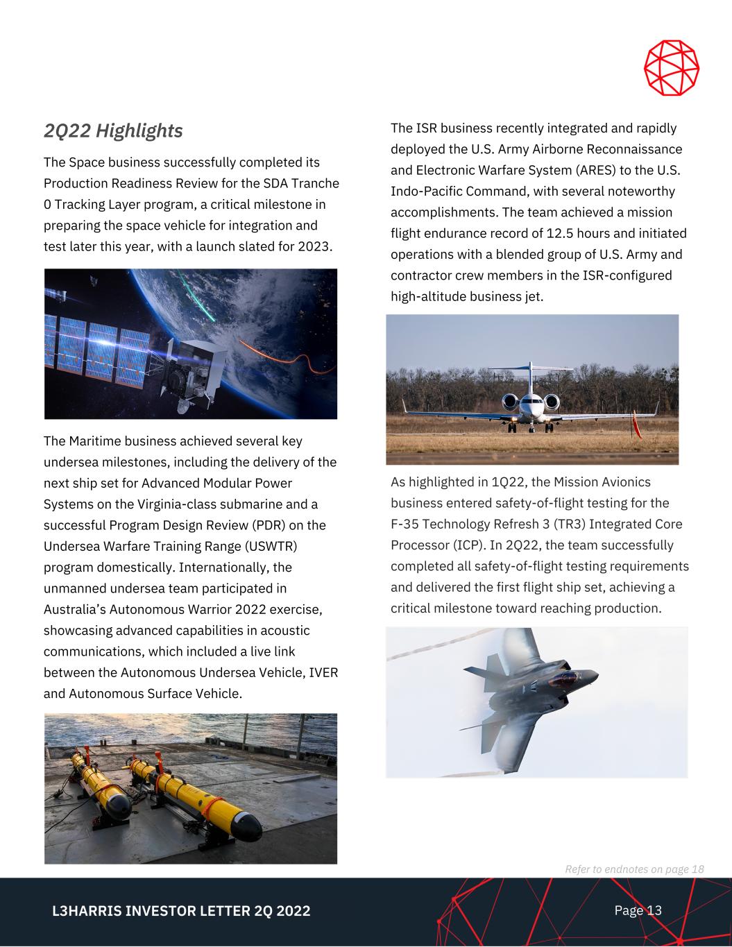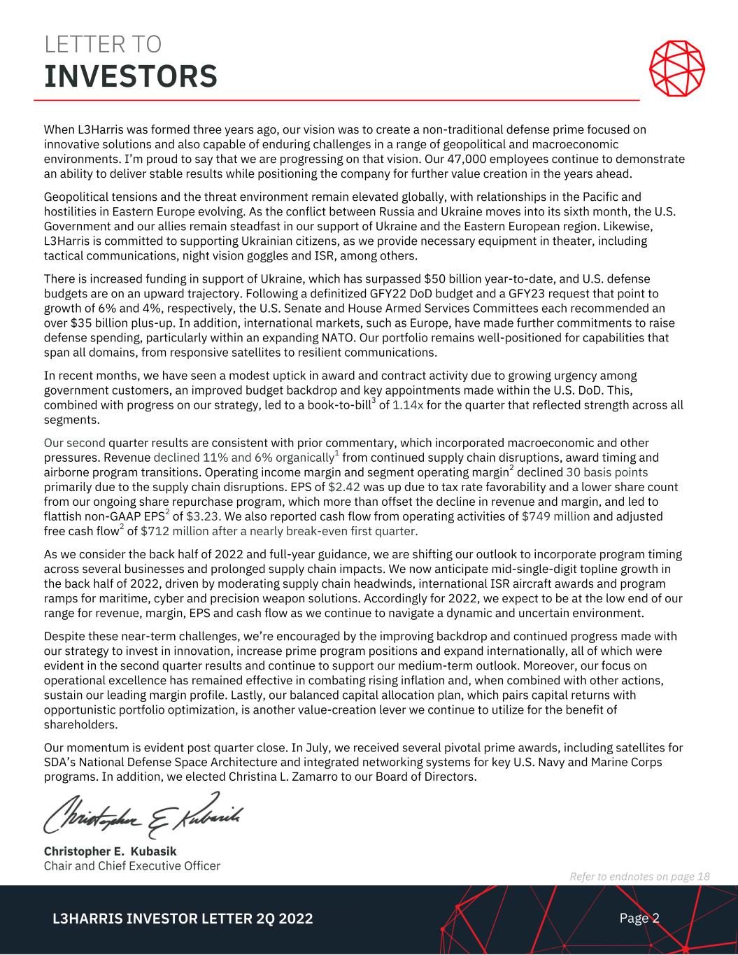 L3HARRIS INVESTOR LETTER 2Q 2022 Refer to endnotes on page 18 Page 2 When L3Harris was formed three years ago, our vision was to create a non-traditional defense prime focused on innovative solutions and also capable of enduring challenges in a range of geopolitical and macroeconomic environments. I’m proud to say that we are progressing on that vision. Our 47,000 employees continue to demonstrate an ability to deliver stable results while positioning the company for further value creation in the years ahead. Geopolitical tensions and the threat environment remain elevated globally, with relationships in the Pacific and hostilities in Eastern Europe evolving. As the conflict between Russia and Ukraine moves into its sixth month, the U.S. Government and our allies remain steadfast in our support of Ukraine and the Eastern European region. Likewise, L3Harris is committed to supporting Ukrainian citizens, as we provide necessary equipment in theater, including tactical communications, night vision goggles and ISR, among others. There is increased funding in support of Ukraine, which has surpassed $50 billion year-to-date, and U.S. defense budgets are on an upward trajectory. Following a definitized GFY22 DoD budget and a GFY23 request that point to growth of 6% and 4%, respectively, the U.S. Senate and House Armed Services Committees each recommended an over $35 billion plus-up. In addition, international markets, such as Europe, have made further commitments to raise defense spending, particularly within an expanding NATO. Our portfolio remains well-positioned for capabilities that span all domains, from responsive satellites to resilient communications. In recent months, we have seen a modest uptick in award and contract activity due to growing urgency among government customers, an improved budget backdrop and key appointments made within the U.S. DoD. This, combined with progress on our strategy, led to a book-to-bill3 of 1.14x for the quarter that reflected strength across all segments. Our second quarter results are consistent with prior commentary, which incorporated macroeconomic and other pressures. Revenue declined 11% and 6% organically1 from continued supply chain disruptions, award timing and airborne program transitions. Operating income margin and segment operating margin2 declined 30 basis points primarily due to the supply chain disruptions. EPS of $2.42 was up due to tax rate favorability and a lower share count from our ongoing share repurchase program, which more than offset the decline in revenue and margin, and led to flattish non-GAAP EPS2 of $3.23. We also reported cash flow from operating activities of $749 million and adjusted free cash flow2 of $712 million after a nearly break-even first quarter. As we consider the back half of 2022 and full-year guidance, we are shifting our outlook to incorporate program timing across several businesses and prolonged supply chain impacts. We now anticipate mid-single-digit topline growth in the back half of 2022, driven by moderating supply chain headwinds, international ISR aircraft awards and program ramps for maritime, cyber and precision weapon solutions. Accordingly for 2022, we expect to be at the low end of our range for revenue, margin, EPS and cash flow as we continue to navigate a dynamic and uncertain environment. Despite these near-term challenges, we’re encouraged by the improving backdrop and continued progress made with our strategy to invest in innovation, increase prime program positions and expand internationally, all of which were evident in the second quarter results and continue to support our medium-term outlook. Moreover, our focus on operational excellence has remained effective in combating rising inflation and, when combined with other actions, sustain our leading margin profile. Lastly, our balanced capital allocation plan, which pairs capital returns with opportunistic portfolio optimization, is another value-creation lever we continue to utilize for the benefit of shareholders. Our momentum is evident post quarter close. In July, we received several pivotal prime awards, including satellites for SDA’s National Defense Space Architecture and integrated networking systems for key U.S. Navy and Marine Corps programs. In addition, we elected Christina L. Zamarro to our Board of Directors. Christopher E. Kubasik Chair and Chief Executive Officer LETTER TO INVESTORS
