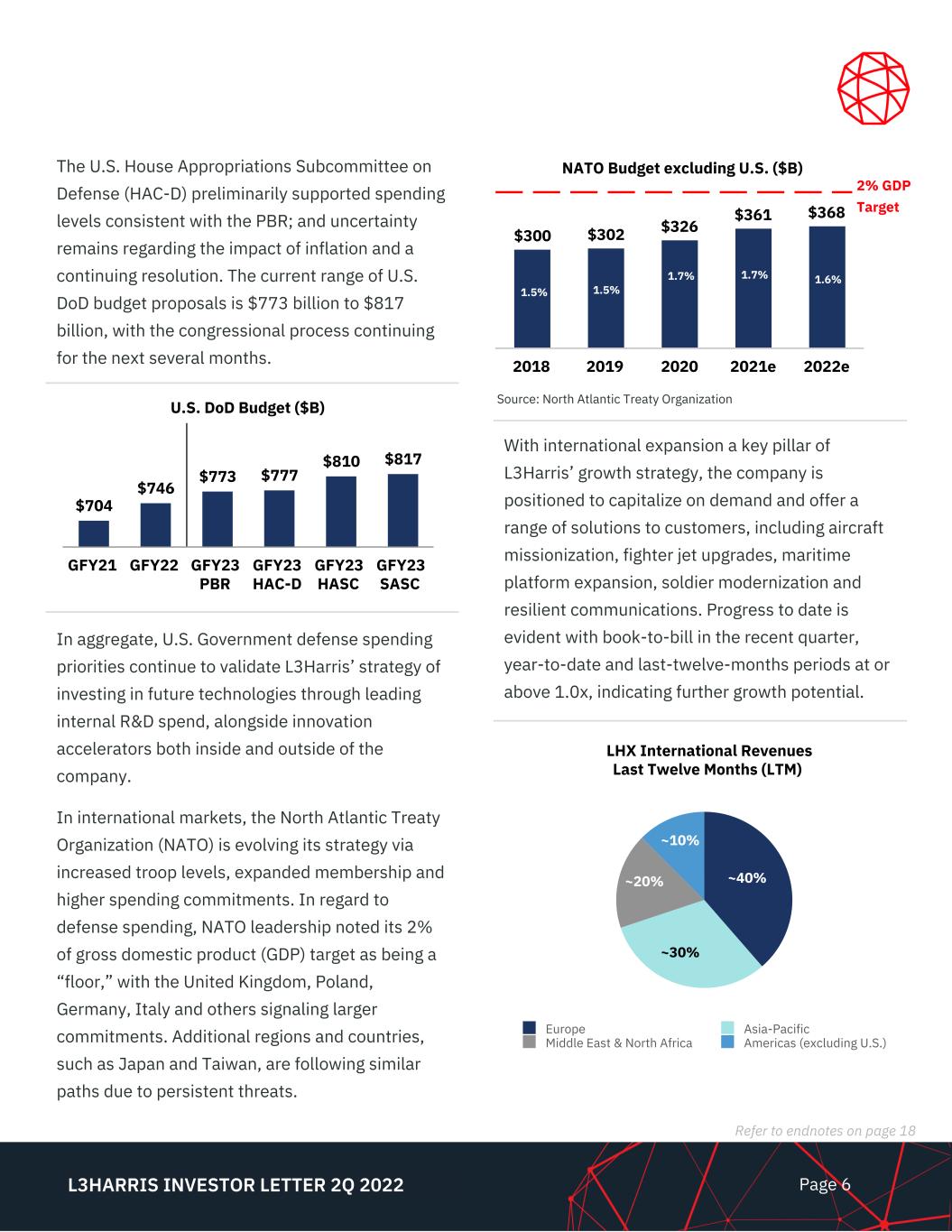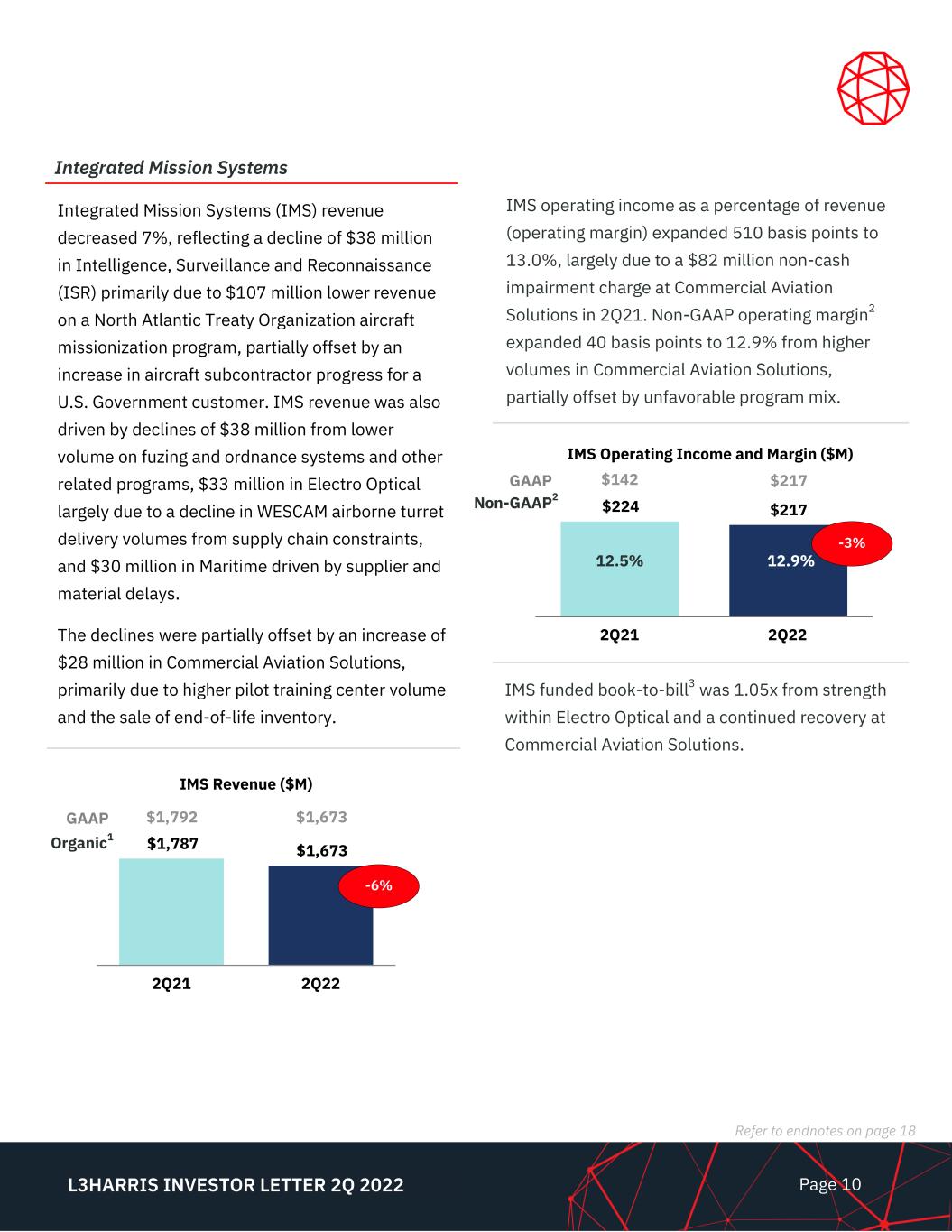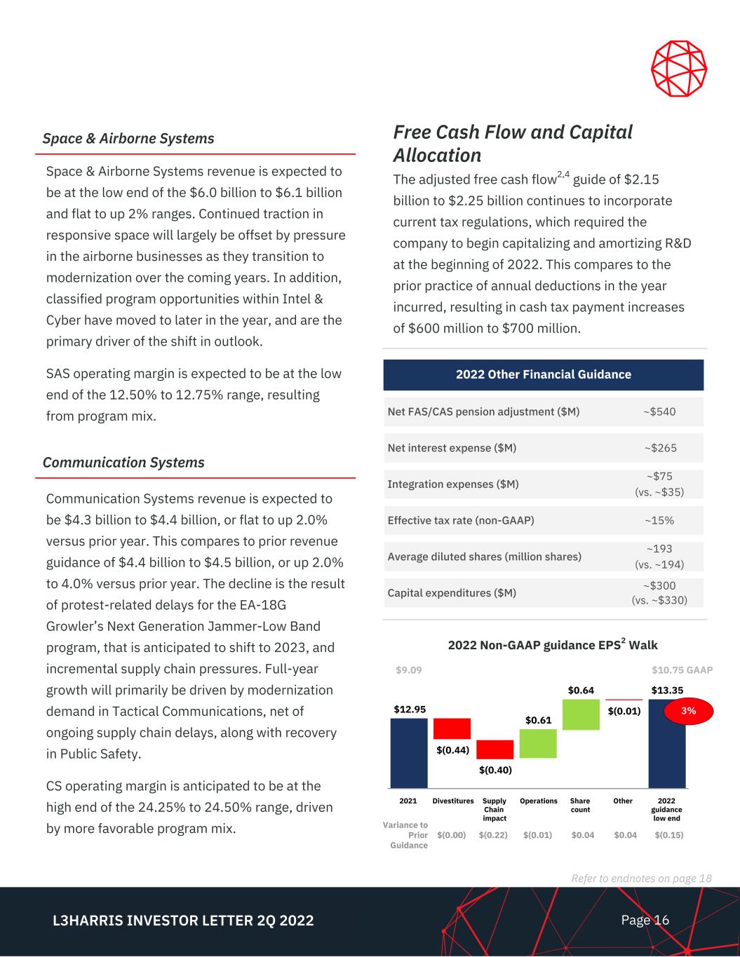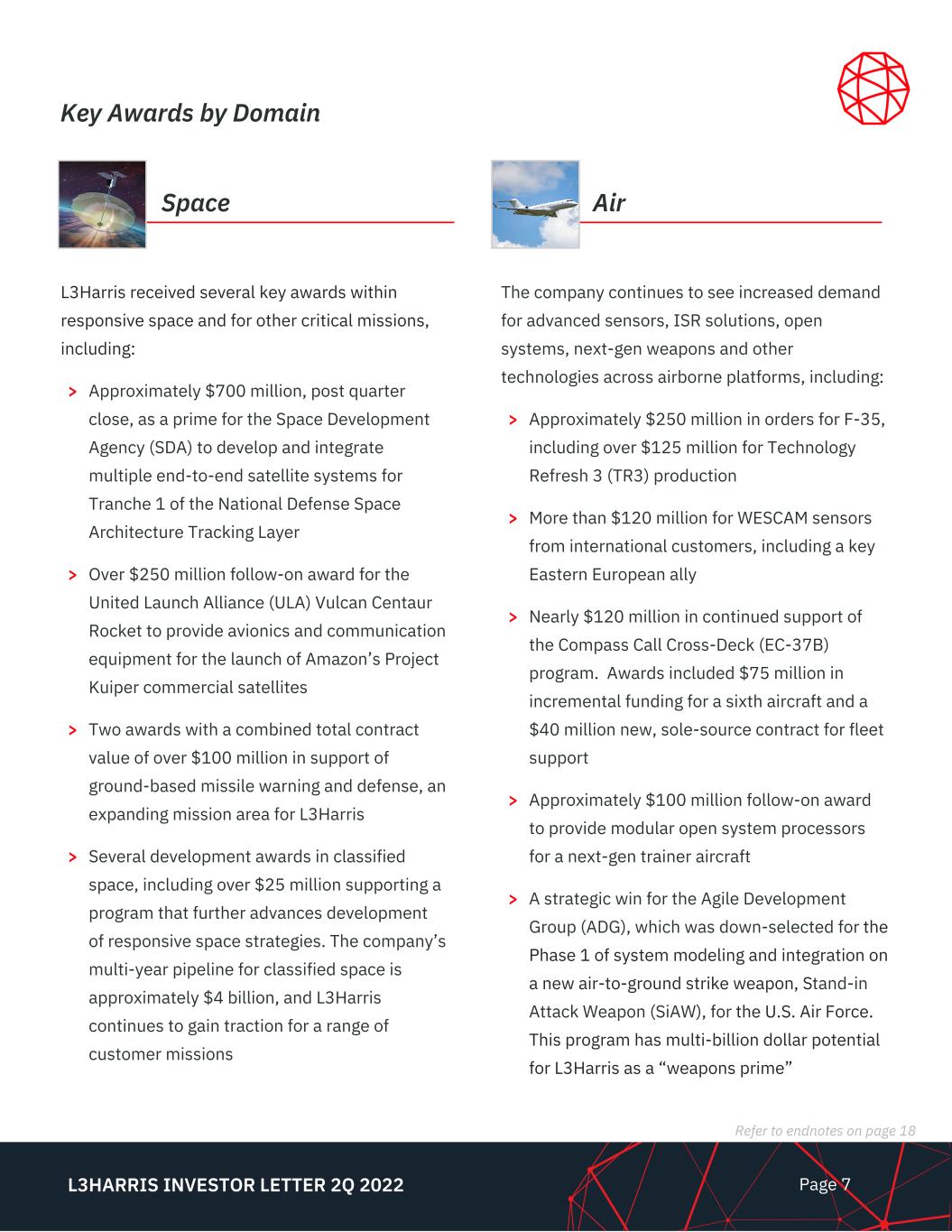 L3HARRIS INVESTOR LETTER 2Q 2022 Refer to endnotes on page 18 Page 2 When L3Harris was formed three years ago, our vision was to create a non-traditional defense prime focused on innovative solutions and also capable of enduring challenges in a range of geopolitical and macroeconomic environments. I’m proud to say that we are progressing on that vision. Our 47,000 employees continue to demonstrate an ability to deliver stable results while positioning the company for further value creation in the years ahead. Geopolitical tensions and the threat environment remain elevated globally, with relationships in the Pacific and hostilities in Eastern Europe evolving. As the conflict between Russia and Ukraine moves into its sixth month, the U.S. Government and our allies remain steadfast in our support of Ukraine and the Eastern European region. Likewise, L3Harris is committed to supporting Ukrainian citizens, as we provide necessary equipment in theater, including tactical communications, night vision goggles and ISR, among others. There is increased funding in support of Ukraine, which has surpassed $50 billion year-to-date, and U.S. defense budgets are on an upward trajectory. Following a definitized GFY22 DoD budget and a GFY23 request that point to growth of 6% and 4%, respectively, the U.S. Senate and House Armed Services Committees each recommended an over $35 billion plus-up. In addition, international markets, such as Europe, have made further commitments to raise defense spending, particularly within an expanding NATO. Our portfolio remains well-positioned for capabilities that span all domains, from responsive satellites to resilient communications. In recent months, we have seen a modest uptick in award and contract activity due to growing urgency among government customers, an improved budget backdrop and key appointments made within the U.S. DoD. This, combined with progress on our strategy, led to a book-to-bill3 of 1.14x for the quarter that reflected strength across all segments. Our second quarter results are consistent with prior commentary, which incorporated macroeconomic and other pressures. Revenue declined 11% and 6% organically1 from continued supply chain disruptions, award timing and airborne program transitions. Operating income margin and segment operating margin2 declined 30 basis points primarily due to the supply chain disruptions. EPS of $2.42 was up due to tax rate favorability and a lower share count from our ongoing share repurchase program, which more than offset the decline in revenue and margin, and led to flattish non-GAAP EPS2 of $3.23. We also reported cash flow from operating activities of $749 million and adjusted free cash flow2 of $712 million after a nearly break-even first quarter. As we consider the back half of 2022 and full-year guidance, we are shifting our outlook to incorporate program timing across several businesses and prolonged supply chain impacts. We now anticipate mid-single-digit topline growth in the back half of 2022, driven by moderating supply chain headwinds, international ISR aircraft awards and program ramps for maritime, cyber and precision weapon solutions. Accordingly for 2022, we expect to be at the low end of our range for revenue, margin, EPS and cash flow as we continue to navigate a dynamic and uncertain environment. Despite these near-term challenges, we’re encouraged by the improving backdrop and continued progress made with our strategy to invest in innovation, increase prime program positions and expand internationally, all of which were evident in the second quarter results and continue to support our medium-term outlook. Moreover, our focus on operational excellence has remained effective in combating rising inflation and, when combined with other actions, sustain our leading margin profile. Lastly, our balanced capital allocation plan, which pairs capital returns with opportunistic portfolio optimization, is another value-creation lever we continue to utilize for the benefit of shareholders. Our momentum is evident post quarter close. In July, we received several pivotal prime awards, including satellites for SDA’s National Defense Space Architecture and integrated networking systems for key U.S. Navy and Marine Corps programs. In addition, we elected Christina L. Zamarro to our Board of Directors. Christopher E. Kubasik Chair and Chief Executive Officer LETTER TO INVESTORS