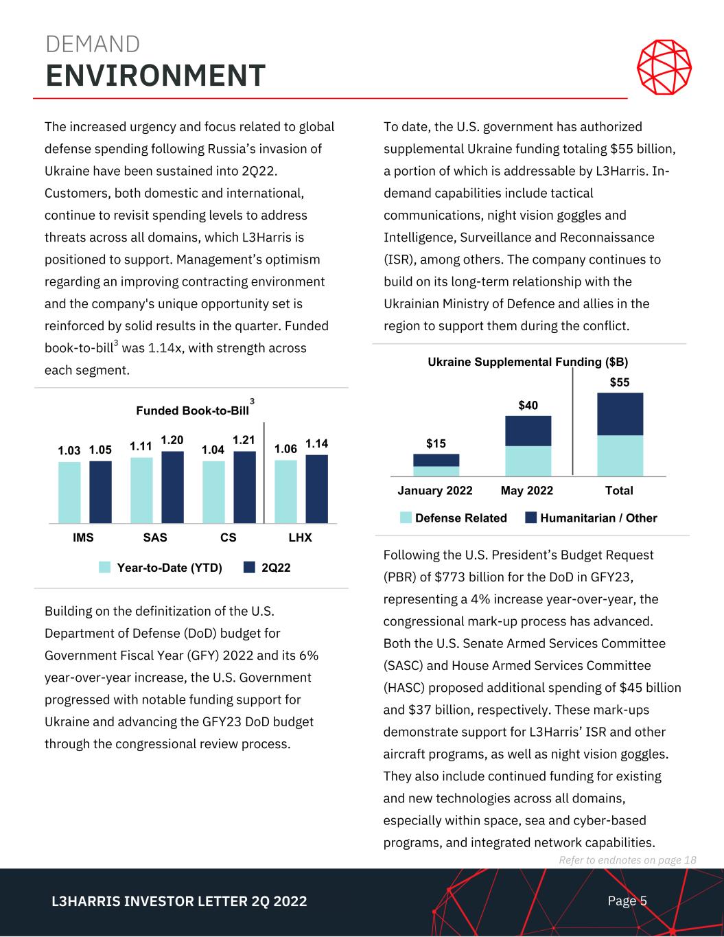 Page 4 Refer to endnotes on page 18 L3HARRIS INVESTOR LETTER 2Q 2022 Free Cash Flow $685 $712 2Q21 2Q22 2022 Guidance (Low End) Revenue $17.3B - $17.7B Organic revenue growth1 up 1.0% - 3.0% Net income margin 12.00% - 12.25% Segment operating margin2 16.00% - 16.25% GAAP EPS $10.75 - $11.05 Non-GAAP EPS2 $13.35 - $13.65 Operating cash flow4 $2.4B - $2.5B Adjusted free cash flow2,4 $2.15B - $2.25B (Reflects $600M - $700M R&D capitalization impact) Orders and revenue > Funded book-to-bill3 of 1.14x > Revenue of $4.1 billion, down 11% versus prior year and down 6% on an organic1 basis Margin and earnings > Net income margin of 11.4% and earnings per share from continuing operations (EPS) of $2.42 > Segment operating margin2 of 15.7% and non-GAAP EPS2 of $3.23 Cash flow and capital deployment > Operating cash flow of $749 million and adjusted free cash flow2 of $712 million > Returned $638 million to shareholders in dividends and share repurchases 2022 guidance > 2H22 revenue growth of mid-single-digits; full-year outlook at low end of 1% to 3% range > Full-year margin, EPS and cash flow also at low end of range EPS $3.28 $3.23 2Q21 2Q22 -2% Revenue $4,398 $4,135 2Q21 2Q22 4% -6% Segment Operating Income and Margin $745 $650 2Q21 2Q22 -13% 16.0% 15.7% $4,668GAAP $4,135 Organic1 $2.01 $2.42 GAAP Non-GAAP2 Operating cash flow4 $720 $749 Adjusted free cash flow2,4 ($M, except per share amounts) 2 2Q22 SUMMARY 2Q22 Financials $561 $484GAAP Non-GAAP2