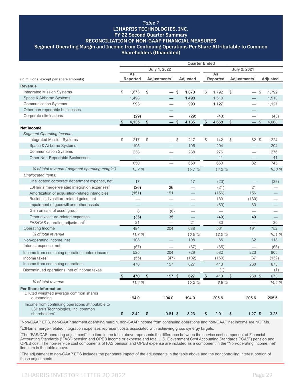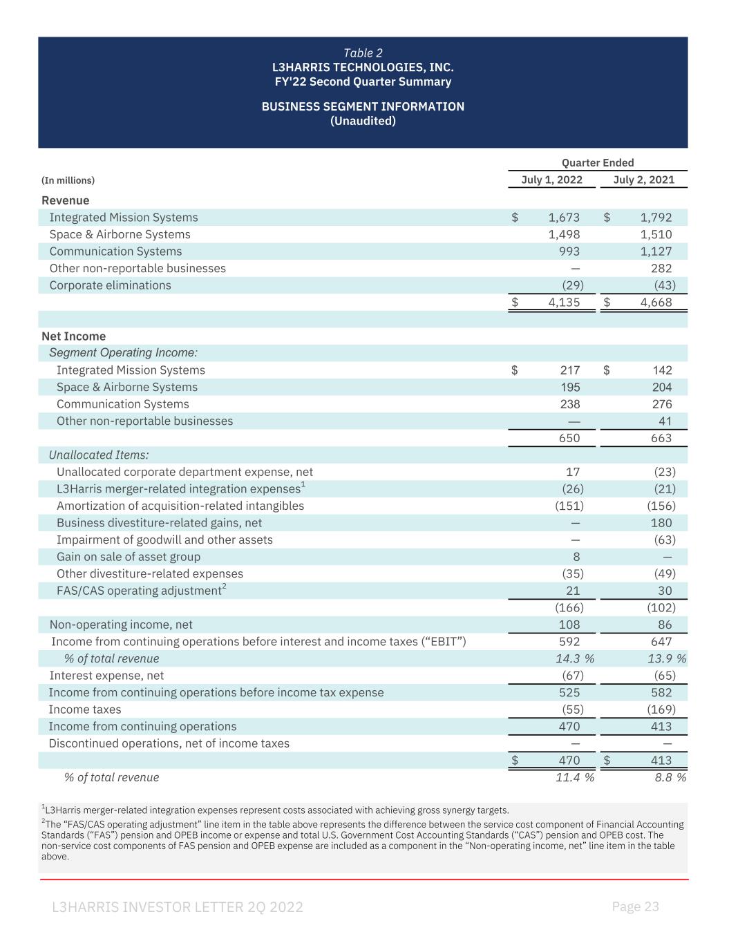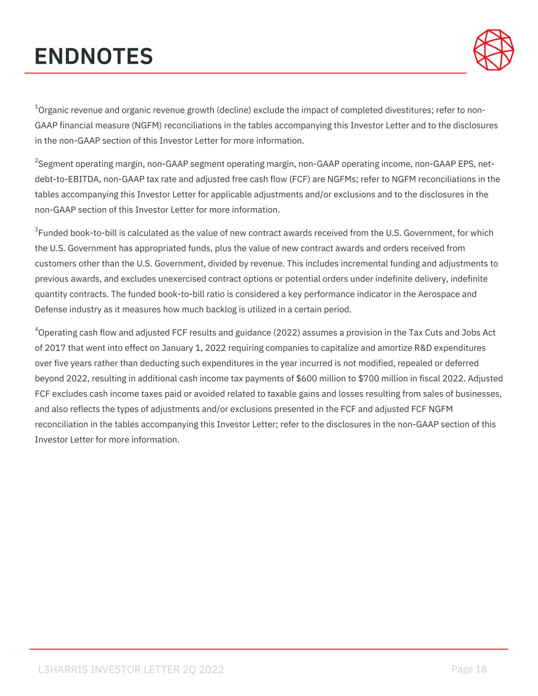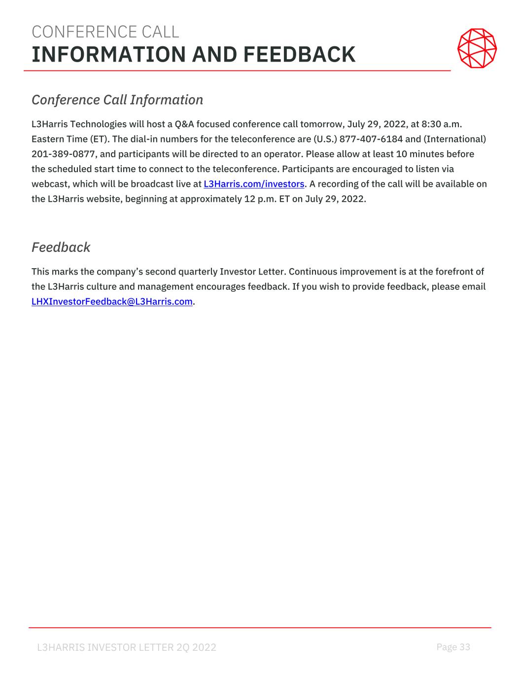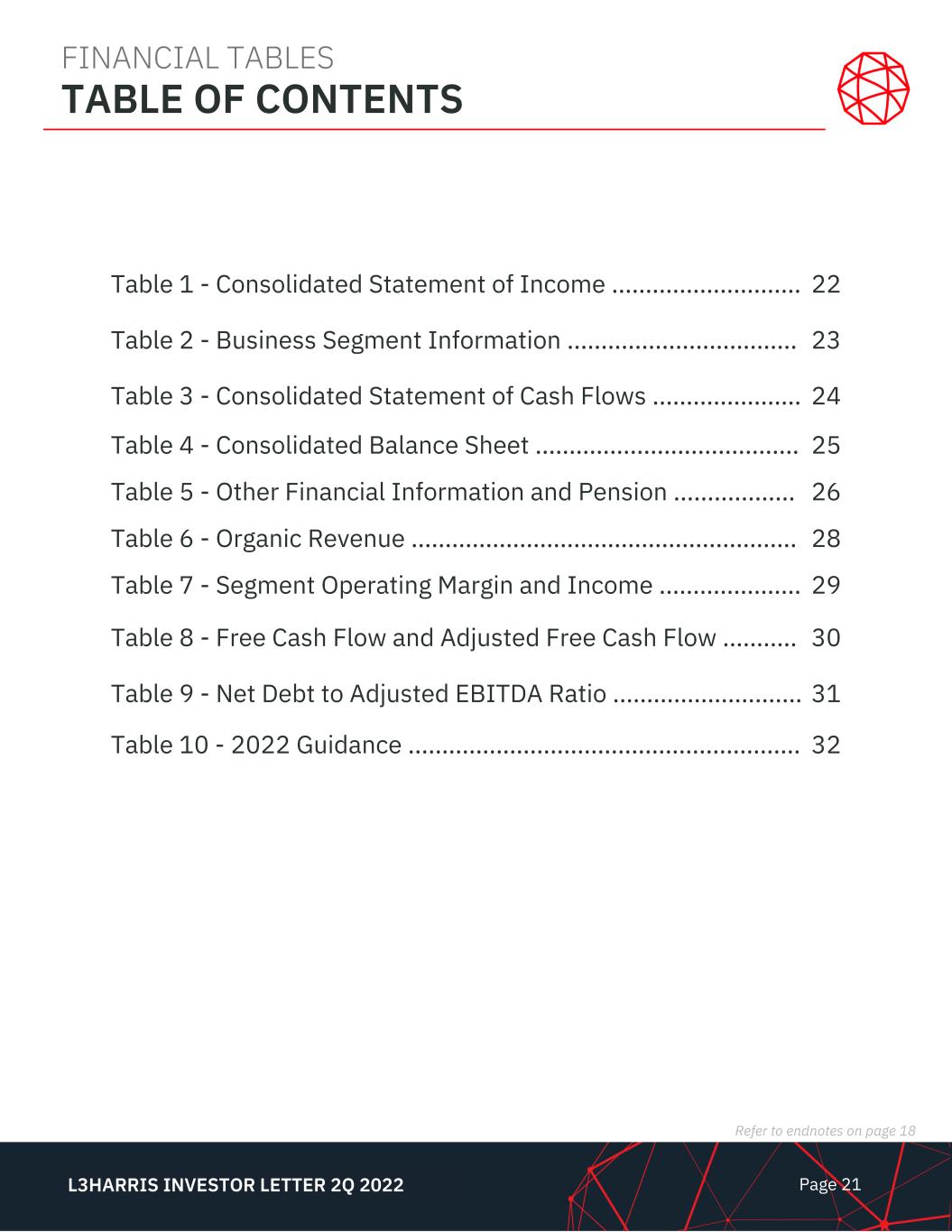 L3HARRIS INVESTOR LETTER 2Q 2022 Refer to endnotes on page 18 Page 3 2Q22 Summary ........................................................ 4 Demand Environment ............................................... 5 Financial Results ...................................................... 9 Operational Update .................................................. 12 Capital Allocation ...................................................... 14 Financial Guidance ................................................... 15 ESG Highlights........................................................... 17 Endnotes ................................................................... 18 Non-GAAP Financial Measures ................................ 19 Forward-Looking Statements ................................... 20 Financial Tables ........................................................ 21 Reconciliation of Non-GAAP Financial Measures .... 27 Conference Call Information and Feedback............. 33 TABLE OF CONTENTS