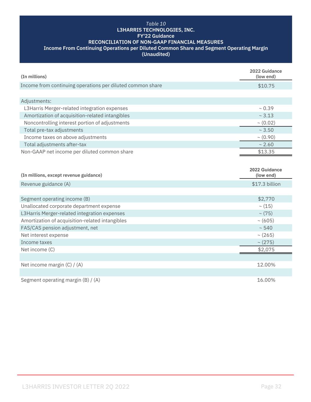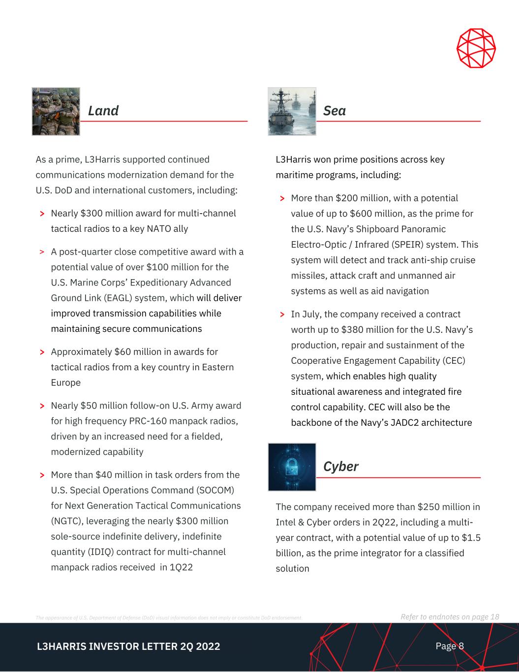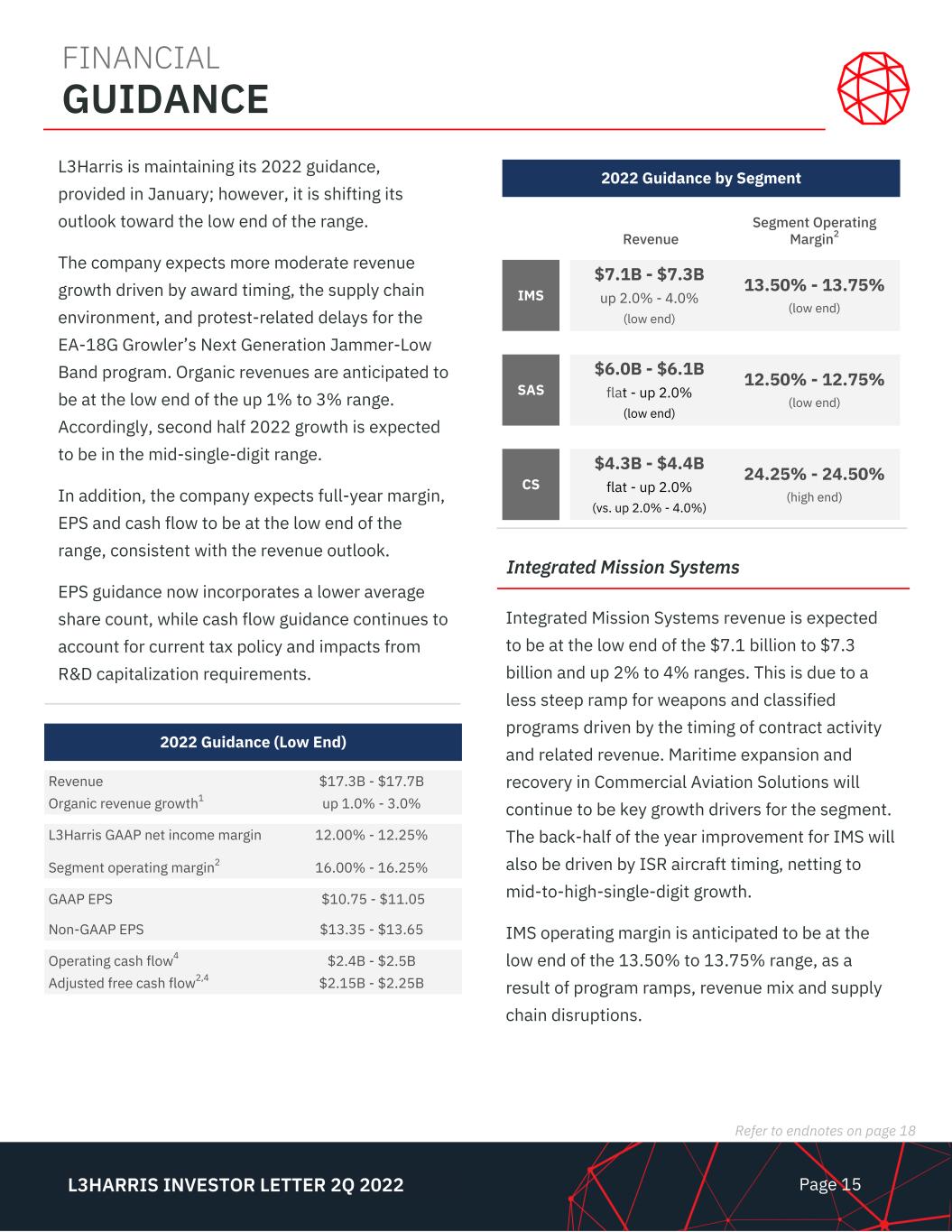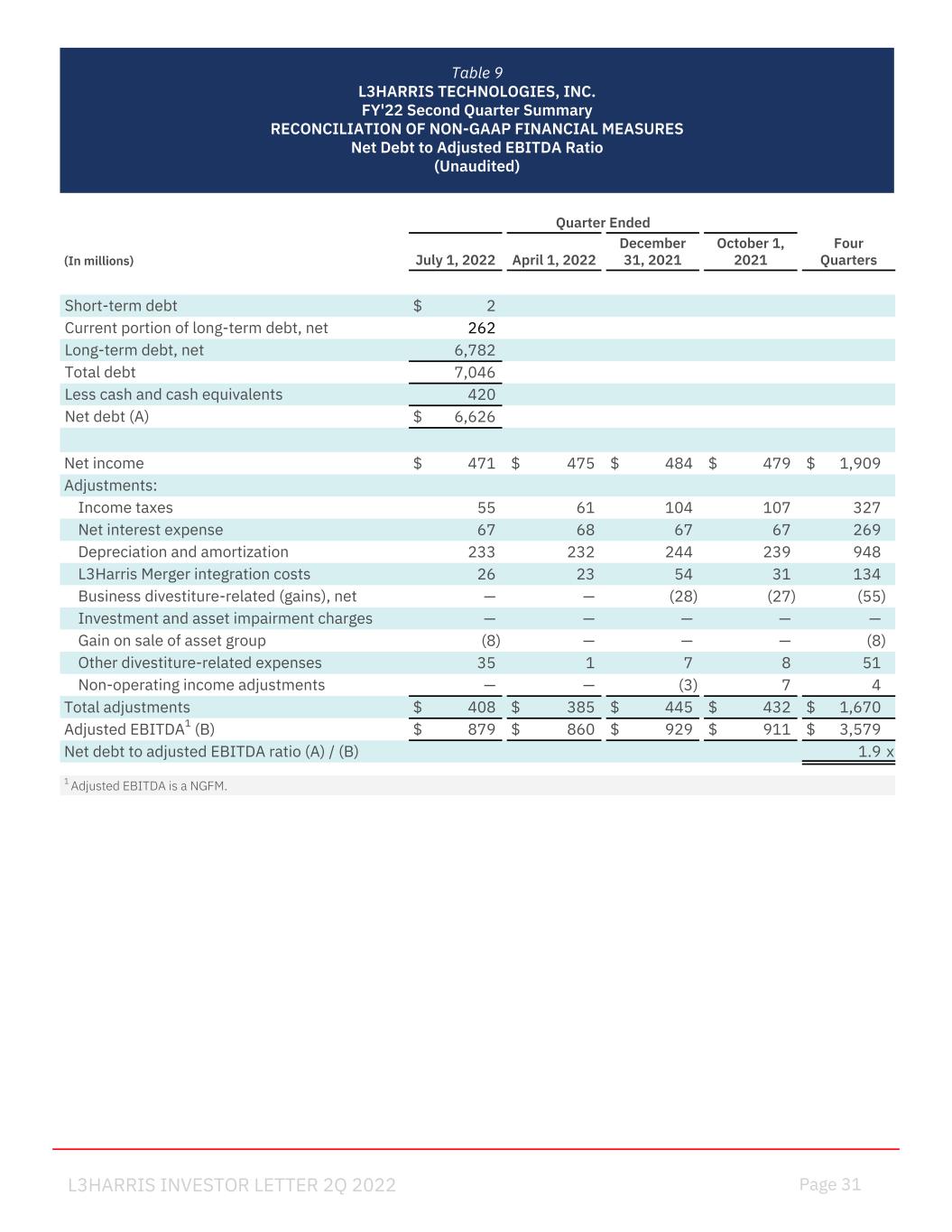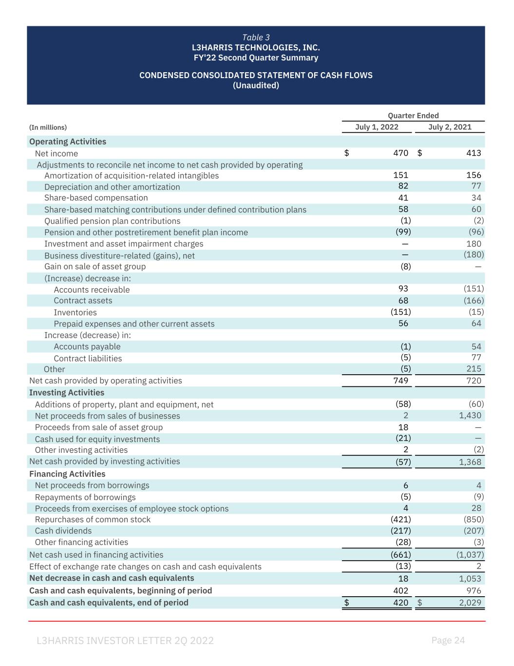 L3HARRIS INVESTOR LETTER 2Q 2022 Refer to endnotes on page 18 Page 3 2Q22 Summary ........................................................ 4 Demand Environment ............................................... 5 Financial Results ...................................................... 9 Operational Update .................................................. 12 Capital Allocation ...................................................... 14 Financial Guidance ................................................... 15 ESG Highlights........................................................... 17 Endnotes ................................................................... 18 Non-GAAP Financial Measures ................................ 19 Forward-Looking Statements ................................... 20 Financial Tables ........................................................ 21 Reconciliation of Non-GAAP Financial Measures .... 27 Conference Call Information and Feedback............. 33 TABLE OF CONTENTS