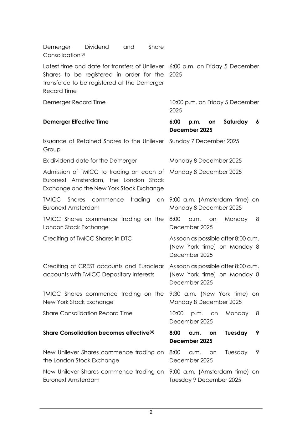 2 Demerger Dividend and Share Consolidation(3) Latest time and date for transfers of Unilever Shares to be registered in order for the transferee to be registered at the Demerger Record Time 6:00 p.m. on Friday 5 December 2025 Demerger Record Time 10:00 p.m. on Friday 5 December 2025 Demerger Effective Time 6:00 p.m. on Saturday 6 December 2025 Issuance of Retained Shares to the Unilever Group Sunday 7 December 2025 Ex dividend date for the Demerger Monday 8 December 2025 Admission of TMICC to trading on each of Euronext Amsterdam, the London Stock Exchange and the New York Stock Exchange Monday 8 December 2025 TMICC Shares commence trading on Euronext Amsterdam 9:00 a.m. (Amsterdam time) on Monday 8 December 2025 TMICC Shares commence trading on the London Stock Exchange 8:00 a.m. on Monday 8 December 2025 Crediting of TMICC Shares in DTC As soon as possible after 8:00 a.m. (New York time) on Monday 8 December 2025 Crediting of CREST accounts and Euroclear accounts with TMICC Depositary Interests As soon as possible after 8:00 a.m. (New York time) on Monday 8 December 2025 TMICC Shares commence trading on the New York Stock Exchange 9:30 a.m. (New York time) on Monday 8 December 2025 Share Consolidation Record Time 10:00 p.m. on Monday 8 December 2025 Share Consolidation becomes effective(4) 8:00 a.m. on Tuesday 9 December 2025 New Unilever Shares commence trading on the London Stock Exchange 8:00 a.m. on Tuesday 9 December 2025 New Unilever Shares commence trading on Euronext Amsterdam 9:00 a.m. (Amsterdam time) on Tuesday 9 December 2025