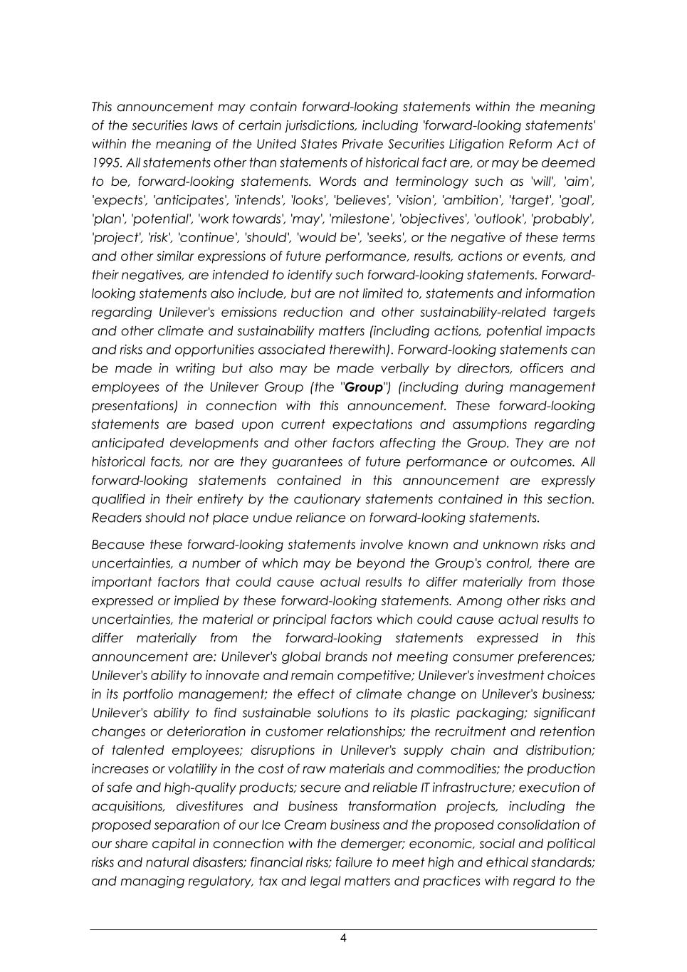 5 interpretation and application thereof and emerging and developing ESG reporting standards including differences in implementation of climate and sustainability policies in the regions where the Group operates. The forward-looking statements are based on our beliefs, assumptions and expectations of our future performance, taking into account all information currently available to us. Forward-looking statements are not predictions of future events. These beliefs, assumptions and expectations can change as a result of many possible events or factors, not all of which are known to us. If a change occurs, our business, financial condition, liquidity and results of operations may vary materially from those expressed in our forward-looking statements. The forward-looking statements speak only as of the date of this announcement. Except as required by any applicable law or regulation, the Group expressly disclaims any intention, obligation or undertaking to release publicly any updates or revisions to any forward-looking statements contained herein to reflect any change in the Group's expectations with regard thereto or any change in events, conditions or circumstances on which any such statement is based. New risks and uncertainties arise over time, and it is not possible for us to predict those events or how they may affect us. In addition, we cannot assess the impact of each factor on our business or the extent to which any factor, or combination of factors, may cause actual events, to differ materially from those contained in any forward- looking statements. Further details of potential risks and uncertainties affecting the Group are described in the Group's filings with the London Stock Exchange, Euronext Amsterdam and the US Securities and Exchange Commission, including in the Annual Report on Form 20-F 2024 and the Unilever Annual Report and Accounts 2024.