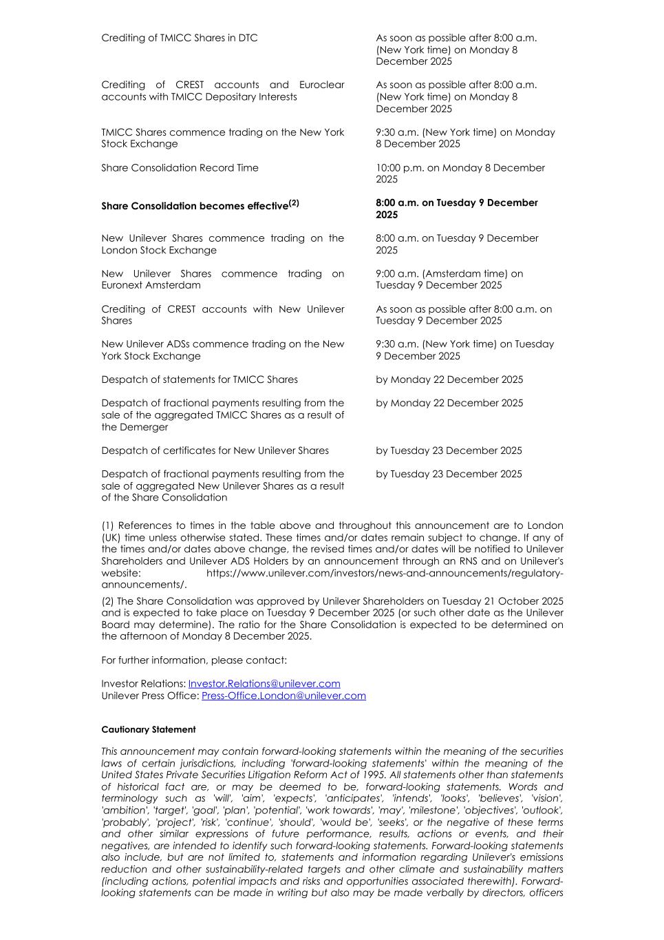 Crediting of TMICC Shares in DTC As soon as possible after 8:00 a.m. (New York time) on Monday 8 December 2025 Crediting of CREST accounts and Euroclear accounts with TMICC Depositary Interests As soon as possible after 8:00 a.m. (New York time) on Monday 8 December 2025 TMICC Shares commence trading on the New York Stock Exchange 9:30 a.m. (New York time) on Monday 8 December 2025 Share Consolidation Record Time 10:00 p.m. on Monday 8 December 2025 Share Consolidation becomes effective(2) 8:00 a.m. on Tuesday 9 December 2025 New Unilever Shares commence trading on the London Stock Exchange 8:00 a.m. on Tuesday 9 December 2025 New Unilever Shares commence trading on Euronext Amsterdam 9:00 a.m. (Amsterdam time) on Tuesday 9 December 2025 Crediting of CREST accounts with New Unilever Shares As soon as possible after 8:00 a.m. on Tuesday 9 December 2025 New Unilever ADSs commence trading on the New York Stock Exchange 9:30 a.m. (New York time) on Tuesday 9 December 2025 Despatch of statements for TMICC Shares by Monday 22 December 2025 Despatch of fractional payments resulting from the sale of the aggregated TMICC Shares as a result of the Demerger by Monday 22 December 2025 Despatch of certificates for New Unilever Shares by Tuesday 23 December 2025 Despatch of fractional payments resulting from the sale of aggregated New Unilever Shares as a result of the Share Consolidation by Tuesday 23 December 2025 (1) References to times in the table above and throughout this announcement are to London (UK) time unless otherwise stated. These times and/or dates remain subject to change. If any of the times and/or dates above change, the revised times and/or dates will be notified to Unilever Shareholders and Unilever ADS Holders by an announcement through an RNS and on Unilever's website: https://www.unilever.com/investors/news-and-announcements/regulatory- announcements/. (2) The Share Consolidation was approved by Unilever Shareholders on Tuesday 21 October 2025 and is expected to take place on Tuesday 9 December 2025 (or such other date as the Unilever Board may determine). The ratio for the Share Consolidation is expected to be determined on the afternoon of Monday 8 December 2025. For further information, please contact: Investor Relations: Investor.Relations@unilever.com Unilever Press Office: Press-Office.London@unilever.com Cautionary Statement This announcement may contain forward-looking statements within the meaning of the securities laws of certain jurisdictions, including 'forward-looking statements' within the meaning of the United States Private Securities Litigation Reform Act of 1995. All statements other than statements of historical fact are, or may be deemed to be, forward-looking statements. Words and terminology such as 'will', 'aim', 'expects', 'anticipates', 'intends', 'looks', 'believes', 'vision', 'ambition', 'target', 'goal', 'plan', 'potential', 'work towards', 'may', 'milestone', 'objectives', 'outlook', 'probably', 'project', 'risk', 'continue', 'should', 'would be', 'seeks', or the negative of these terms and other similar expressions of future performance, results, actions or events, and their negatives, are intended to identify such forward-looking statements. Forward-looking statements also include, but are not limited to, statements and information regarding Unilever's emissions reduction and other sustainability-related targets and other climate and sustainability matters (including actions, potential impacts and risks and opportunities associated therewith). Forward- looking statements can be made in writing but also may be made verbally by directors, officers